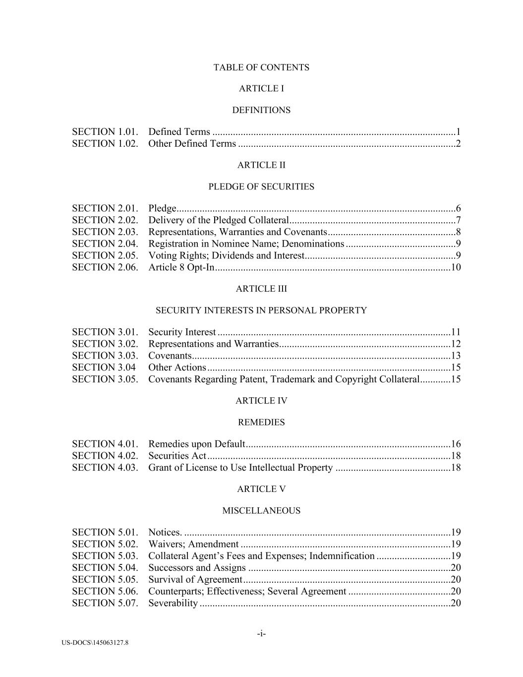 -i- US-DOCS\145063127.8 TABLE OF CONTENTS ARTICLE I DEFINITIONS SECTION 1.01. Defined Terms ...............................................................................................1 SECTION 1.02. Other Defined Terms .....................................................................................2 ARTICLE II PLEDGE OF SECURITIES SECTION 2.01. Pledge.............................................................................................................6 SECTION 2.02. Delivery of the Pledged Collateral.................................................................7 SECTION 2.03. Representations, Warranties and Covenants..................................................8 SECTION 2.04. Registration in Nominee Name; Denominations ...........................................9 SECTION 2.05. Voting Rights; Dividends and Interest...........................................................9 SECTION 2.06. Article 8 Opt-In............................................................................................10 ARTICLE III SECURITY INTERESTS IN PERSONAL PROPERTY SECTION 3.01. Security Interest ...........................................................................................11 SECTION 3.02. Representations and Warranties...................................................................12 SECTION 3.03. Covenants.....................................................................................................13 SECTION 3.04 Other Actions...............................................................................................15 SECTION 3.05. Covenants Regarding Patent, Trademark and Copyright Collateral............15 ARTICLE IV REMEDIES SECTION 4.01. Remedies upon Default................................................................................16 SECTION 4.02. Securities Act ...............................................................................................18 SECTION 4.03. Grant of License to Use Intellectual Property .............................................18 ARTICLE V MISCELLANEOUS SECTION 5.01. Notices. ........................................................................................................19 SECTION 5.02. Waivers; Amendment ..................................................................................19 SECTION 5.03. Collateral Agent’s Fees and Expenses; Indemnification .............................19 SECTION 5.04. Successors and Assigns ...............................................................................20 SECTION 5.05. Survival of Agreement.................................................................................20 SECTION 5.06. Counterparts; Effectiveness; Several Agreement ........................................20 SECTION 5.07. Severability ..................................................................................................20