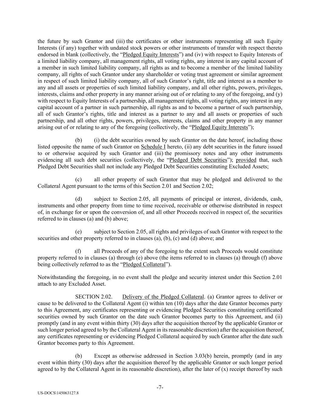-7- US-DOCS\145063127.8 the future by such Grantor and (iii) the certificates or other instruments representing all such Equity Interests (if any) together with undated stock powers or other instruments of transfer with respect thereto endorsed in blank (collectively, the “Pledged Equity Interests”) and (iv) with respect to Equity Interests of a limited liability company, all management rights, all voting rights, any interest in any capital account of a member in such limited liability company, all rights as and to become a member of the limited liability company, all rights of such Grantor under any shareholder or voting trust agreement or similar agreement in respect of such limited liability company, all of such Grantor’s right, title and interest as a member to any and all assets or properties of such limited liability company, and all other rights, powers, privileges, interests, claims and other property in any manner arising out of or relating to any of the foregoing, and (y) with respect to Equity Interests of a partnership, all management rights, all voting rights, any interest in any capital account of a partner in such partnership, all rights as and to become a partner of such partnership, all of such Grantor’s rights, title and interest as a partner to any and all assets or properties of such partnership, and all other rights, powers, privileges, interests, claims and other property in any manner arising out of or relating to any of the foregoing (collectively, the “Pledged Equity Interests”); (b) (i) the debt securities owned by such Grantor on the date hereof, including those listed opposite the name of such Grantor on Schedule I hereto, (ii) any debt securities in the future issued to or otherwise acquired by such Grantor and (iii) the promissory notes and any other instruments evidencing all such debt securities (collectively, the “Pledged Debt Securities”); provided that, such Pledged Debt Securities shall not include any Pledged Debt Securities constituting Excluded Assets; (c) all other property of such Grantor that may be pledged and delivered to the Collateral Agent pursuant to the terms of this Section 2.01 and Section 2.02; (d) subject to Section 2.05, all payments of principal or interest, dividends, cash, instruments and other property from time to time received, receivable or otherwise distributed in respect of, in exchange for or upon the conversion of, and all other Proceeds received in respect of, the securities referred to in clauses (a) and (b) above; (e) subject to Section 2.05, all rights and privileges of such Grantor with respect to the securities and other property referred to in clauses (a), (b), (c) and (d) above; and (f) all Proceeds of any of the foregoing to the extent such Proceeds would constitute property referred to in clauses (a) through (e) above (the items referred to in clauses (a) through (f) above being collectively referred to as the “Pledged Collateral”). Notwithstanding the foregoing, in no event shall the pledge and security interest under this Section 2.01 attach to any Excluded Asset. SECTION 2.02. Delivery of the Pledged Collateral. (a) Grantor agrees to deliver or cause to be delivered to the Collateral Agent (i) within ten (10) days after the date Grantor becomes party to this Agreement, any certificates representing or evidencing Pledged Securities constituting certificated securities owned by such Grantor on the date such Grantor becomes party to this Agreement, and (ii) promptly (and in any event within thirty (30) days after the acquisition thereof by the applicable Grantor or such longer period agreed to by the Collateral Agent in its reasonable discretion) after the acquisition thereof, any certificates representing or evidencing Pledged Collateral acquired by such Grantor after the date such Grantor becomes party to this Agreement. (b) Except as otherwise addressed in Section 3.03(b) herein, promptly (and in any event within thirty (30) days after the acquisition thereof by the applicable Grantor or such longer period agreed to by the Collateral Agent in its reasonable discretion), after the later of (x) receipt thereof by such