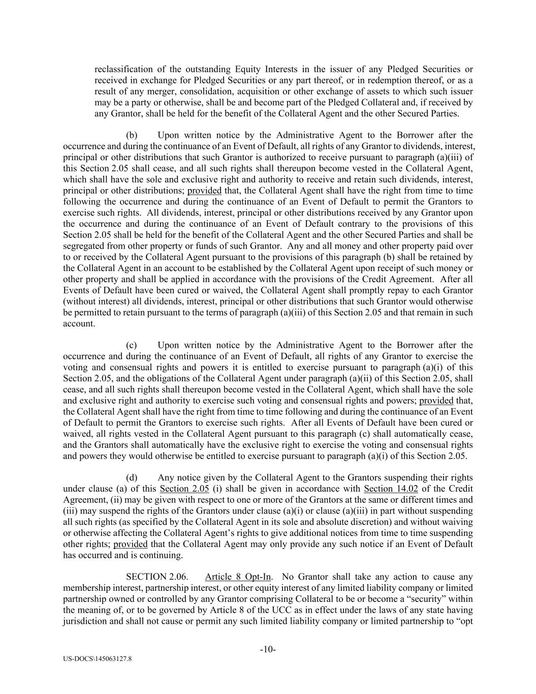 -10- US-DOCS\145063127.8 reclassification of the outstanding Equity Interests in the issuer of any Pledged Securities or received in exchange for Pledged Securities or any part thereof, or in redemption thereof, or as a result of any merger, consolidation, acquisition or other exchange of assets to which such issuer may be a party or otherwise, shall be and become part of the Pledged Collateral and, if received by any Grantor, shall be held for the benefit of the Collateral Agent and the other Secured Parties. (b) Upon written notice by the Administrative Agent to the Borrower after the occurrence and during the continuance of an Event of Default, all rights of any Grantor to dividends, interest, principal or other distributions that such Grantor is authorized to receive pursuant to paragraph (a)(iii) of this Section 2.05 shall cease, and all such rights shall thereupon become vested in the Collateral Agent, which shall have the sole and exclusive right and authority to receive and retain such dividends, interest, principal or other distributions; provided that, the Collateral Agent shall have the right from time to time following the occurrence and during the continuance of an Event of Default to permit the Grantors to exercise such rights. All dividends, interest, principal or other distributions received by any Grantor upon the occurrence and during the continuance of an Event of Default contrary to the provisions of this Section 2.05 shall be held for the benefit of the Collateral Agent and the other Secured Parties and shall be segregated from other property or funds of such Grantor. Any and all money and other property paid over to or received by the Collateral Agent pursuant to the provisions of this paragraph (b) shall be retained by the Collateral Agent in an account to be established by the Collateral Agent upon receipt of such money or other property and shall be applied in accordance with the provisions of the Credit Agreement. After all Events of Default have been cured or waived, the Collateral Agent shall promptly repay to each Grantor (without interest) all dividends, interest, principal or other distributions that such Grantor would otherwise be permitted to retain pursuant to the terms of paragraph (a)(iii) of this Section 2.05 and that remain in such account. (c) Upon written notice by the Administrative Agent to the Borrower after the occurrence and during the continuance of an Event of Default, all rights of any Grantor to exercise the voting and consensual rights and powers it is entitled to exercise pursuant to paragraph (a)(i) of this Section 2.05, and the obligations of the Collateral Agent under paragraph (a)(ii) of this Section 2.05, shall cease, and all such rights shall thereupon become vested in the Collateral Agent, which shall have the sole and exclusive right and authority to exercise such voting and consensual rights and powers; provided that, the Collateral Agent shall have the right from time to time following and during the continuance of an Event of Default to permit the Grantors to exercise such rights. After all Events of Default have been cured or waived, all rights vested in the Collateral Agent pursuant to this paragraph (c) shall automatically cease, and the Grantors shall automatically have the exclusive right to exercise the voting and consensual rights and powers they would otherwise be entitled to exercise pursuant to paragraph (a)(i) of this Section 2.05. (d) Any notice given by the Collateral Agent to the Grantors suspending their rights under clause (a) of this Section 2.05 (i) shall be given in accordance with Section 14.02 of the Credit Agreement, (ii) may be given with respect to one or more of the Grantors at the same or different times and (iii) may suspend the rights of the Grantors under clause (a)(i) or clause (a)(iii) in part without suspending all such rights (as specified by the Collateral Agent in its sole and absolute discretion) and without waiving or otherwise affecting the Collateral Agent’s rights to give additional notices from time to time suspending other rights; provided that the Collateral Agent may only provide any such notice if an Event of Default has occurred and is continuing. SECTION 2.06. Article 8 Opt-In. No Grantor shall take any action to cause any membership interest, partnership interest, or other equity interest of any limited liability company or limited partnership owned or controlled by any Grantor comprising Collateral to be or become a “security” within the meaning of, or to be governed by Article 8 of the UCC as in effect under the laws of any state having jurisdiction and shall not cause or permit any such limited liability company or limited partnership to “opt