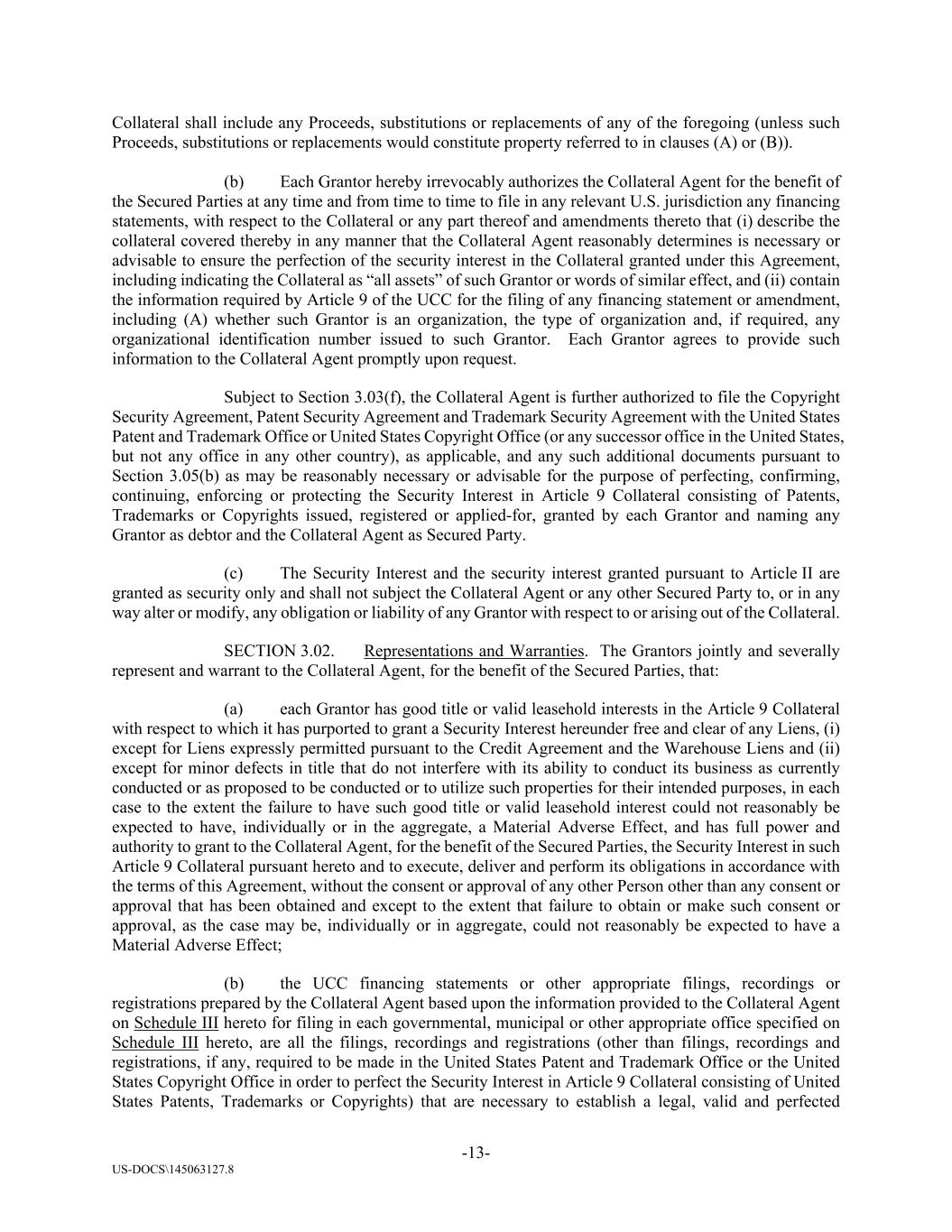 -13- US-DOCS\145063127.8 Collateral shall include any Proceeds, substitutions or replacements of any of the foregoing (unless such Proceeds, substitutions or replacements would constitute property referred to in clauses (A) or (B)). (b) Each Grantor hereby irrevocably authorizes the Collateral Agent for the benefit of the Secured Parties at any time and from time to time to file in any relevant U.S. jurisdiction any financing statements, with respect to the Collateral or any part thereof and amendments thereto that (i) describe the collateral covered thereby in any manner that the Collateral Agent reasonably determines is necessary or advisable to ensure the perfection of the security interest in the Collateral granted under this Agreement, including indicating the Collateral as “all assets” of such Grantor or words of similar effect, and (ii) contain the information required by Article 9 of the UCC for the filing of any financing statement or amendment, including (A) whether such Grantor is an organization, the type of organization and, if required, any organizational identification number issued to such Grantor. Each Grantor agrees to provide such information to the Collateral Agent promptly upon request. Subject to Section 3.03(f), the Collateral Agent is further authorized to file the Copyright Security Agreement, Patent Security Agreement and Trademark Security Agreement with the United States Patent and Trademark Office or United States Copyright Office (or any successor office in the United States, but not any office in any other country), as applicable, and any such additional documents pursuant to Section 3.05(b) as may be reasonably necessary or advisable for the purpose of perfecting, confirming, continuing, enforcing or protecting the Security Interest in Article 9 Collateral consisting of Patents, Trademarks or Copyrights issued, registered or applied-for, granted by each Grantor and naming any Grantor as debtor and the Collateral Agent as Secured Party. (c) The Security Interest and the security interest granted pursuant to Article II are granted as security only and shall not subject the Collateral Agent or any other Secured Party to, or in any way alter or modify, any obligation or liability of any Grantor with respect to or arising out of the Collateral. SECTION 3.02. Representations and Warranties. The Grantors jointly and severally represent and warrant to the Collateral Agent, for the benefit of the Secured Parties, that: (a) each Grantor has good title or valid leasehold interests in the Article 9 Collateral with respect to which it has purported to grant a Security Interest hereunder free and clear of any Liens, (i) except for Liens expressly permitted pursuant to the Credit Agreement and the Warehouse Liens and (ii) except for minor defects in title that do not interfere with its ability to conduct its business as currently conducted or as proposed to be conducted or to utilize such properties for their intended purposes, in each case to the extent the failure to have such good title or valid leasehold interest could not reasonably be expected to have, individually or in the aggregate, a Material Adverse Effect, and has full power and authority to grant to the Collateral Agent, for the benefit of the Secured Parties, the Security Interest in such Article 9 Collateral pursuant hereto and to execute, deliver and perform its obligations in accordance with the terms of this Agreement, without the consent or approval of any other Person other than any consent or approval that has been obtained and except to the extent that failure to obtain or make such consent or approval, as the case may be, individually or in aggregate, could not reasonably be expected to have a Material Adverse Effect; (b) the UCC financing statements or other appropriate filings, recordings or registrations prepared by the Collateral Agent based upon the information provided to the Collateral Agent on Schedule III hereto for filing in each governmental, municipal or other appropriate office specified on Schedule III hereto, are all the filings, recordings and registrations (other than filings, recordings and registrations, if any, required to be made in the United States Patent and Trademark Office or the United States Copyright Office in order to perfect the Security Interest in Article 9 Collateral consisting of United States Patents, Trademarks or Copyrights) that are necessary to establish a legal, valid and perfected