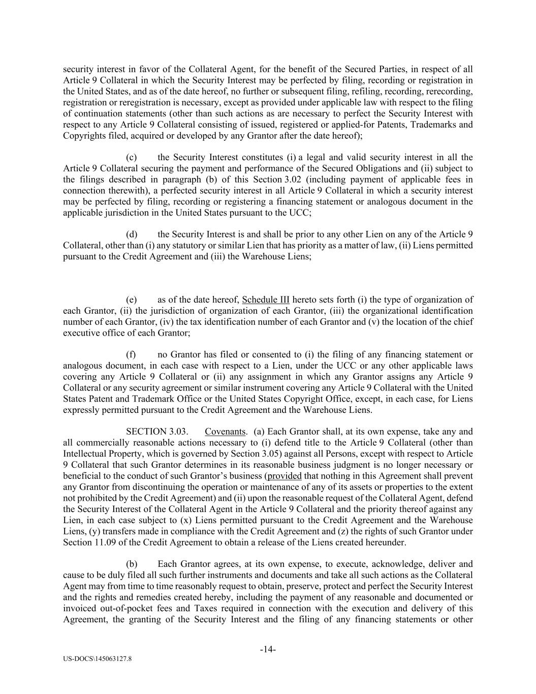 -14- US-DOCS\145063127.8 security interest in favor of the Collateral Agent, for the benefit of the Secured Parties, in respect of all Article 9 Collateral in which the Security Interest may be perfected by filing, recording or registration in the United States, and as of the date hereof, no further or subsequent filing, refiling, recording, rerecording, registration or reregistration is necessary, except as provided under applicable law with respect to the filing of continuation statements (other than such actions as are necessary to perfect the Security Interest with respect to any Article 9 Collateral consisting of issued, registered or applied-for Patents, Trademarks and Copyrights filed, acquired or developed by any Grantor after the date hereof); (c) the Security Interest constitutes (i) a legal and valid security interest in all the Article 9 Collateral securing the payment and performance of the Secured Obligations and (ii) subject to the filings described in paragraph (b) of this Section 3.02 (including payment of applicable fees in connection therewith), a perfected security interest in all Article 9 Collateral in which a security interest may be perfected by filing, recording or registering a financing statement or analogous document in the applicable jurisdiction in the United States pursuant to the UCC; (d) the Security Interest is and shall be prior to any other Lien on any of the Article 9 Collateral, other than (i) any statutory or similar Lien that has priority as a matter of law, (ii) Liens permitted pursuant to the Credit Agreement and (iii) the Warehouse Liens; (e) as of the date hereof, Schedule III hereto sets forth (i) the type of organization of each Grantor, (ii) the jurisdiction of organization of each Grantor, (iii) the organizational identification number of each Grantor, (iv) the tax identification number of each Grantor and (v) the location of the chief executive office of each Grantor; (f) no Grantor has filed or consented to (i) the filing of any financing statement or analogous document, in each case with respect to a Lien, under the UCC or any other applicable laws covering any Article 9 Collateral or (ii) any assignment in which any Grantor assigns any Article 9 Collateral or any security agreement or similar instrument covering any Article 9 Collateral with the United States Patent and Trademark Office or the United States Copyright Office, except, in each case, for Liens expressly permitted pursuant to the Credit Agreement and the Warehouse Liens. SECTION 3.03. Covenants. (a) Each Grantor shall, at its own expense, take any and all commercially reasonable actions necessary to (i) defend title to the Article 9 Collateral (other than Intellectual Property, which is governed by Section 3.05) against all Persons, except with respect to Article 9 Collateral that such Grantor determines in its reasonable business judgment is no longer necessary or beneficial to the conduct of such Grantor’s business (provided that nothing in this Agreement shall prevent any Grantor from discontinuing the operation or maintenance of any of its assets or properties to the extent not prohibited by the Credit Agreement) and (ii) upon the reasonable request of the Collateral Agent, defend the Security Interest of the Collateral Agent in the Article 9 Collateral and the priority thereof against any Lien, in each case subject to (x) Liens permitted pursuant to the Credit Agreement and the Warehouse Liens, (y) transfers made in compliance with the Credit Agreement and (z) the rights of such Grantor under Section 11.09 of the Credit Agreement to obtain a release of the Liens created hereunder. (b) Each Grantor agrees, at its own expense, to execute, acknowledge, deliver and cause to be duly filed all such further instruments and documents and take all such actions as the Collateral Agent may from time to time reasonably request to obtain, preserve, protect and perfect the Security Interest and the rights and remedies created hereby, including the payment of any reasonable and documented or invoiced out-of-pocket fees and Taxes required in connection with the execution and delivery of this Agreement, the granting of the Security Interest and the filing of any financing statements or other