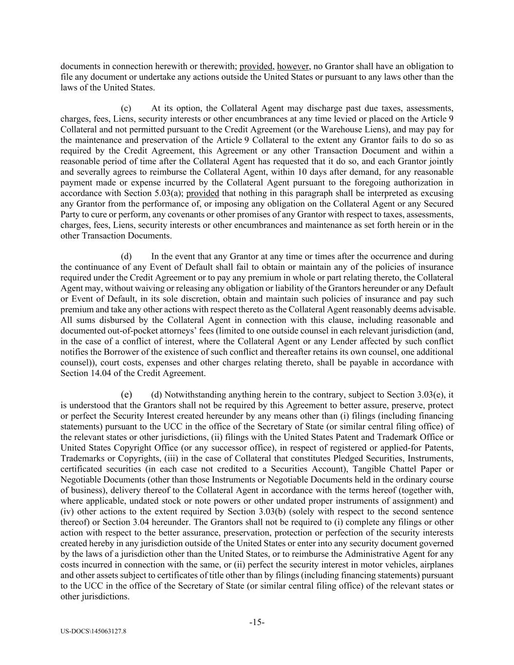 -15- US-DOCS\145063127.8 documents in connection herewith or therewith; provided, however, no Grantor shall have an obligation to file any document or undertake any actions outside the United States or pursuant to any laws other than the laws of the United States. (c) At its option, the Collateral Agent may discharge past due taxes, assessments, charges, fees, Liens, security interests or other encumbrances at any time levied or placed on the Article 9 Collateral and not permitted pursuant to the Credit Agreement (or the Warehouse Liens), and may pay for the maintenance and preservation of the Article 9 Collateral to the extent any Grantor fails to do so as required by the Credit Agreement, this Agreement or any other Transaction Document and within a reasonable period of time after the Collateral Agent has requested that it do so, and each Grantor jointly and severally agrees to reimburse the Collateral Agent, within 10 days after demand, for any reasonable payment made or expense incurred by the Collateral Agent pursuant to the foregoing authorization in accordance with Section 5.03(a); provided that nothing in this paragraph shall be interpreted as excusing any Grantor from the performance of, or imposing any obligation on the Collateral Agent or any Secured Party to cure or perform, any covenants or other promises of any Grantor with respect to taxes, assessments, charges, fees, Liens, security interests or other encumbrances and maintenance as set forth herein or in the other Transaction Documents. (d) In the event that any Grantor at any time or times after the occurrence and during the continuance of any Event of Default shall fail to obtain or maintain any of the policies of insurance required under the Credit Agreement or to pay any premium in whole or part relating thereto, the Collateral Agent may, without waiving or releasing any obligation or liability of the Grantors hereunder or any Default or Event of Default, in its sole discretion, obtain and maintain such policies of insurance and pay such premium and take any other actions with respect thereto as the Collateral Agent reasonably deems advisable. All sums disbursed by the Collateral Agent in connection with this clause, including reasonable and documented out-of-pocket attorneys’ fees (limited to one outside counsel in each relevant jurisdiction (and, in the case of a conflict of interest, where the Collateral Agent or any Lender affected by such conflict notifies the Borrower of the existence of such conflict and thereafter retains its own counsel, one additional counsel)), court costs, expenses and other charges relating thereto, shall be payable in accordance with Section 14.04 of the Credit Agreement. (e) (d) Notwithstanding anything herein to the contrary, subject to Section 3.03(e), it is understood that the Grantors shall not be required by this Agreement to better assure, preserve, protect or perfect the Security Interest created hereunder by any means other than (i) filings (including financing statements) pursuant to the UCC in the office of the Secretary of State (or similar central filing office) of the relevant states or other jurisdictions, (ii) filings with the United States Patent and Trademark Office or United States Copyright Office (or any successor office), in respect of registered or applied-for Patents, Trademarks or Copyrights, (iii) in the case of Collateral that constitutes Pledged Securities, Instruments, certificated securities (in each case not credited to a Securities Account), Tangible Chattel Paper or Negotiable Documents (other than those Instruments or Negotiable Documents held in the ordinary course of business), delivery thereof to the Collateral Agent in accordance with the terms hereof (together with, where applicable, undated stock or note powers or other undated proper instruments of assignment) and (iv) other actions to the extent required by Section 3.03(b) (solely with respect to the second sentence thereof) or Section 3.04 hereunder. The Grantors shall not be required to (i) complete any filings or other action with respect to the better assurance, preservation, protection or perfection of the security interests created hereby in any jurisdiction outside of the United States or enter into any security document governed by the laws of a jurisdiction other than the United States, or to reimburse the Administrative Agent for any costs incurred in connection with the same, or (ii) perfect the security interest in motor vehicles, airplanes and other assets subject to certificates of title other than by filings (including financing statements) pursuant to the UCC in the office of the Secretary of State (or similar central filing office) of the relevant states or other jurisdictions.