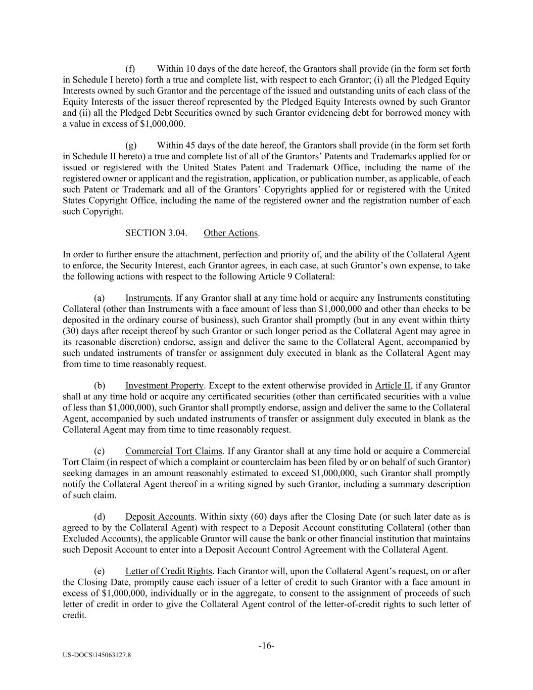 -16- US-DOCS\145063127.8 (f) Within 10 days of the date hereof, the Grantors shall provide (in the form set forth in Schedule I hereto) forth a true and complete list, with respect to each Grantor; (i) all the Pledged Equity Interests owned by such Grantor and the percentage of the issued and outstanding units of each class of the Equity Interests of the issuer thereof represented by the Pledged Equity Interests owned by such Grantor and (ii) all the Pledged Debt Securities owned by such Grantor evidencing debt for borrowed money with a value in excess of $1,000,000. (g) Within 45 days of the date hereof, the Grantors shall provide (in the form set forth in Schedule II hereto) a true and complete list of all of the Grantors’ Patents and Trademarks applied for or issued or registered with the United States Patent and Trademark Office, including the name of the registered owner or applicant and the registration, application, or publication number, as applicable, of each such Patent or Trademark and all of the Grantors’ Copyrights applied for or registered with the United States Copyright Office, including the name of the registered owner and the registration number of each such Copyright. SECTION 3.04. Other Actions. In order to further ensure the attachment, perfection and priority of, and the ability of the Collateral Agent to enforce, the Security Interest, each Grantor agrees, in each case, at such Grantor’s own expense, to take the following actions with respect to the following Article 9 Collateral: (a) Instruments. If any Grantor shall at any time hold or acquire any Instruments constituting Collateral (other than Instruments with a face amount of less than $1,000,000 and other than checks to be deposited in the ordinary course of business), such Grantor shall promptly (but in any event within thirty (30) days after receipt thereof by such Grantor or such longer period as the Collateral Agent may agree in its reasonable discretion) endorse, assign and deliver the same to the Collateral Agent, accompanied by such undated instruments of transfer or assignment duly executed in blank as the Collateral Agent may from time to time reasonably request. (b) Investment Property. Except to the extent otherwise provided in Article II, if any Grantor shall at any time hold or acquire any certificated securities (other than certificated securities with a value of less than $1,000,000), such Grantor shall promptly endorse, assign and deliver the same to the Collateral Agent, accompanied by such undated instruments of transfer or assignment duly executed in blank as the Collateral Agent may from time to time reasonably request. (c) Commercial Tort Claims. If any Grantor shall at any time hold or acquire a Commercial Tort Claim (in respect of which a complaint or counterclaim has been filed by or on behalf of such Grantor) seeking damages in an amount reasonably estimated to exceed $1,000,000, such Grantor shall promptly notify the Collateral Agent thereof in a writing signed by such Grantor, including a summary description of such claim. (d) Deposit Accounts. Within sixty (60) days after the Closing Date (or such later date as is agreed to by the Collateral Agent) with respect to a Deposit Account constituting Collateral (other than Excluded Accounts), the applicable Grantor will cause the bank or other financial institution that maintains such Deposit Account to enter into a Deposit Account Control Agreement with the Collateral Agent. (e) Letter of Credit Rights. Each Grantor will, upon the Collateral Agent’s request, on or after the Closing Date, promptly cause each issuer of a letter of credit to such Grantor with a face amount in excess of $1,000,000, individually or in the aggregate, to consent to the assignment of proceeds of such letter of credit in order to give the Collateral Agent control of the letter-of-credit rights to such letter of credit.