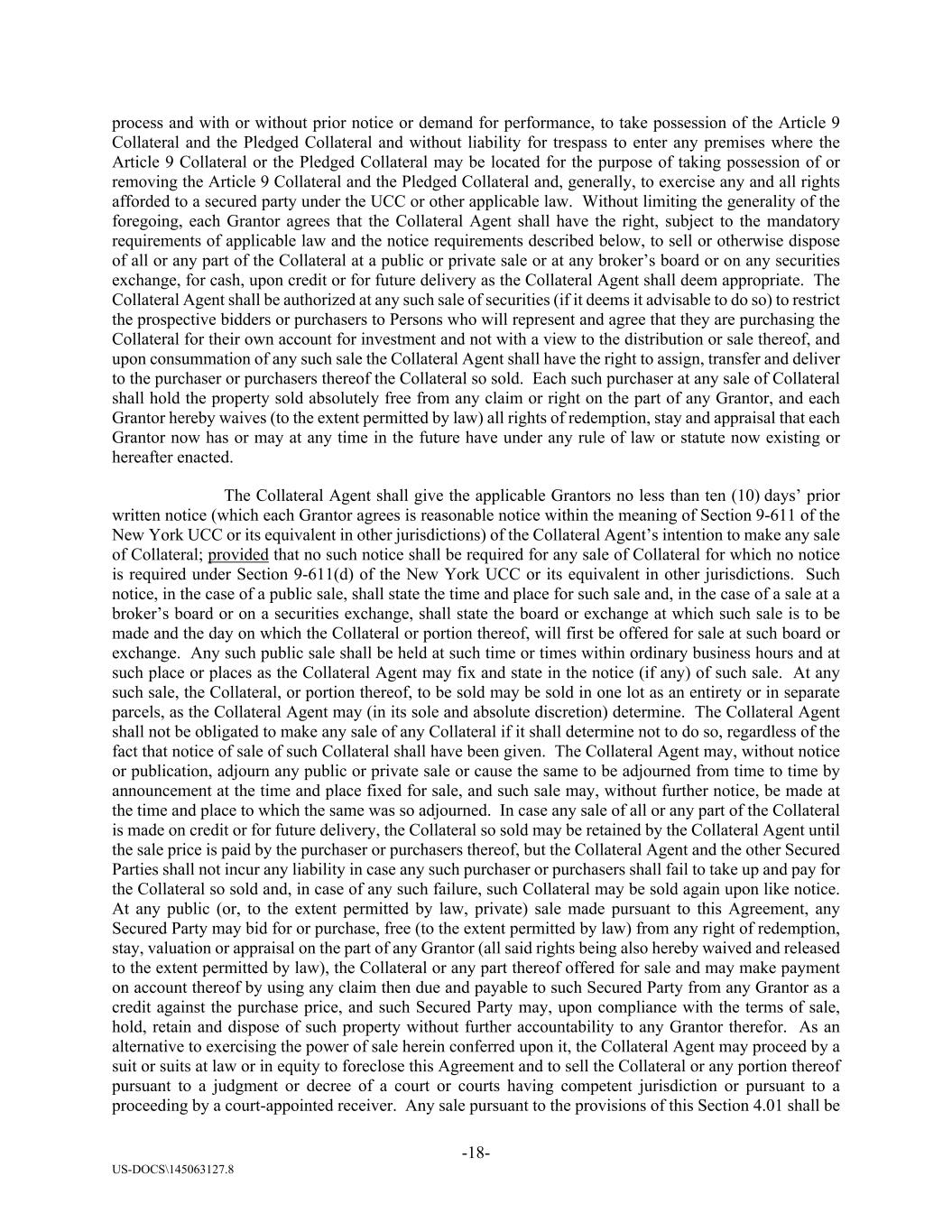 -18- US-DOCS\145063127.8 process and with or without prior notice or demand for performance, to take possession of the Article 9 Collateral and the Pledged Collateral and without liability for trespass to enter any premises where the Article 9 Collateral or the Pledged Collateral may be located for the purpose of taking possession of or removing the Article 9 Collateral and the Pledged Collateral and, generally, to exercise any and all rights afforded to a secured party under the UCC or other applicable law. Without limiting the generality of the foregoing, each Grantor agrees that the Collateral Agent shall have the right, subject to the mandatory requirements of applicable law and the notice requirements described below, to sell or otherwise dispose of all or any part of the Collateral at a public or private sale or at any broker’s board or on any securities exchange, for cash, upon credit or for future delivery as the Collateral Agent shall deem appropriate. The Collateral Agent shall be authorized at any such sale of securities (if it deems it advisable to do so) to restrict the prospective bidders or purchasers to Persons who will represent and agree that they are purchasing the Collateral for their own account for investment and not with a view to the distribution or sale thereof, and upon consummation of any such sale the Collateral Agent shall have the right to assign, transfer and deliver to the purchaser or purchasers thereof the Collateral so sold. Each such purchaser at any sale of Collateral shall hold the property sold absolutely free from any claim or right on the part of any Grantor, and each Grantor hereby waives (to the extent permitted by law) all rights of redemption, stay and appraisal that each Grantor now has or may at any time in the future have under any rule of law or statute now existing or hereafter enacted. The Collateral Agent shall give the applicable Grantors no less than ten (10) days’ prior written notice (which each Grantor agrees is reasonable notice within the meaning of Section 9-611 of the New York UCC or its equivalent in other jurisdictions) of the Collateral Agent’s intention to make any sale of Collateral; provided that no such notice shall be required for any sale of Collateral for which no notice is required under Section 9-611(d) of the New York UCC or its equivalent in other jurisdictions. Such notice, in the case of a public sale, shall state the time and place for such sale and, in the case of a sale at a broker’s board or on a securities exchange, shall state the board or exchange at which such sale is to be made and the day on which the Collateral or portion thereof, will first be offered for sale at such board or exchange. Any such public sale shall be held at such time or times within ordinary business hours and at such place or places as the Collateral Agent may fix and state in the notice (if any) of such sale. At any such sale, the Collateral, or portion thereof, to be sold may be sold in one lot as an entirety or in separate parcels, as the Collateral Agent may (in its sole and absolute discretion) determine. The Collateral Agent shall not be obligated to make any sale of any Collateral if it shall determine not to do so, regardless of the fact that notice of sale of such Collateral shall have been given. The Collateral Agent may, without notice or publication, adjourn any public or private sale or cause the same to be adjourned from time to time by announcement at the time and place fixed for sale, and such sale may, without further notice, be made at the time and place to which the same was so adjourned. In case any sale of all or any part of the Collateral is made on credit or for future delivery, the Collateral so sold may be retained by the Collateral Agent until the sale price is paid by the purchaser or purchasers thereof, but the Collateral Agent and the other Secured Parties shall not incur any liability in case any such purchaser or purchasers shall fail to take up and pay for the Collateral so sold and, in case of any such failure, such Collateral may be sold again upon like notice. At any public (or, to the extent permitted by law, private) sale made pursuant to this Agreement, any Secured Party may bid for or purchase, free (to the extent permitted by law) from any right of redemption, stay, valuation or appraisal on the part of any Grantor (all said rights being also hereby waived and released to the extent permitted by law), the Collateral or any part thereof offered for sale and may make payment on account thereof by using any claim then due and payable to such Secured Party from any Grantor as a credit against the purchase price, and such Secured Party may, upon compliance with the terms of sale, hold, retain and dispose of such property without further accountability to any Grantor therefor. As an alternative to exercising the power of sale herein conferred upon it, the Collateral Agent may proceed by a suit or suits at law or in equity to foreclose this Agreement and to sell the Collateral or any portion thereof pursuant to a judgment or decree of a court or courts having competent jurisdiction or pursuant to a proceeding by a court-appointed receiver. Any sale pursuant to the provisions of this Section 4.01 shall be
