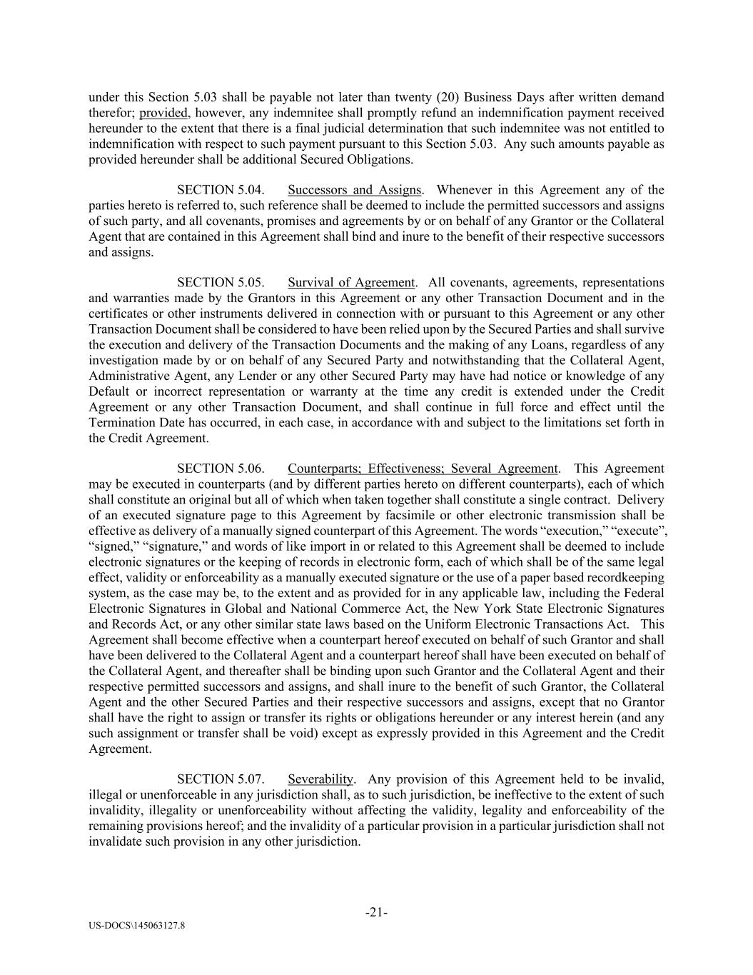 -21- US-DOCS\145063127.8 under this Section 5.03 shall be payable not later than twenty (20) Business Days after written demand therefor; provided, however, any indemnitee shall promptly refund an indemnification payment received hereunder to the extent that there is a final judicial determination that such indemnitee was not entitled to indemnification with respect to such payment pursuant to this Section 5.03. Any such amounts payable as provided hereunder shall be additional Secured Obligations. SECTION 5.04. Successors and Assigns. Whenever in this Agreement any of the parties hereto is referred to, such reference shall be deemed to include the permitted successors and assigns of such party, and all covenants, promises and agreements by or on behalf of any Grantor or the Collateral Agent that are contained in this Agreement shall bind and inure to the benefit of their respective successors and assigns. SECTION 5.05. Survival of Agreement. All covenants, agreements, representations and warranties made by the Grantors in this Agreement or any other Transaction Document and in the certificates or other instruments delivered in connection with or pursuant to this Agreement or any other Transaction Document shall be considered to have been relied upon by the Secured Parties and shall survive the execution and delivery of the Transaction Documents and the making of any Loans, regardless of any investigation made by or on behalf of any Secured Party and notwithstanding that the Collateral Agent, Administrative Agent, any Lender or any other Secured Party may have had notice or knowledge of any Default or incorrect representation or warranty at the time any credit is extended under the Credit Agreement or any other Transaction Document, and shall continue in full force and effect until the Termination Date has occurred, in each case, in accordance with and subject to the limitations set forth in the Credit Agreement. SECTION 5.06. Counterparts; Effectiveness; Several Agreement. This Agreement may be executed in counterparts (and by different parties hereto on different counterparts), each of which shall constitute an original but all of which when taken together shall constitute a single contract. Delivery of an executed signature page to this Agreement by facsimile or other electronic transmission shall be effective as delivery of a manually signed counterpart of this Agreement. The words “execution,” “execute”, “signed,” “signature,” and words of like import in or related to this Agreement shall be deemed to include electronic signatures or the keeping of records in electronic form, each of which shall be of the same legal effect, validity or enforceability as a manually executed signature or the use of a paper based recordkeeping system, as the case may be, to the extent and as provided for in any applicable law, including the Federal Electronic Signatures in Global and National Commerce Act, the New York State Electronic Signatures and Records Act, or any other similar state laws based on the Uniform Electronic Transactions Act. This Agreement shall become effective when a counterpart hereof executed on behalf of such Grantor and shall have been delivered to the Collateral Agent and a counterpart hereof shall have been executed on behalf of the Collateral Agent, and thereafter shall be binding upon such Grantor and the Collateral Agent and their respective permitted successors and assigns, and shall inure to the benefit of such Grantor, the Collateral Agent and the other Secured Parties and their respective successors and assigns, except that no Grantor shall have the right to assign or transfer its rights or obligations hereunder or any interest herein (and any such assignment or transfer shall be void) except as expressly provided in this Agreement and the Credit Agreement. SECTION 5.07. Severability. Any provision of this Agreement held to be invalid, illegal or unenforceable in any jurisdiction shall, as to such jurisdiction, be ineffective to the extent of such invalidity, illegality or unenforceability without affecting the validity, legality and enforceability of the remaining provisions hereof; and the invalidity of a particular provision in a particular jurisdiction shall not invalidate such provision in any other jurisdiction.