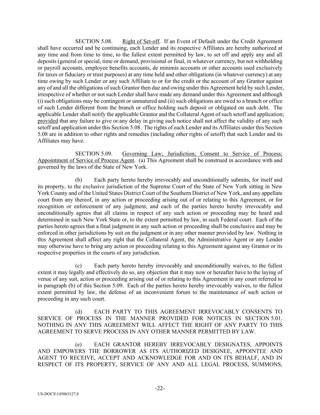 -22- US-DOCS\145063127.8 SECTION 5.08. Right of Set-off. If an Event of Default under the Credit Agreement shall have occurred and be continuing, each Lender and its respective Affiliates are hereby authorized at any time and from time to time, to the fullest extent permitted by law, to set off and apply any and all deposits (general or special, time or demand, provisional or final, in whatever currency, but not withholding or payroll accounts, employee benefits accounts, de minimis accounts or other accounts used exclusively for taxes or fiduciary or trust purposes) at any time held and other obligations (in whatever currency) at any time owing by such Lender or any such Affiliate to or for the credit or the account of any Grantor against any of and all the obligations of such Grantor then due and owing under this Agreement held by such Lender, irrespective of whether or not such Lender shall have made any demand under this Agreement and although (i) such obligations may be contingent or unmatured and (ii) such obligations are owed to a branch or office of such Lender different from the branch or office holding such deposit or obligated on such debt. The applicable Lender shall notify the applicable Grantor and the Collateral Agent of such setoff and application; provided that any failure to give or any delay in giving such notice shall not affect the validity of any such setoff and application under this Section 5.08. The rights of each Lender and its Affiliates under this Section 5.08 are in addition to other rights and remedies (including other rights of setoff) that such Lender and its Affiliates may have. SECTION 5.09. Governing Law; Jurisdiction; Consent to Service of Process; Appointment of Service of Process Agent. (a) This Agreement shall be construed in accordance with and governed by the laws of the State of New York. (b) Each party hereto hereby irrevocably and unconditionally submits, for itself and its property, to the exclusive jurisdiction of the Supreme Court of the State of New York sitting in New York County and of the United States District Court of the Southern District of New York, and any appellate court from any thereof, in any action or proceeding arising out of or relating to this Agreement, or for recognition or enforcement of any judgment, and each of the parties hereto hereby irrevocably and unconditionally agrees that all claims in respect of any such action or proceeding may be heard and determined in such New York State or, to the extent permitted by law, in such Federal court. Each of the parties hereto agrees that a final judgment in any such action or proceeding shall be conclusive and may be enforced in other jurisdictions by suit on the judgment or in any other manner provided by law. Nothing in this Agreement shall affect any right that the Collateral Agent, the Administrative Agent or any Lender may otherwise have to bring any action or proceeding relating to this Agreement against any Grantor or its respective properties in the courts of any jurisdiction. (c) Each party hereto hereby irrevocably and unconditionally waives, to the fullest extent it may legally and effectively do so, any objection that it may now or hereafter have to the laying of venue of any suit, action or proceeding arising out of or relating to this Agreement in any court referred to in paragraph (b) of this Section 5.09. Each of the parties hereto hereby irrevocably waives, to the fullest extent permitted by law, the defense of an inconvenient forum to the maintenance of such action or proceeding in any such court. (d) EACH PARTY TO THIS AGREEMENT IRREVOCABLY CONSENTS TO SERVICE OF PROCESS IN THE MANNER PROVIDED FOR NOTICES IN SECTION 5.01. NOTHING IN ANY THIS AGREEMENT WILL AFFECT THE RIGHT OF ANY PARTY TO THIS AGREEMENT TO SERVE PROCESS IN ANY OTHER MANNER PERMITTED BY LAW. (e) EACH GRANTOR HEREBY IRREVOCABLY DESIGNATES, APPOINTS AND EMPOWERS THE BORROWER AS ITS AUTHORIZED DESIGNEE, APPOINTEE AND AGENT TO RECEIVE, ACCEPT AND ACKNOWLEDGE FOR AND ON ITS BEHALF, AND IN RESPECT OF ITS PROPERTY, SERVICE OF ANY AND ALL LEGAL PROCESS, SUMMONS,