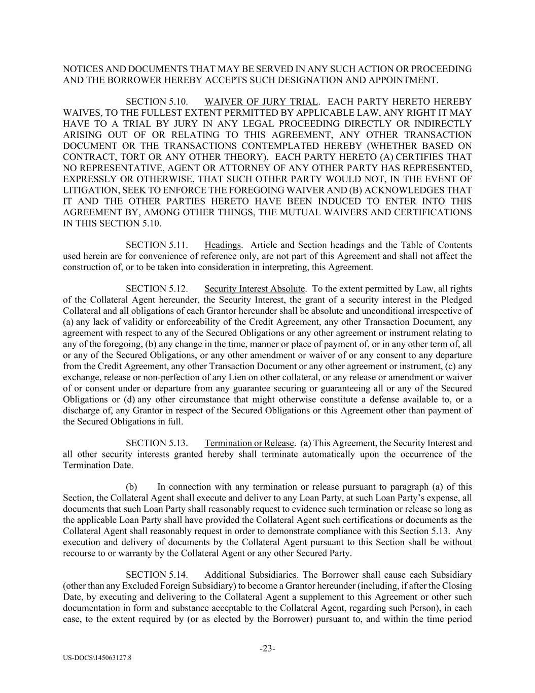 -23- US-DOCS\145063127.8 NOTICES AND DOCUMENTS THAT MAY BE SERVED IN ANY SUCH ACTION OR PROCEEDING AND THE BORROWER HEREBY ACCEPTS SUCH DESIGNATION AND APPOINTMENT. SECTION 5.10. WAIVER OF JURY TRIAL. EACH PARTY HERETO HEREBY WAIVES, TO THE FULLEST EXTENT PERMITTED BY APPLICABLE LAW, ANY RIGHT IT MAY HAVE TO A TRIAL BY JURY IN ANY LEGAL PROCEEDING DIRECTLY OR INDIRECTLY ARISING OUT OF OR RELATING TO THIS AGREEMENT, ANY OTHER TRANSACTION DOCUMENT OR THE TRANSACTIONS CONTEMPLATED HEREBY (WHETHER BASED ON CONTRACT, TORT OR ANY OTHER THEORY). EACH PARTY HERETO (A) CERTIFIES THAT NO REPRESENTATIVE, AGENT OR ATTORNEY OF ANY OTHER PARTY HAS REPRESENTED, EXPRESSLY OR OTHERWISE, THAT SUCH OTHER PARTY WOULD NOT, IN THE EVENT OF LITIGATION, SEEK TO ENFORCE THE FOREGOING WAIVER AND (B) ACKNOWLEDGES THAT IT AND THE OTHER PARTIES HERETO HAVE BEEN INDUCED TO ENTER INTO THIS AGREEMENT BY, AMONG OTHER THINGS, THE MUTUAL WAIVERS AND CERTIFICATIONS IN THIS SECTION 5.10. SECTION 5.11. Headings. Article and Section headings and the Table of Contents used herein are for convenience of reference only, are not part of this Agreement and shall not affect the construction of, or to be taken into consideration in interpreting, this Agreement. SECTION 5.12. Security Interest Absolute. To the extent permitted by Law, all rights of the Collateral Agent hereunder, the Security Interest, the grant of a security interest in the Pledged Collateral and all obligations of each Grantor hereunder shall be absolute and unconditional irrespective of (a) any lack of validity or enforceability of the Credit Agreement, any other Transaction Document, any agreement with respect to any of the Secured Obligations or any other agreement or instrument relating to any of the foregoing, (b) any change in the time, manner or place of payment of, or in any other term of, all or any of the Secured Obligations, or any other amendment or waiver of or any consent to any departure from the Credit Agreement, any other Transaction Document or any other agreement or instrument, (c) any exchange, release or non-perfection of any Lien on other collateral, or any release or amendment or waiver of or consent under or departure from any guarantee securing or guaranteeing all or any of the Secured Obligations or (d) any other circumstance that might otherwise constitute a defense available to, or a discharge of, any Grantor in respect of the Secured Obligations or this Agreement other than payment of the Secured Obligations in full. SECTION 5.13. Termination or Release. (a) This Agreement, the Security Interest and all other security interests granted hereby shall terminate automatically upon the occurrence of the Termination Date. (b) In connection with any termination or release pursuant to paragraph (a) of this Section, the Collateral Agent shall execute and deliver to any Loan Party, at such Loan Party’s expense, all documents that such Loan Party shall reasonably request to evidence such termination or release so long as the applicable Loan Party shall have provided the Collateral Agent such certifications or documents as the Collateral Agent shall reasonably request in order to demonstrate compliance with this Section 5.13. Any execution and delivery of documents by the Collateral Agent pursuant to this Section shall be without recourse to or warranty by the Collateral Agent or any other Secured Party. SECTION 5.14. Additional Subsidiaries. The Borrower shall cause each Subsidiary (other than any Excluded Foreign Subsidiary) to become a Grantor hereunder (including, if after the Closing Date, by executing and delivering to the Collateral Agent a supplement to this Agreement or other such documentation in form and substance acceptable to the Collateral Agent, regarding such Person), in each case, to the extent required by (or as elected by the Borrower) pursuant to, and within the time period