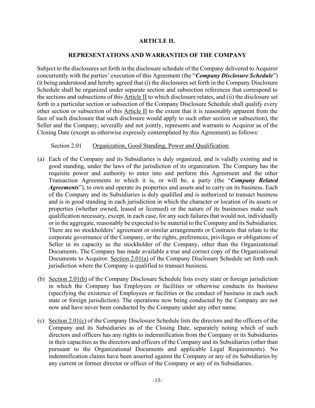 -13- ARTICLE II. REPRESENTATIONS AND WARRANTIES OF THE COMPANY Subject to the disclosures set forth in the disclosure schedule of the Company delivered to Acquiror concurrently with the parties’ execution of this Agreement (the “Company Disclosure Schedule”) (it being understood and hereby agreed that (i) the disclosures set forth in the Company Disclosure Schedule shall be organized under separate section and subsection references that correspond to the sections and subsections of this Article II to which disclosure relates, and (ii) the disclosure set forth in a particular section or subsection of the Company Disclosure Schedule shall qualify every other section or subsection of this Article II to the extent that it is reasonably apparent from the face of such disclosure that such disclosure would apply to such other section or subsection), the Seller and the Company, severally and not jointly, represents and warrants to Acquiror as of the Closing Date (except as otherwise expressly contemplated by this Agreement) as follows: Section 2.01 Organization, Good Standing, Power and Qualification. (a) Each of the Company and its Subsidiaries is duly organized, and is validly existing and in good standing, under the laws of the jurisdiction of its organization. The Company has the requisite power and authority to enter into and perform this Agreement and the other Transaction Agreements to which it is, or will be, a party (the “Company Related Agreements”), to own and operate its properties and assets and to carry on its business. Each of the Company and its Subsidiaries is duly qualified and is authorized to transact business and is in good standing in each jurisdiction in which the character or location of its assets or properties (whether owned, leased or licensed) or the nature of its businesses make such qualification necessary, except, in each case, for any such failures that would not, individually or in the aggregate, reasonably be expected to be material to the Company and its Subsidiaries. There are no stockholders’ agreement or similar arrangements or Contracts that relate to the corporate governance of the Company, or the rights, preferences, privileges or obligations of Seller in its capacity as the stockholder of the Company, other than the Organizational Documents. The Company has made available a true and correct copy of the Organizational Documents to Acquiror. Section 2.01(a) of the Company Disclosure Schedule set forth each jurisdiction where the Company is qualified to transact business. (b) Section 2.01(b) of the Company Disclosure Schedule lists every state or foreign jurisdiction in which the Company has Employees or facilities or otherwise conducts its business (specifying the existence of Employees or facilities or the conduct of business in each such state or foreign jurisdiction). The operations now being conducted by the Company are not now and have never been conducted by the Company under any other name. (c) Section 2.01(c) of the Company Disclosure Schedule lists the directors and the officers of the Company and its Subsidiaries as of the Closing Date, separately noting which of such directors and officers has any rights to indemnification from the Company or its Subsidiaries in their capacities as the directors and officers of the Company and its Subsidiaries (other than pursuant to the Organizational Documents and applicable Legal Requirements). No indemnification claims have been asserted against the Company or any of its Subsidiaries by any current or former director or officer of the Company or any of its Subsidiaries.