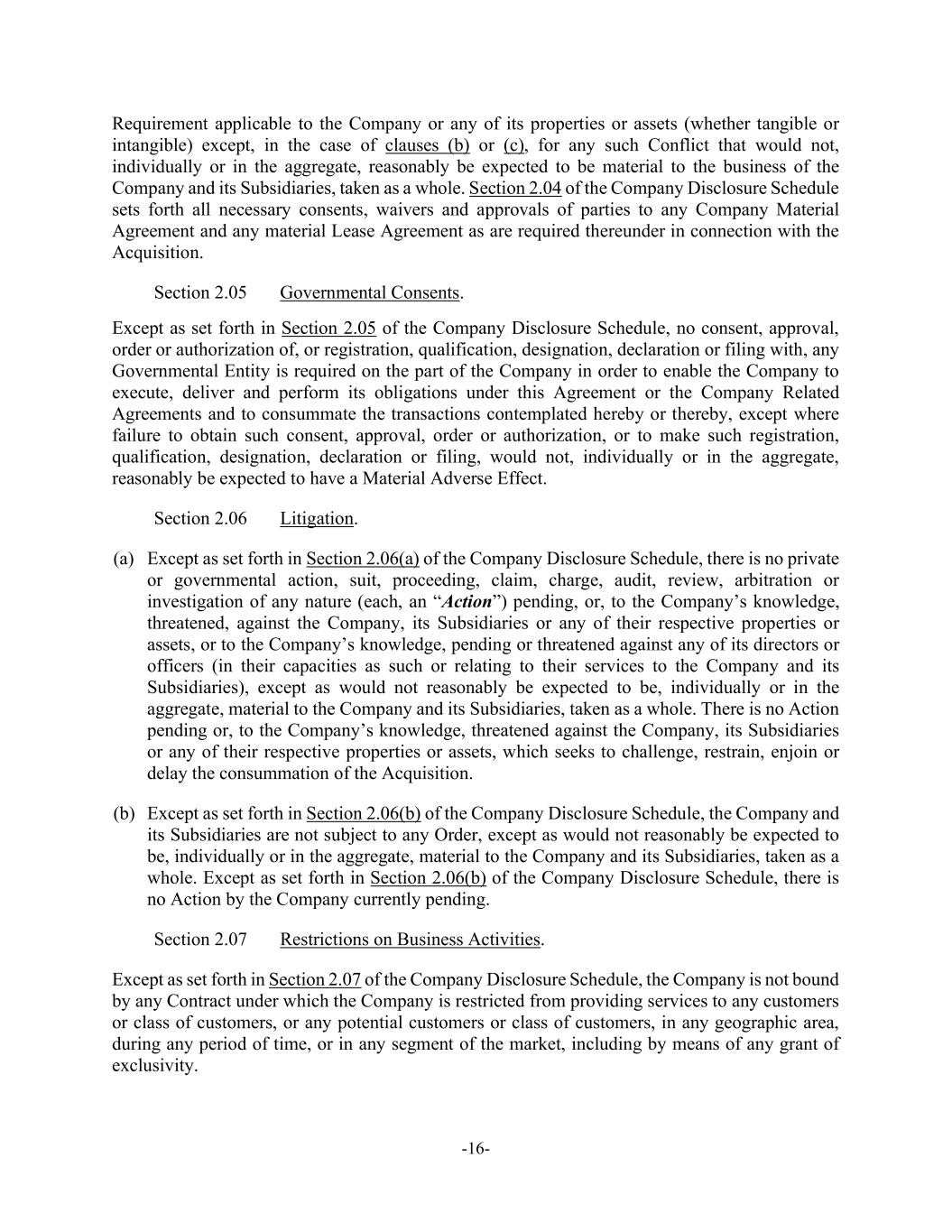 -16- Requirement applicable to the Company or any of its properties or assets (whether tangible or intangible) except, in the case of clauses (b) or (c), for any such Conflict that would not, individually or in the aggregate, reasonably be expected to be material to the business of the Company and its Subsidiaries, taken as a whole. Section 2.04 of the Company Disclosure Schedule sets forth all necessary consents, waivers and approvals of parties to any Company Material Agreement and any material Lease Agreement as are required thereunder in connection with the Acquisition. Section 2.05 Governmental Consents. Except as set forth in Section 2.05 of the Company Disclosure Schedule, no consent, approval, order or authorization of, or registration, qualification, designation, declaration or filing with, any Governmental Entity is required on the part of the Company in order to enable the Company to execute, deliver and perform its obligations under this Agreement or the Company Related Agreements and to consummate the transactions contemplated hereby or thereby, except where failure to obtain such consent, approval, order or authorization, or to make such registration, qualification, designation, declaration or filing, would not, individually or in the aggregate, reasonably be expected to have a Material Adverse Effect. Section 2.06 Litigation. (a) Except as set forth in Section 2.06(a) of the Company Disclosure Schedule, there is no private or governmental action, suit, proceeding, claim, charge, audit, review, arbitration or investigation of any nature (each, an “Action”) pending, or, to the Company’s knowledge, threatened, against the Company, its Subsidiaries or any of their respective properties or assets, or to the Company’s knowledge, pending or threatened against any of its directors or officers (in their capacities as such or relating to their services to the Company and its Subsidiaries), except as would not reasonably be expected to be, individually or in the aggregate, material to the Company and its Subsidiaries, taken as a whole. There is no Action pending or, to the Company’s knowledge, threatened against the Company, its Subsidiaries or any of their respective properties or assets, which seeks to challenge, restrain, enjoin or delay the consummation of the Acquisition. (b) Except as set forth in Section 2.06(b) of the Company Disclosure Schedule, the Company and its Subsidiaries are not subject to any Order, except as would not reasonably be expected to be, individually or in the aggregate, material to the Company and its Subsidiaries, taken as a whole. Except as set forth in Section 2.06(b) of the Company Disclosure Schedule, there is no Action by the Company currently pending. Section 2.07 Restrictions on Business Activities. Except as set forth in Section 2.07 of the Company Disclosure Schedule, the Company is not bound by any Contract under which the Company is restricted from providing services to any customers or class of customers, or any potential customers or class of customers, in any geographic area, during any period of time, or in any segment of the market, including by means of any grant of exclusivity.