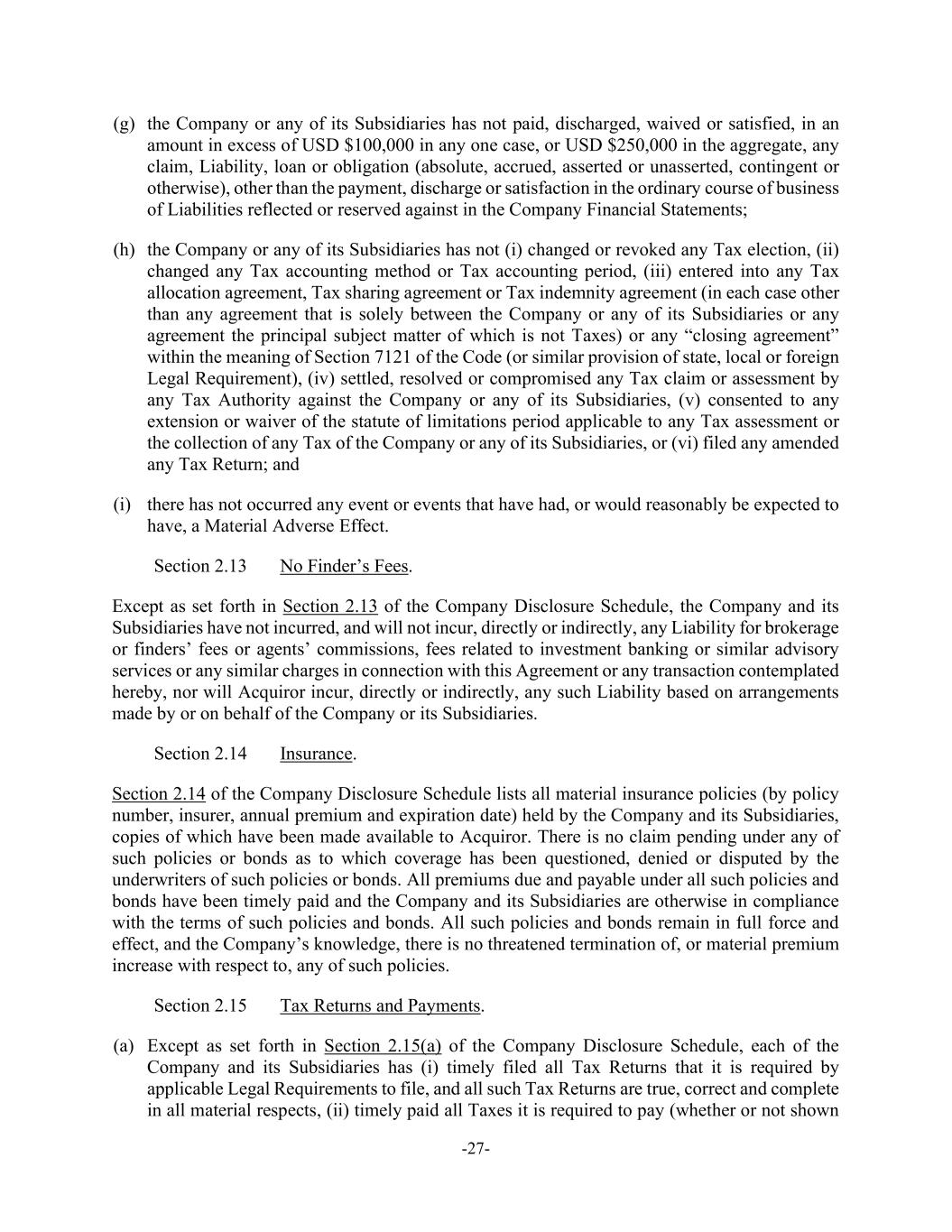 -27- (g) the Company or any of its Subsidiaries has not paid, discharged, waived or satisfied, in an amount in excess of USD $100,000 in any one case, or USD $250,000 in the aggregate, any claim, Liability, loan or obligation (absolute, accrued, asserted or unasserted, contingent or otherwise), other than the payment, discharge or satisfaction in the ordinary course of business of Liabilities reflected or reserved against in the Company Financial Statements; (h) the Company or any of its Subsidiaries has not (i) changed or revoked any Tax election, (ii) changed any Tax accounting method or Tax accounting period, (iii) entered into any Tax allocation agreement, Tax sharing agreement or Tax indemnity agreement (in each case other than any agreement that is solely between the Company or any of its Subsidiaries or any agreement the principal subject matter of which is not Taxes) or any “closing agreement” within the meaning of Section 7121 of the Code (or similar provision of state, local or foreign Legal Requirement), (iv) settled, resolved or compromised any Tax claim or assessment by any Tax Authority against the Company or any of its Subsidiaries, (v) consented to any extension or waiver of the statute of limitations period applicable to any Tax assessment or the collection of any Tax of the Company or any of its Subsidiaries, or (vi) filed any amended any Tax Return; and (i) there has not occurred any event or events that have had, or would reasonably be expected to have, a Material Adverse Effect. Section 2.13 No Finder’s Fees. Except as set forth in Section 2.13 of the Company Disclosure Schedule, the Company and its Subsidiaries have not incurred, and will not incur, directly or indirectly, any Liability for brokerage or finders’ fees or agents’ commissions, fees related to investment banking or similar advisory services or any similar charges in connection with this Agreement or any transaction contemplated hereby, nor will Acquiror incur, directly or indirectly, any such Liability based on arrangements made by or on behalf of the Company or its Subsidiaries. Section 2.14 Insurance. Section 2.14 of the Company Disclosure Schedule lists all material insurance policies (by policy number, insurer, annual premium and expiration date) held by the Company and its Subsidiaries, copies of which have been made available to Acquiror. There is no claim pending under any of such policies or bonds as to which coverage has been questioned, denied or disputed by the underwriters of such policies or bonds. All premiums due and payable under all such policies and bonds have been timely paid and the Company and its Subsidiaries are otherwise in compliance with the terms of such policies and bonds. All such policies and bonds remain in full force and effect, and the Company’s knowledge, there is no threatened termination of, or material premium increase with respect to, any of such policies. Section 2.15 Tax Returns and Payments. (a) Except as set forth in Section 2.15(a) of the Company Disclosure Schedule, each of the Company and its Subsidiaries has (i) timely filed all Tax Returns that it is required by applicable Legal Requirements to file, and all such Tax Returns are true, correct and complete in all material respects, (ii) timely paid all Taxes it is required to pay (whether or not shown