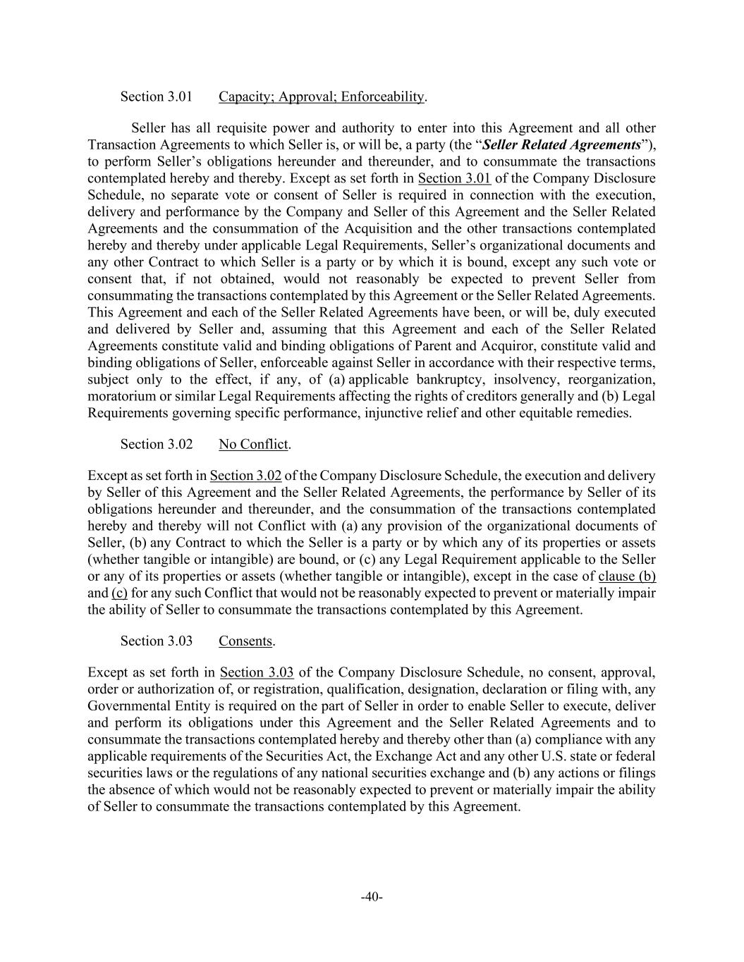 -40- Section 3.01 Capacity; Approval; Enforceability. Seller has all requisite power and authority to enter into this Agreement and all other Transaction Agreements to which Seller is, or will be, a party (the “Seller Related Agreements”), to perform Seller’s obligations hereunder and thereunder, and to consummate the transactions contemplated hereby and thereby. Except as set forth in Section 3.01 of the Company Disclosure Schedule, no separate vote or consent of Seller is required in connection with the execution, delivery and performance by the Company and Seller of this Agreement and the Seller Related Agreements and the consummation of the Acquisition and the other transactions contemplated hereby and thereby under applicable Legal Requirements, Seller’s organizational documents and any other Contract to which Seller is a party or by which it is bound, except any such vote or consent that, if not obtained, would not reasonably be expected to prevent Seller from consummating the transactions contemplated by this Agreement or the Seller Related Agreements. This Agreement and each of the Seller Related Agreements have been, or will be, duly executed and delivered by Seller and, assuming that this Agreement and each of the Seller Related Agreements constitute valid and binding obligations of Parent and Acquiror, constitute valid and binding obligations of Seller, enforceable against Seller in accordance with their respective terms, subject only to the effect, if any, of (a) applicable bankruptcy, insolvency, reorganization, moratorium or similar Legal Requirements affecting the rights of creditors generally and (b) Legal Requirements governing specific performance, injunctive relief and other equitable remedies. Section 3.02 No Conflict. Except as set forth in Section 3.02 of the Company Disclosure Schedule, the execution and delivery by Seller of this Agreement and the Seller Related Agreements, the performance by Seller of its obligations hereunder and thereunder, and the consummation of the transactions contemplated hereby and thereby will not Conflict with (a) any provision of the organizational documents of Seller, (b) any Contract to which the Seller is a party or by which any of its properties or assets (whether tangible or intangible) are bound, or (c) any Legal Requirement applicable to the Seller or any of its properties or assets (whether tangible or intangible), except in the case of clause (b) and (c) for any such Conflict that would not be reasonably expected to prevent or materially impair the ability of Seller to consummate the transactions contemplated by this Agreement. Section 3.03 Consents. Except as set forth in Section 3.03 of the Company Disclosure Schedule, no consent, approval, order or authorization of, or registration, qualification, designation, declaration or filing with, any Governmental Entity is required on the part of Seller in order to enable Seller to execute, deliver and perform its obligations under this Agreement and the Seller Related Agreements and to consummate the transactions contemplated hereby and thereby other than (a) compliance with any applicable requirements of the Securities Act, the Exchange Act and any other U.S. state or federal securities laws or the regulations of any national securities exchange and (b) any actions or filings the absence of which would not be reasonably expected to prevent or materially impair the ability of Seller to consummate the transactions contemplated by this Agreement.