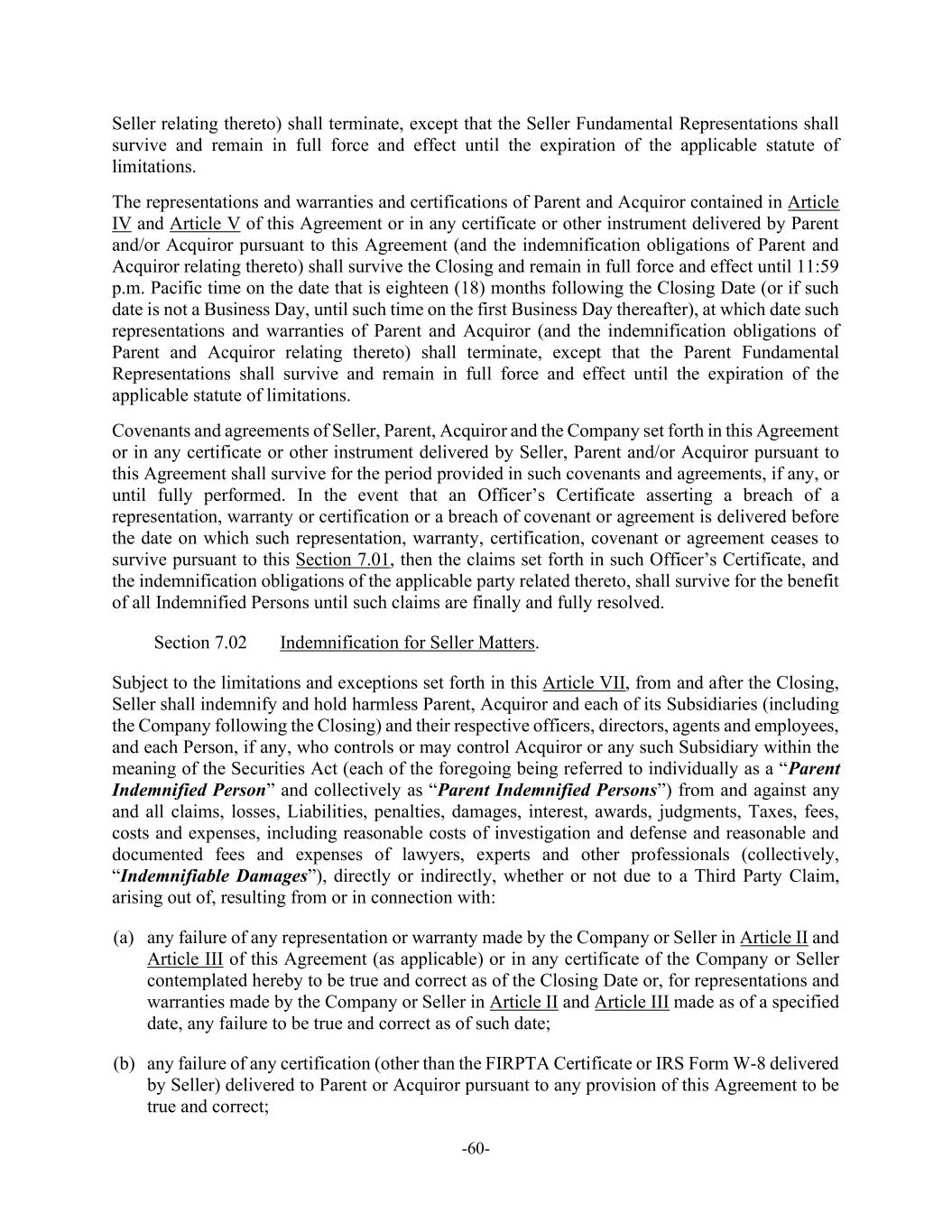 -60- Seller relating thereto) shall terminate, except that the Seller Fundamental Representations shall survive and remain in full force and effect until the expiration of the applicable statute of limitations. The representations and warranties and certifications of Parent and Acquiror contained in Article IV and Article V of this Agreement or in any certificate or other instrument delivered by Parent and/or Acquiror pursuant to this Agreement (and the indemnification obligations of Parent and Acquiror relating thereto) shall survive the Closing and remain in full force and effect until 11:59 p.m. Pacific time on the date that is eighteen (18) months following the Closing Date (or if such date is not a Business Day, until such time on the first Business Day thereafter), at which date such representations and warranties of Parent and Acquiror (and the indemnification obligations of Parent and Acquiror relating thereto) shall terminate, except that the Parent Fundamental Representations shall survive and remain in full force and effect until the expiration of the applicable statute of limitations. Covenants and agreements of Seller, Parent, Acquiror and the Company set forth in this Agreement or in any certificate or other instrument delivered by Seller, Parent and/or Acquiror pursuant to this Agreement shall survive for the period provided in such covenants and agreements, if any, or until fully performed. In the event that an Officer’s Certificate asserting a breach of a representation, warranty or certification or a breach of covenant or agreement is delivered before the date on which such representation, warranty, certification, covenant or agreement ceases to survive pursuant to this Section 7.01, then the claims set forth in such Officer’s Certificate, and the indemnification obligations of the applicable party related thereto, shall survive for the benefit of all Indemnified Persons until such claims are finally and fully resolved. Section 7.02 Indemnification for Seller Matters. Subject to the limitations and exceptions set forth in this Article VII, from and after the Closing, Seller shall indemnify and hold harmless Parent, Acquiror and each of its Subsidiaries (including the Company following the Closing) and their respective officers, directors, agents and employees, and each Person, if any, who controls or may control Acquiror or any such Subsidiary within the meaning of the Securities Act (each of the foregoing being referred to individually as a “Parent Indemnified Person” and collectively as “Parent Indemnified Persons”) from and against any and all claims, losses, Liabilities, penalties, damages, interest, awards, judgments, Taxes, fees, costs and expenses, including reasonable costs of investigation and defense and reasonable and documented fees and expenses of lawyers, experts and other professionals (collectively, “Indemnifiable Damages”), directly or indirectly, whether or not due to a Third Party Claim, arising out of, resulting from or in connection with: (a) any failure of any representation or warranty made by the Company or Seller in Article II and Article III of this Agreement (as applicable) or in any certificate of the Company or Seller contemplated hereby to be true and correct as of the Closing Date or, for representations and warranties made by the Company or Seller in Article II and Article III made as of a specified date, any failure to be true and correct as of such date; (b) any failure of any certification (other than the FIRPTA Certificate or IRS Form W-8 delivered by Seller) delivered to Parent or Acquiror pursuant to any provision of this Agreement to be true and correct;