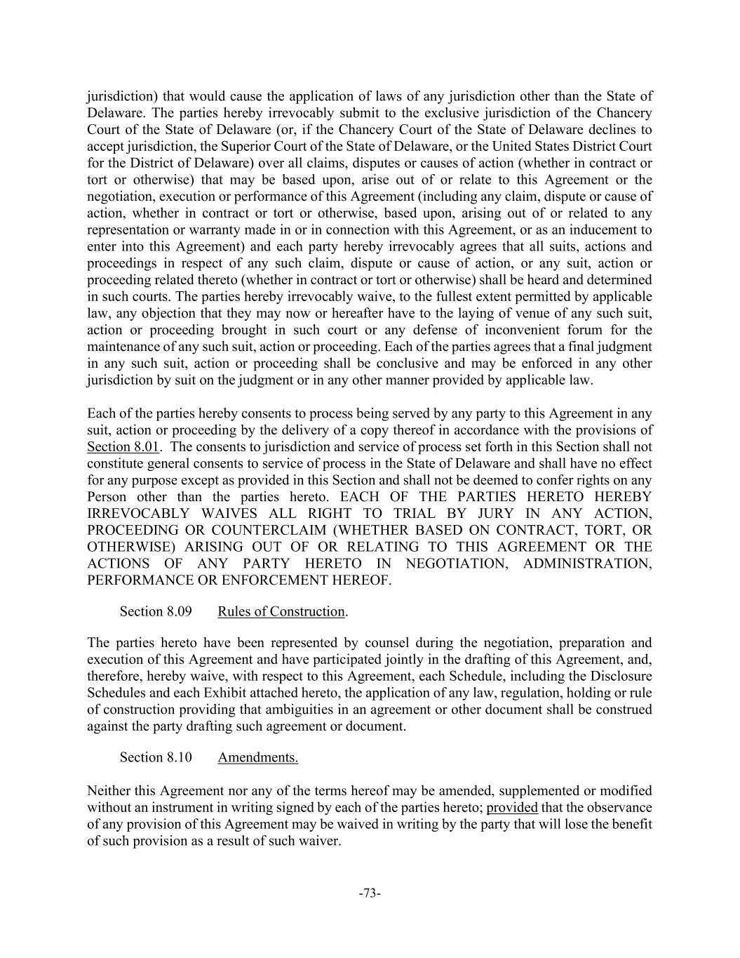 -73- jurisdiction) that would cause the application of laws of any jurisdiction other than the State of Delaware. The parties hereby irrevocably submit to the exclusive jurisdiction of the Chancery Court of the State of Delaware (or, if the Chancery Court of the State of Delaware declines to accept jurisdiction, the Superior Court of the State of Delaware, or the United States District Court for the District of Delaware) over all claims, disputes or causes of action (whether in contract or tort or otherwise) that may be based upon, arise out of or relate to this Agreement or the negotiation, execution or performance of this Agreement (including any claim, dispute or cause of action, whether in contract or tort or otherwise, based upon, arising out of or related to any representation or warranty made in or in connection with this Agreement, or as an inducement to enter into this Agreement) and each party hereby irrevocably agrees that all suits, actions and proceedings in respect of any such claim, dispute or cause of action, or any suit, action or proceeding related thereto (whether in contract or tort or otherwise) shall be heard and determined in such courts. The parties hereby irrevocably waive, to the fullest extent permitted by applicable law, any objection that they may now or hereafter have to the laying of venue of any such suit, action or proceeding brought in such court or any defense of inconvenient forum for the maintenance of any such suit, action or proceeding. Each of the parties agrees that a final judgment in any such suit, action or proceeding shall be conclusive and may be enforced in any other jurisdiction by suit on the judgment or in any other manner provided by applicable law. Each of the parties hereby consents to process being served by any party to this Agreement in any suit, action or proceeding by the delivery of a copy thereof in accordance with the provisions of Section 8.01. The consents to jurisdiction and service of process set forth in this Section shall not constitute general consents to service of process in the State of Delaware and shall have no effect for any purpose except as provided in this Section and shall not be deemed to confer rights on any Person other than the parties hereto. EACH OF THE PARTIES HERETO HEREBY IRREVOCABLY WAIVES ALL RIGHT TO TRIAL BY JURY IN ANY ACTION, PROCEEDING OR COUNTERCLAIM (WHETHER BASED ON CONTRACT, TORT, OR OTHERWISE) ARISING OUT OF OR RELATING TO THIS AGREEMENT OR THE ACTIONS OF ANY PARTY HERETO IN NEGOTIATION, ADMINISTRATION, PERFORMANCE OR ENFORCEMENT HEREOF. Section 8.09 Rules of Construction. The parties hereto have been represented by counsel during the negotiation, preparation and execution of this Agreement and have participated jointly in the drafting of this Agreement, and, therefore, hereby waive, with respect to this Agreement, each Schedule, including the Disclosure Schedules and each Exhibit attached hereto, the application of any law, regulation, holding or rule of construction providing that ambiguities in an agreement or other document shall be construed against the party drafting such agreement or document. Section 8.10 Amendments. Neither this Agreement nor any of the terms hereof may be amended, supplemented or modified without an instrument in writing signed by each of the parties hereto; provided that the observance of any provision of this Agreement may be waived in writing by the party that will lose the benefit of such provision as a result of such waiver.