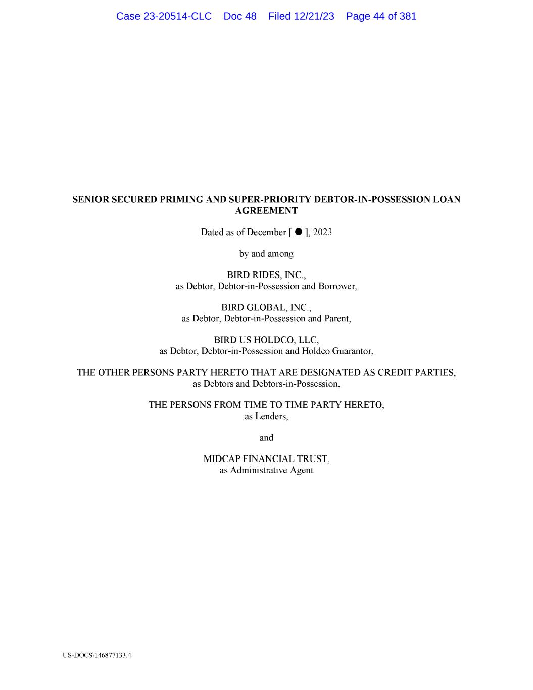 SENIOR SECURED PRIMING AND SUPER-PRIORITY DEBTOR-IN-POSSESSION EOAN AGREEMENT Dated as of December [ • ], 2023 by and among BIRD RIDES, INC., as Debtor, Debtor-in-Possession and Borrower, BIRD GLOBAL, INC., as Debtor, Debtor-in-Possession and Parent, BIRD US HOLDCO, LLC, as Debtor, Debtor-in-Possession and Holdco Guarantor, THE OTHER PERSONS PARTY HERETO THAT ARE DESIGNATED AS CREDIT PARTIES, as Debtors and Debtors-in-Possession, THE PERSONS FROM TIME TO TIME PARTY HERETO, as Lenders, and MIDCAP FINANCIAL TRUST, as Administrative Agent US-DOCS\146877133.4 Case 23-20514-CLC Doc 48 Filed 12/21/23 Page 44 of 381