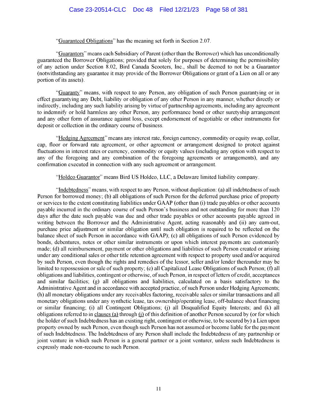 “Guaranteed Obligations” has the meaning set forth in Section 2.07. “Guarantors” means each Subsidiary of Parent (other than the Borrower) which has unconditionally guaranteed the Borrower Obligations; provided that solely for purposes of determining the permissibility of any action under Section 8.02, Bird Canada Scooters, Inc., shall be deemed to not be a Guarantor (notwithstanding any guarantee it may provide of the Borrower Obligations or grant of a Lien on all or any portion of its assets). “Guaranty” means, with respect to any Person, any obligation of such Person guarantying or in effect guarantying any Debt, liability or obligation of any other Person in any manner, whether directly or indirectly, including any such liability arising by virtue of partnership agreements, including any agreement to indemnify or hold harmless any other Person, any performance bond or other suretyship arrangement and any other form of assurance against loss, except endorsement of negotiable or other instruments for deposit or collection in the ordinary course of business. “Hedging Agreement” means any interest rate, foreign currency, commodity or equity swap, collar, cap, floor or forward rate agreement, or other agreement or arrangement designed to protect against fluctuations in interest rates or currency, commodity or equity values (including any option with respect to any of the foregoing and any combination of the foregoing agreements or arrangements), and any confirmation executed in connection with any such agreement or arrangement. “Holdco Guarantor” means Bird US Holdco, LLC, a Delaware limited liability company. “Indebtedness” means, with respect to any Person, without duplication: (a) all indebtedness of such Person for borrowed money; (b) all obligations of such Person for the deferred purchase price of property or services to the extent constituting liabilities under GAAP (other than (i) trade payables or other accounts payable incurred in the ordinary course of such Person’s business and not outstanding for more than 120 days after the date such payable was due and other trade payables or other accounts payable agreed in writing between the Borrower and the Administrative Agent, acting reasonably and (ii) any eam-out, purchase price adjustment or similar obligation until such obligation is required to be reflected on the balance sheet of such Person in accordance with GAAP); (c) all obligations of such Person evidenced by bonds, debentures, notes or other similar instruments or upon which interest payments are customarily made; (d) all reimbursement, payment or other obligations and liabilities of such Person created or arising under any conditional sales or other title retention agreement with respect to property used and/or acquired by such Person, even though the rights and remedies of the lessor, seller and/or lender thereunder may be limited to repossession or sale of such property; (e) all Capitalized Lease Obligations of such Person; (f) all obligations and liabilities, contingent or otherwise, of such Person, in respect of letters of credit, acceptances and similar facilities; (g) all obligations and liabilities, calculated on a basis satisfactory to the Administrative Agent and in accordance with accepted practice, of such Person under Hedging Agreements; (h) all monetary obligations under any receivables factoring, receivable sales or similar transactions and all monetary obligations under any synthetic lease, tax ownership/operating lease, off-balance sheet financing or similar financing; (i) all Contingent Obligations; (j) all Disqualified Equity Interests; and (k) all obligations referred to in clauses (a) through (j) of this definition of another Person secured by (or for which the holder of such Indebtedness has an existing right, contingent or otherwise, to be secured by) a Lien upon property owned by such Person, even though such Person has not assumed or become liable for the payment of such Indebtedness. The Indebtedness of any Person shall include the Indebtedness of any partnership or joint venture in which such Person is a general partner or a joint venturer, unless such Indebtedness is expressly made non-recourse to such Person. 11 Case 23-20514-CLC Doc 48 Filed 12/21/23 Page 58 of 381