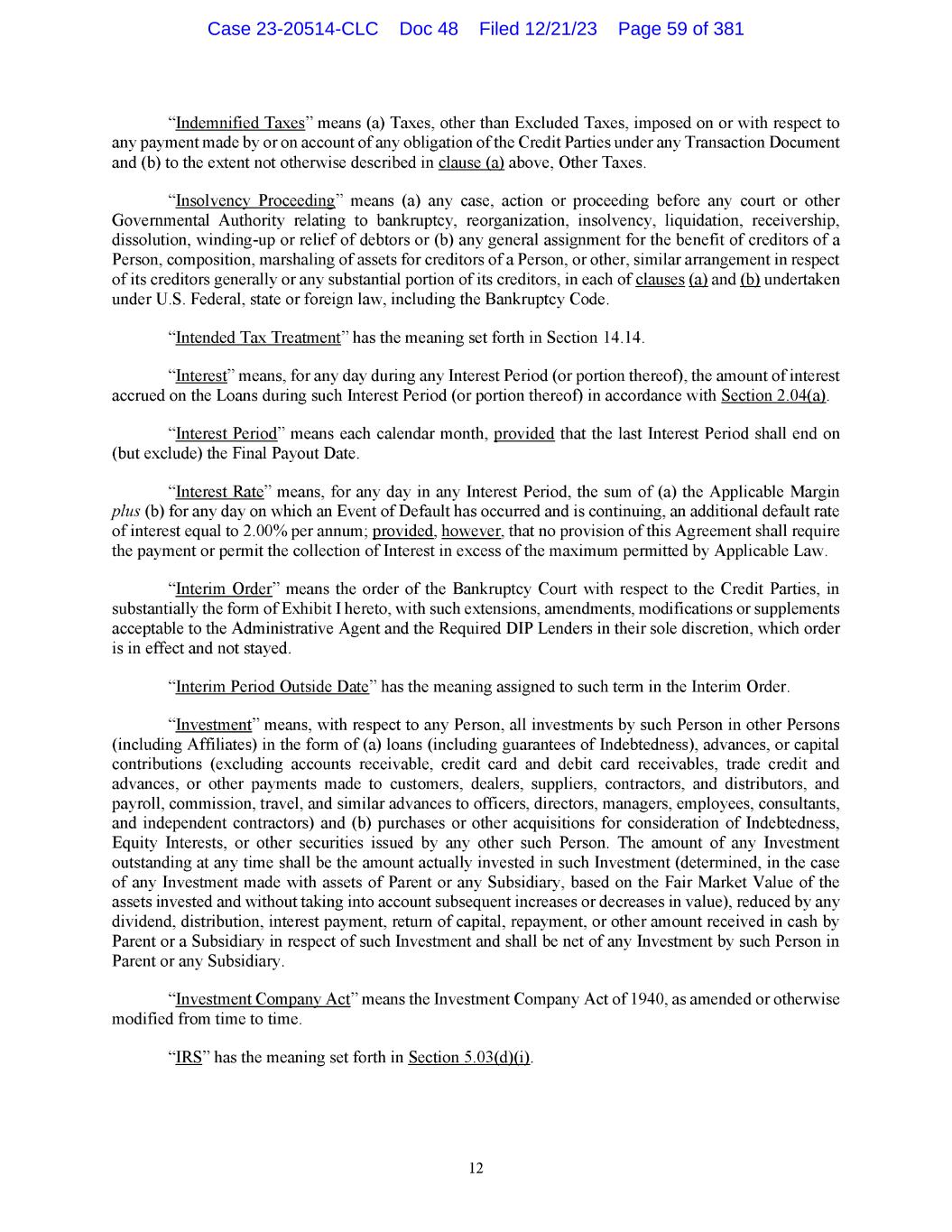 “Indemnified Taxes” means (a) Taxes, other than Excluded Taxes, imposed on or with respect to any payment made by or on account of any obligation of the Credit Parties under any Transaction Document and (b) to the extent not otherwise described in clause (a) above, Other Taxes. “Insolvency Proceeding” means (a) any case, action or proceeding before any court or other Governmental Authority relating to bankruptcy, reorganization, insolvency, liquidation, receivership, dissolution, winding-up or relief of debtors or (b) any general assignment for the benefit of creditors of a Person, composition, marshaling of assets for creditors of a Person, or other, similar arrangement in respect of its creditors generally or any substantial portion of its creditors, in each of clauses (a) and (b) undertaken under U.S. Federal, state or foreign law, including the Bankruptcy Code. “Intended Tax Treatment” has the meaning set forth in Section 14.14. “Interest” means, for any day during any Interest Period (or portion thereof), the amount of interest accrued on the Loans during such Interest Period (or portion thereof) in accordance with Section 2.04(a). “Interest Period” means each calendar month, provided that the last Interest Period shall end on (but exclude) the Final Payout Date. “Interest Rate” means, for any day in any Interest Period, the sum of (a) the Applicable Margin plus (b) for any day on which an Event of Default has occurred and is continuing, an additional default rate of interest equal to 2.00% per annum; provided, however, that no provision of this Agreement shall require the payment or permit the collection of Interest in excess of the maximum permitted by Applicable Law. “Interim Order” means the order of the Bankruptcy Court with respect to the Credit Parties, in substantially the form of Exhibit I hereto, with such extensions, amendments, modifications or supplements acceptable to the Administrative Agent and the Required DIP Lenders in their sole discretion, which order is in effect and not stayed. “Interim Period Outside Date” has the meaning assigned to such term in the Interim Order. “Investment” means, with respect to any Person, all investments by such Person in other Persons (including Affiliates) in the form of (a) loans (including guarantees of Indebtedness), advances, or capital contributions (excluding accounts receivable, credit card and debit card receivables, trade credit and advances, or other payments made to customers, dealers, suppliers, contractors, and distributors, and payroll, commission, travel, and similar advances to officers, directors, managers, employees, consultants, and independent contractors) and (b) purchases or other acquisitions for consideration of Indebtedness, Equity Interests, or other securities issued by any other such Person. The amount of any Investment outstanding at any time shall be the amount actually invested in such Investment (determined, in the case of any Investment made with assets of Parent or any Subsidiary, based on the Fair Market Value of the assets invested and without taking into account subsequent increases or decreases in value), reduced by any dividend, distribution, interest payment, return of capital, repayment, or other amount received in cash by Parent or a Subsidiary in respect of such Investment and shall be net of any Investment by such Person in Parent or any Subsidiary. “Investment Company Act” means the Investment Company Act of 1940, as amended or otherwise modified from time to time. “IRS” has the meaning set forth in Section 5.03(d)(i). 12 Case 23-20514-CLC Doc 48 Filed 12/21/23 Page 59 of 381