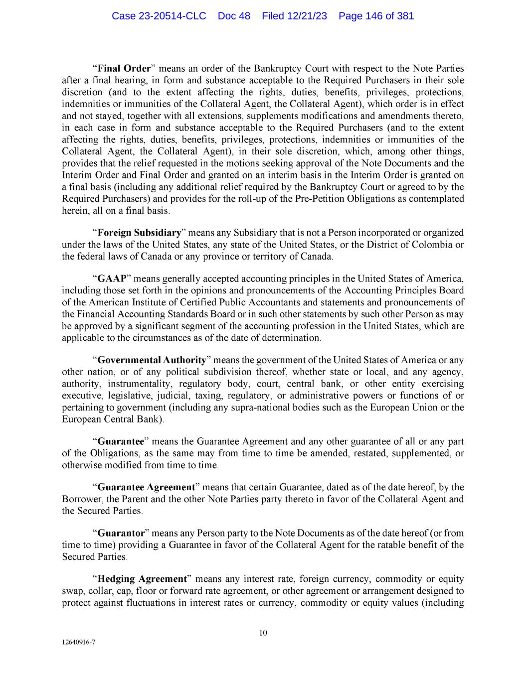 “Federal Funds Rate” means, for any day, the rate of interest per annum (rounded upwards, if necessary, to the nearest whole multiple of 1/100 of 1%) equal to the weighted average of the rates on overnight Federal funds transactions with members of the Federal Reserve System arranged by Federal funds brokers on such day, as published by the Federal Reserve Bank of New York on the Business Day next succeeding such day, provided, however, that (a) if such day is not a Business Day, the Federal Funds Rate for such day shall be such rate on such transactions on the next preceding Business Day, and (b) if no such rate is so published on such next preceding Business Day, the Federal Funds Rate for such day shall be the average rate quoted to the Administrative Agent on such day on such transactions as determined by the Administrative Agent. “Fee Letter” has the meaning set forth in Section 2.04(b). “Fees” has the meaning set forth in Section 2.04(b). “Final Order” means an order of the Bankruptcy Court with respect to the Credit Parties after a final hearing, in form and substance acceptable to the Administrative Agent and the Required DIP Lenders in their sole discretion, which order is in effect and not stayed, together with all extensions, supplements modifications and amendments thereto, in each case in form and substance acceptable to the Administrative Agent and the Required DIP Lenders, in their sole discretion, which, among other things, provides that the relief requested in the motions seeking approval of the Transaction Documents and the Interim Order and Final Order and granted on an interim basis in the Interim Order is granted on a final basis (including any additional relief required by the Bankruptcy Court or agreed to by the Administrative Agent) and provides for the roll-up of the Pre-Petition Obligations as contemplated herein, all on a final basis. “Financial Officer” of any Person means, the chief executive officer, the chief financial officer, the chief accounting officer, the principal accounting officer, the controller, the treasurer or the assistant treasurer of such Person. “Foreign Lender” has the meaning set forth in Section 5.03(d)(i). “Foreign Subsidiary” means a Subsidiary that is not incorporated, formed or organized under the laws of the United States or any state thereof. “Foreign Subsidiary Holding Company” means any direct or indirect Subsidiary of any Credit Party, all or substantially all of the assets of which consist of, directly or indirectly, the Equity Interests in one or more CFCs and any of such CFCs’ Subsidiaries, and/or debt or accounts receivable owed by CFCs and/or such CFC’s Subsidiaries or are treated as owed by any such Subsidiaries for U.S. federal income tax purposes. “GAAP” means generally accepted accounting principles in the United States of America, consistently applied. “Government Approval” means, with respect to any Person, all permits, approvals, licenses, and/or requirements of any applicable governmental authority, if any, necessary for the operation of such Person’s business. “Governmental Authority” means the government of the United States of America or any other nation, or of any political subdivision thereof, whether state or local, and any agency, authority, instrumentality, regulatory body, court, central bank or other entity exercising executive, legislative, judicial, taxing, regulatory or administrative powers or functions of or pertaining to government (including any supra-national bodies such as the European Union or the European Central Bank). 10 Case 23-20514-CLC Doc 48 Filed 12/21/23 Page 57 of 381