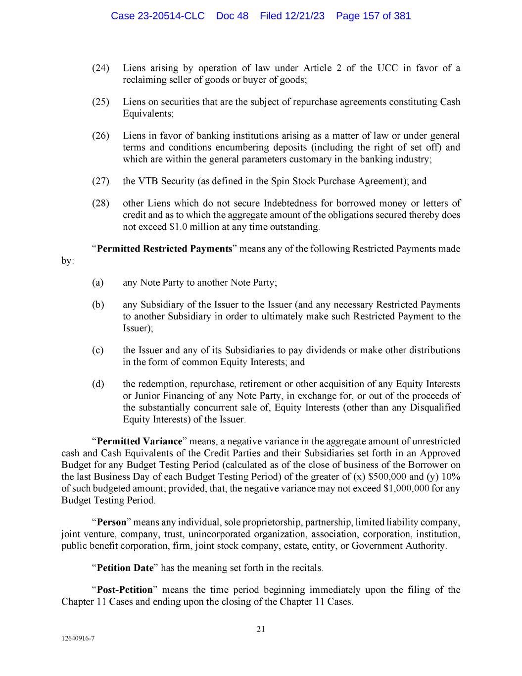 (b) any Subsidiary of Parent to Parent (and any necessary Restricted Payments to another Subsidiary in order to ultimately make such Restricted Payment to Parent); (c) Parent and any of its Subsidiaries to pay dividends or make other distributions in the form of common Equity Interests; and (d) the redemption, repurchase, retirement or other acquisition of any Equity Interests or Junior Financing of any Credit Party, in exchange for, or out of the proceeds of the substantially concurrent sale of, Equity Interests (other than any Disqualified Equity Interests) of Parent. “Permitted Variance” means, a negative variance in the aggregate amount of unrestricted cash and Cash Equivalents of the Credit Parties and their Subsidiaries set forth each Approved Budget for any Budget Testing Period (calculated as of the close of business of the Borrower on the last Business Day of each Budget Testing Period) of the greater of (x) $500,000 and (y) 10% of such budgeted amount; provided, that, the negative variance may not exceed $1,000,000 for any Budget Testing Period. “Person” means an individual, partnership, corporation (including a business trust), joint stock company, trust, unincorporated association, joint venture, limited liability company or other entity, or any Governmental Authority. “Petition Date” has the meaning assigned to such term in the Recitals. “Post-Petition” means the time period beginning immediately upon the filing of the Chapter 11 Cases and ending upon the closing of the Chapter 11 Cases. “Potential Event of Default” means an event that but for notice or lapse of time or both would constitute an Event of Default. “PPSA” means the Personal Property Security Act (Ontario) (and other equivalent personal property security legislation in any other applicable Canadian province or territory) and the regulations thereunder, as from time to time in effect; provided that, if attachment, perfection or priority of the Collateral Agent’s security interest in any Collateral is governed by the personal property security laws of any jurisdiction in Canada other than Ontario, with respect to such Collateral, PPSA shall mean those personal property security laws in such other jurisdiction of Canada (including the Civil Code of Quebec and the regulations thereunder, in the case of Quebec) for the purposes of the provisions hereof relating to such attachment, perfection or priority and for the definitions related to such provisions. “Pre-Petition Agent” means the “Administrative Agent” as defined in the Pre-Petition Loan Agreement. “Pre-Petition Amendment No. 1 Obligations” means all interest, fees and principal owning with respect to the “Existing Amendment No. 1 Loans” as such term is defined in the Pre-Petition Loan Agreement. “Pre-Petition Bridge Obligations” means all interest, fees and principal owning with respect to the “Bridge Loans” as such term is defined in the Pre-Petition Loan Agreement. “Pre-Petition Indebtedness” means any and all Indebtedness of the Credit Parties incurred prior to the Petition Date and outstanding as of the Petition Date. 21 Case 23-20514-CLC Doc 48 Filed 12/21/23 Page 68 of 381