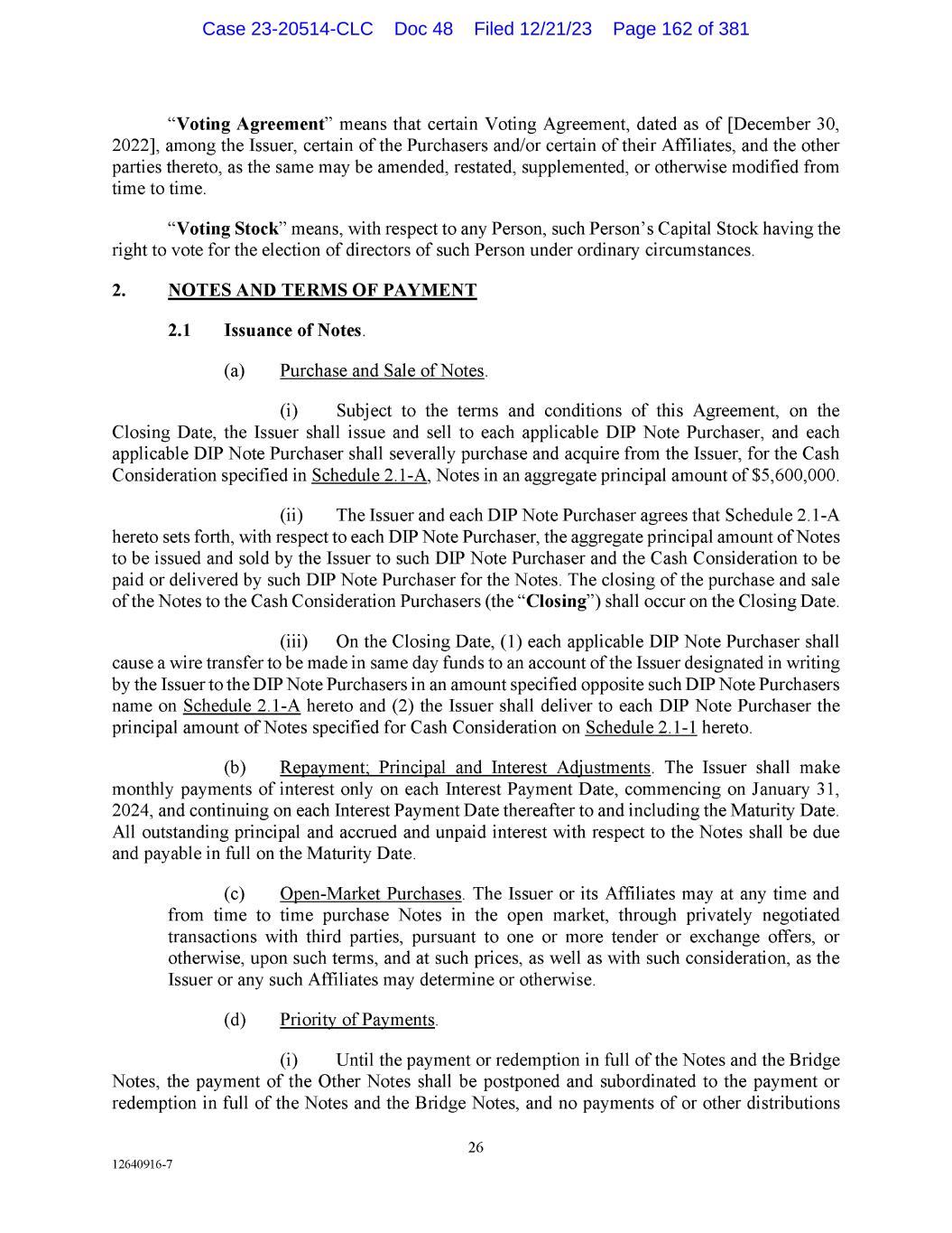 Term Lenders shall, upon satisfaction of the applicable conditions set forth in Article VI and pursuant to the other conditions set forth in this Article II, make available to the Borrower in same day funds an aggregate amount equal to the amount of such DIP Term Loans requested. All DIP Term Loan proceeds shall be used for working capital and general corporate purposes of Parent or any of its Subsidiaries, in each case in accordance with the Initial Approved Budget. (b) Each DIP Term Lender’s obligation shall be several, such that the failure of any DIP Term Lender to make available to the Borrower any funds in connection with any DIP Term Loan shall not relieve any other DIP Term Lender of its obligation, if any, hereunder to make funds available on the date such DIP Term Loans are requested (it being understood that no DIP Term Lender shall be responsible for the failure of any other DIP Term Lender to make funds available to the Borrower in connection with any DIP Term Loan hereunder). (c) The outstanding principal amount of all applicable DIP Term Loans shall become immediately due and payable in full on the DIP Term Loan Maturity Date. The Borrower may also repay the Loans in accordance with the terms of Section 2.03(e). (d) [Re served]. (e) The Borrower may from time to time, with at least two (2) Business Days prior delivery to the Administrative Agent of written notice, prepay the Loans in whole or in part, without premium or penalty; provided, however, that each such prepayment shall be in an amount equal to $100,000 or a higher integral multiple of $25,000 and shall be accompanied by any accrued and unpaid Interest on the amount prepaid and any applicable Fees. Principal payments shall continue in accordance with the Priority of Payments, except that notwithstanding the Priority of Payments, at the direction of the Borrower, optional payments by the Borrower may be applied first to the DIP Term Loans, second to the Rollup Amendment No. 1 Loans and third to the Rollup Bridge Loans. The Administrative Agent shall distribute to the Lenders (ratably, based on the amount then due and owing) any amounts received in respect of an optional prepayment in accordance with this Section 2.03(e). SECTION 2.04 Interest and Fees. (a) The DIP Term Loans and, upon the Rollup Effective Time, the Rollup Loans, shall accrue Interest on each day at the then applicable Interest Rate. The Borrower shall pay all Interest accrued during each Interest Period on tenth day of each calendar month (or if such date is not a Business Day, then on the next succeeding Business Day); provided that a portion of Interest equal to 9% per annum in respect of the DIP Term Loans and the Rollup Loans shall be paid in kind on the tenth day of each calendar month (or if such day is not a Business Day, on the next succeeding Business Day) by adding the amount thereof to the principal balance of the DIP Term Loans or Rollup Loans (as applicable) and from and after such time such amounts shall constitute principal for all amounts hereunder. Interest shall be paid in accordance with the Priority of Payments. (b) The Borrower shall pay to each DIP Term Lender and the Administrative Agent certain fees (collectively, the “Fees”) in the amounts set forth in the fee letter agreements among the Borrower, the Lenders, and the Administrative Agent (each as amended, restated, supplemented or otherwise modified from time to time, a “Fee Letter”). SECTION 2.05 Records of Loans. Each Lender shall record in its records the date and amount of the Loans made by such Lender hereunder, the Interest Rate with respect thereto, the Interest accrued thereon, and each repayment and payment thereof. Subject to Section 14.03(b). such records shall beprima facie evidence of the existence and amount of the obligations recorded therein. The failure to so record any 28 Case 23-20514-CLC Doc 48 Filed 12/21/23 Page 75 of 381