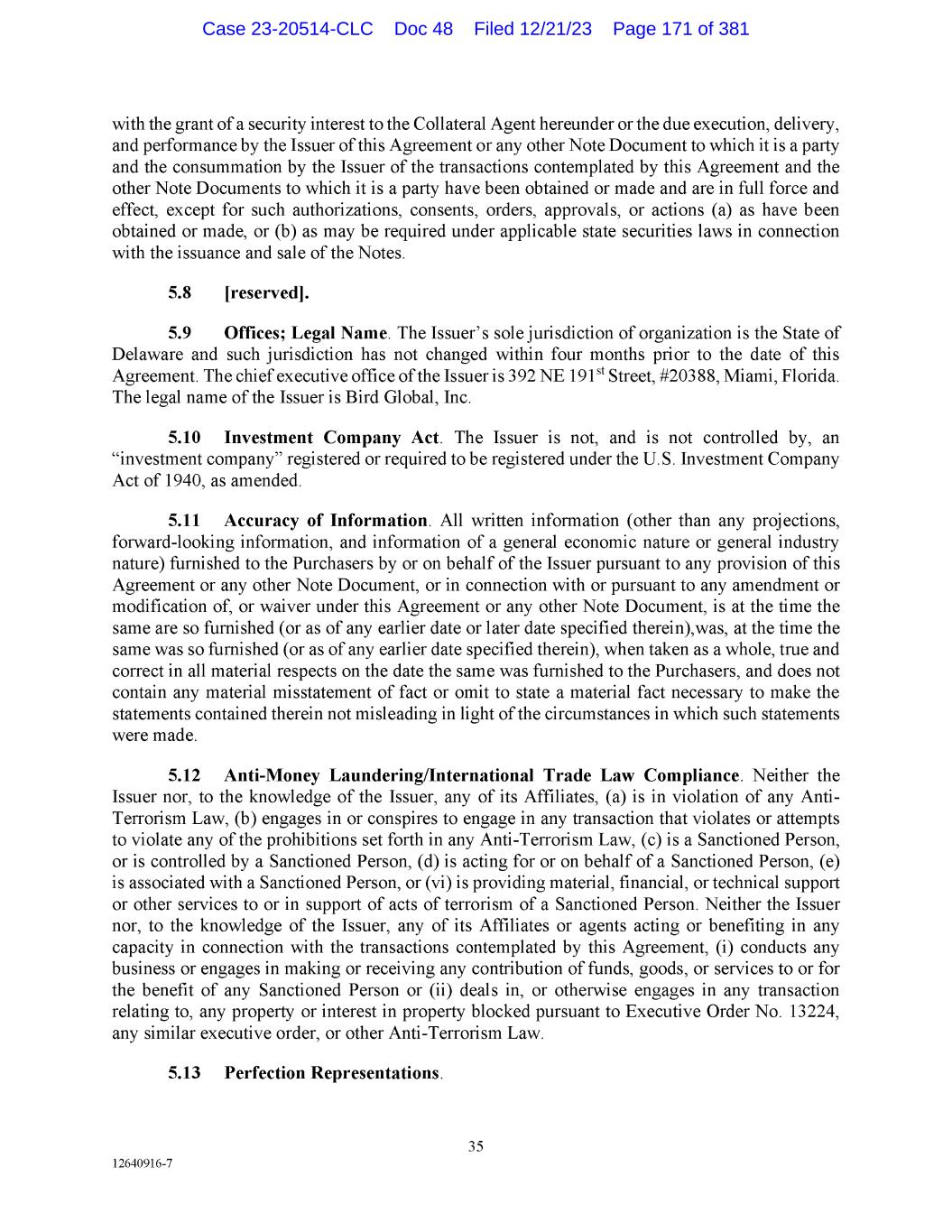 Sanctioned Person or (i) is convicted on, (ii) pleads nolo contendere to, (iii) is indicted on, or (iv) is arraigned and held over on charges involving money laundering or predicate crimes to money laundering. No Credit Party will, directly or indirectly, (i) conduct any business or engage in any transaction or dealing with any Sanctioned Person, including, without limitation, the making or receiving of any contribution of funds, goods or services to or for the benefit of any Sanctioned Person, (ii) deal in, or otherwise engage in any transaction relating to, any property or interests in property blocked pursuant to Executive Order No. 13224, any similar executive order or other Anti-Terrorism Law, or (iii) engage in or conspire to engage in any transaction that violates or attempts to violate any of the prohibitions set forth in Executive Order No. 13224 or other Anti-Terrorism Law. (s) [reserved] (t) Certificate of Title Acts. Bird OpCo will not operate and will not permit the Parent or any of its Subsidiaries to operate any of the scooters owned or operated by it in a jurisdiction in which the scooters may or are required to be registered under any certificate of title act or similar law, statute, or regulation. (u) Insurance. The Parent will keep the Parent’s and its Subsidiaries’ business and the Collateral insured for risks and in amounts standard for companies in the Parent’s and its Subsidiaries’ industry and location and as the Administrative Agent may reasonably request. Insurance policies shall be in a form, with companies, and in amounts that are reasonably satisfactory to the Administrative Agent. All property policies shall have a lender’s loss payable endorsement showing the Administrative Agent (for the ratable benefit of the Secured Parties) as lender loss payee and shall waive subrogation against the Administrative Agent, and all liability policies shall show, or have endorsements showing, the Administrative Agent (for the ratable benefit of the Secured Parties), as additional insured. Within no less than thirty (30) days after the Effective Date and at all times thereafter, the Administrative Agent shall be named as lender loss payee and/or additional insured with respect to any such insurance providing coverage in respect of any Collateral, and each provider of any such insurance shall agree, by endorsement upon the policy or policies issued by it or by independent instruments furnished to the Administrative Agent, that it will give the Administrative Agent 30 days (and 10 days for nonpayment of premium) prior written notice before any such policy or policies shall be canceled. At the reasonable request of the Administrative Agent, the Parent shall deliver to the Administrative Agent certified copies of policies and evidence of all premium payments. Subject to the Intercreditor Agreement, proceeds payable under any policy shall, at the option of the Administrative Agent, be payable to the Administrative Agent, for the ratable benefit of the Secured Parties, on account of the then-outstanding Borrower Obligations. If the Parent or any of its Subsidiaries fails to obtain insurance as required under this Section 8.01(u) or to pay any amount or furnish any required proof of payment to third persons, the Administrative Agent may make (but has no obligation to do so), at the Parent’s expense, all or part of such payment or obtain such insurance policies required in this Section 8,0Ku), and take any action under the policies the Administrative Agent deems prudent. (v) [reserved]. (w) Budget Testing. Subject to the terms and conditions set forth below, no Credit Party shall, nor shall it permit any of its Subsidiaries to, from and after the Effective Date, make any payment or otherwise disburse any funds or fail to collect revenues or funds in an amount, in each case, in a manner such that the unrestricted cash and Cash Equivalents of the Credit Parties and their Subsidiaries is less than the amount set forth in each Approved Budget for any Budget Testing Period, subject to the Permitted Variance; provided that this provision shall disregard non-recurring one-time receipts and/or disbursements. 49 Case 23-20514-CLC Doc 48 Filed 12/21/23 Page 96 of 381