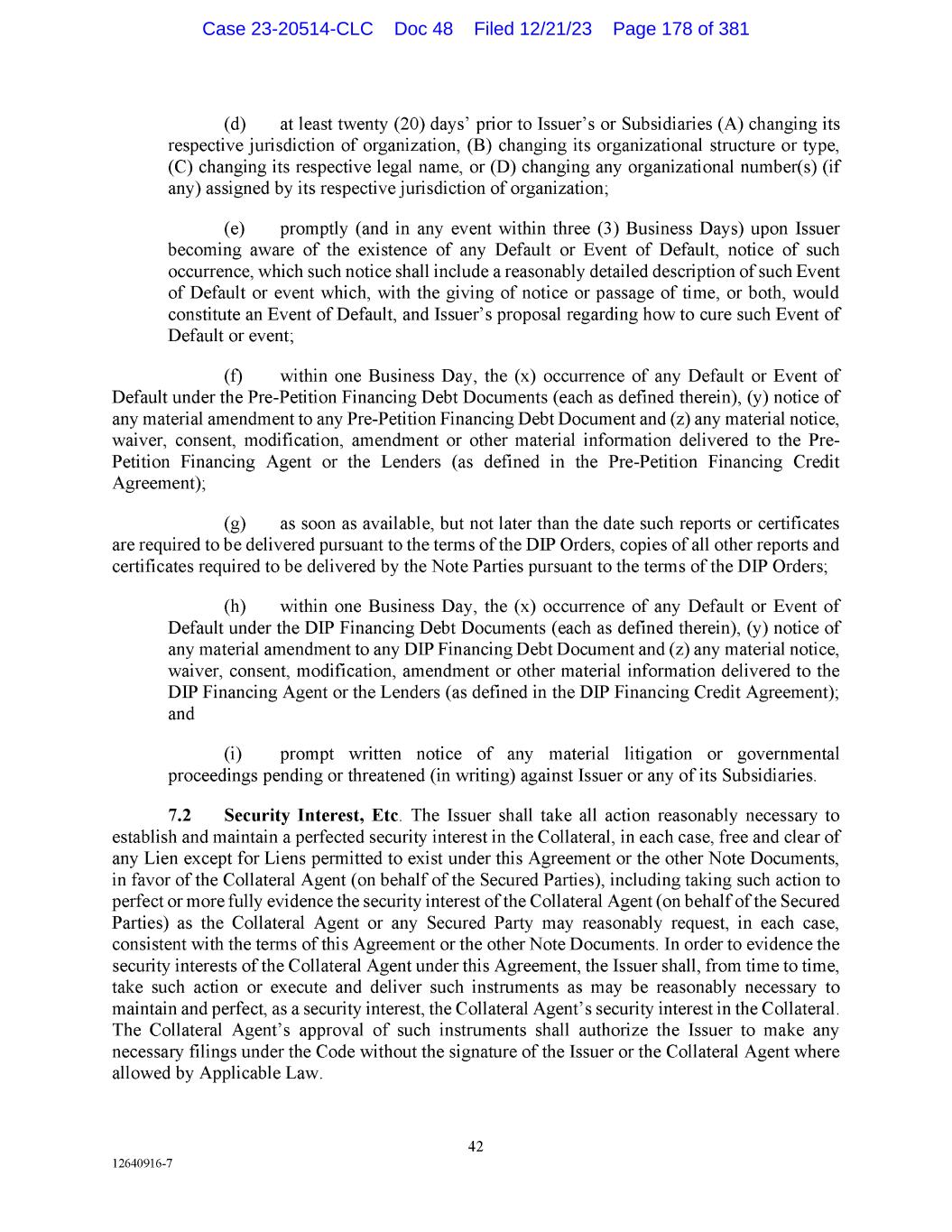 file such financing statements under the UCC without the signature of the Credit Parties or the Administrative Agent where allowed by Applicable Law. Notwithstanding anything else in the Transaction Documents to the contrary, the Credit Parties shall not have any authority to file a termination, partial termination, release, partial release, or any amendment that deletes the name of a debtor or excludes collateral of any such financing statements filed in connection with the Transaction Documents, without the prior written consent of the Administrative Agent. (l) Certain Agreements. Without the prior written consent of the Administrative Agent and the Lenders, the Credit Parties will not (and will not permit the Parent or the other Credit Parties to) (x) amend, modify, waive, revoke or terminate any Transaction Document or any provision of their organizational documents, or (y) exercise any remedies in respect of the Transaction Documents. (m) [reservedl. (n) [reservedl. (o) Change in Name or Jurisdiction of Origination, etc. (i) The Credit Parties shall not (nor shall they allow any other Credit Party to) take any action to change their jurisdiction of organization. (ii) The Credit Parties will not (nor will they allow any other Credit Party to) change their respective name, location, identity or corporate structure unless (w) such Credit Party provides the Administrative Agent and Lenders at least thirty (30) days prior notice thereof, (x) such Credit Party, at its own expense, shall have taken all action necessary to perfect or maintain the perfection of the security interest under this Agreement (including, without limitation, the filing of all financing statements and the taking of such other action as the Administrative Agent may request in connection with such change or relocation), (y) the Administrative Agent and the Lenders have consented thereto in writing, and (z) if requested by the Administrative Agent, such Credit Party shall cause to be delivered to the Administrative Agent, an opinion, in form and substance satisfactory to the Administrative Agent as to such UCC perfection and priority matters as the Administrative Agent may request at such time. (p) Taxes. Parent will, and will cause each of its Subsidiaries to, (i) timely file all material tax returns (foreign, federal, state and local) required to be filed by it and (ii) pay, or cause to be paid, all material taxes, assessments and other governmental charges, if any, other than taxes, assessments and other governmental charges being contested in good faith by appropriate proceedings and as to which adequate reserves have been provided in accordance with GAAP. (q) [Reserved]. (r) Compliance with Anti-Terrorism Laws. The Administrative Agent hereby notifies the Credit Parties that pursuant to the requirements of Anti-Terrorism Laws, and the Administrative Agent’s policies and practices, the Administrative Agent is required to obtain, verify and record certain information and documentation that identifies the Credit Parties and their respective principals, which information includes the name and address of each Credit Party and its principals and such other information that will allow Agent to identify such party in accordance with Anti-Terrorism Laws. No Credit Party will, directly or indirectly, knowingly enter into any contract with any Sanctioned Person or any Person listed on the OFAC Lists. Each Credit Party shall immediately notify the Administrative Agent if such Credit Party has actual knowledge that any Credit Party or any of their respective Affiliates or agents acting or benefiting in any capacity in connection with the transactions contemplated by this Agreement is or becomes a 48 Case 23-20514-CLC Doc 48 Filed 12/21/23 Page 95 of 381