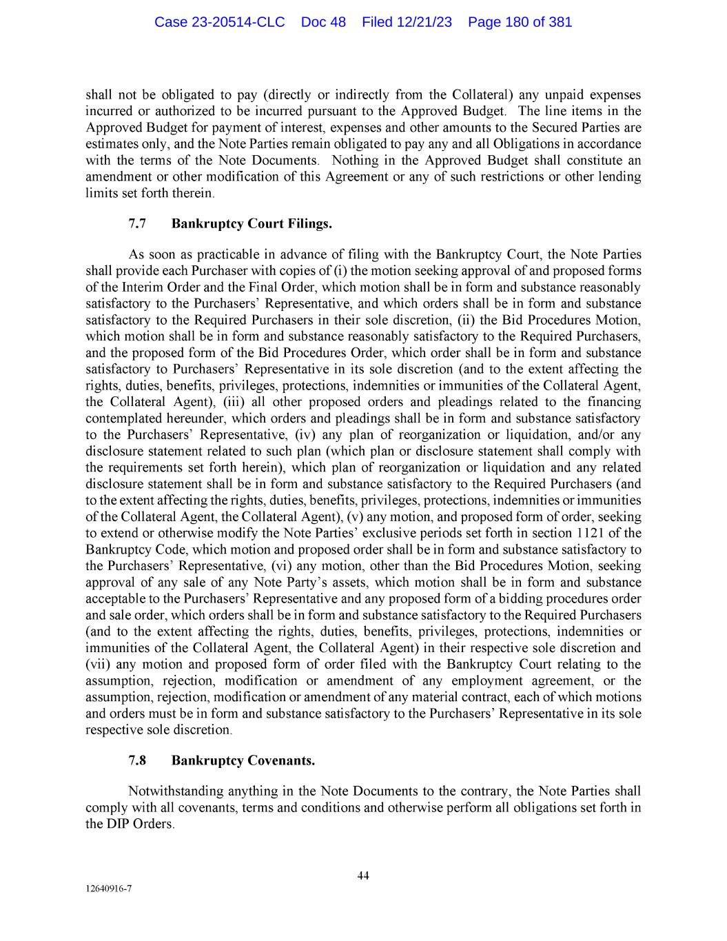 The Administrative Agent and Lenders (i) may assume that the Credit Parties will comply with the Approved Budget to the extent required by this clause (s) and shall have no duty to monitor such compliance and (ii) shall not be obligated to pay (directly or indirectly from the Collateral) any unpaid expenses incurred or authorized to be incurred pursuant to the Approved Budget. The line items in the Approved Budget for payment of interest, expenses and other amounts to Administrative Agent and Lenders are estimates only, and the Credit Parties remain obligated to pay any and all Borrower Obligations in accordance with the terms of the Transaction Documents. Nothing in the Approved Budget shall constitute an amendment or other modification of this Agreement or any of such restrictions or other lending limits set forth therein. (x) Bankruptcy Court Filings. As soon as practicable in advance of filing with the Bankruptcy Court, the Credit Parties shall provide the Administrative Agent with copies of (i) the motion seeking approval of and proposed forms of the Interim Order and the Final Order, which motion shall be in form and substance reasonably satisfactory to the Administrative Agent, and which orders shall be in form and substance satisfactory to the Administrative Agent and the Required DIP Lenders in their sole discretion, (ii) the Bid Procedures Motion, which motion shall be in form and substance reasonably satisfactory to the Administrative Agent, and the proposed form of the Bid Procedures Order, which order shall be in form and substance satisfactory to Administrative Agent in its sole discretion, (iii) all other proposed orders and pleadings related to the financing contemplated hereunder, which orders and pleadings shall be in form and substance satisfactory to the Administrative Agent, (iv) any plan of reorganization or liquidation, and/or any disclosure statement related to such plan (which plan or disclosure statement shall comply with the requirements set forth herein), which plan of reorganization or liquidation and any related disclosure statement shall be in form and substance satisfactory to Administrative Agent and the Required DIP Lenders, (v) any motion, and proposed form of order, seeking to extend or otherwise modify the Credit Parties' exclusive periods set forth in section 1121 of the Bankruptcy Code, which motion and proposed order shall be in form and substance satisfactory to Administrative Agent, (vi) any motion, other than the Bid Procedures Motion, seeking approval of any sale of any Credit Party's assets, which motion shall be in form and substance acceptable to the Administrative Agent and any proposed form of a bidding procedures order and sale order, which orders shall be in form and substance satisfactory to the Administrative Agent and the Required DIP Lenders in their respective sole discretion and (vii) any motion and proposed form of order filed with the Bankruptcy Court relating to the assumption, rejection, modification or amendment of any employment agreement, or the assumption, rejection, modification or amendment of any material contract, each of which motions and orders must be in form and substance satisfactory to the Administrative Agent in its sole respective sole discretion. (y) Bankruptcy Covenants. Notwithstanding anything in the Transaction Documents to the contrary, the Credit Parties shall comply with all covenants, terms and conditions and otherwise perform all obligations set forth in the DIP Orders. (z) Chapter 11 Cases. In connection with the Chapter 11 Cases, the Credit Parties shall give the proper notice for (i) the motions seeking approval of the Transaction Documents and the Interim Order and Final Order, (ii) the hearings for the approval of the Interim Order, (iii) the hearings for the approval of the Final Order, (iv) the motions seeking approval of the sale of all or substantially all of the assets or the Equity Interests of the Credit Parties and (v) the hearings for the approval of the sale of all or substantially all of the assets or the Equity Interests of the Credit Parties. The Credit Parties shall give, on a timely basis as specified in the Interim Order or the Final Order, as applicable, all notices required to be given to all parties specified in the Interim Order or Final Order, as applicable. (aa) Sales Process Timeline. The Credit Parties shall timely comply with the sale process milestones set forth in the DIP Orders and shall incorporate such milestones into a bidding procedures motion and order, each of which shall be in form and substance acceptable to the Administrative Agent (the “Bid Procedures Motion" and “Bid Procedures Order", respectively). Promptly upon receipt by 50 Case 23-20514-CLC Doc 48 Filed 12/21/23 Page 97 of 381