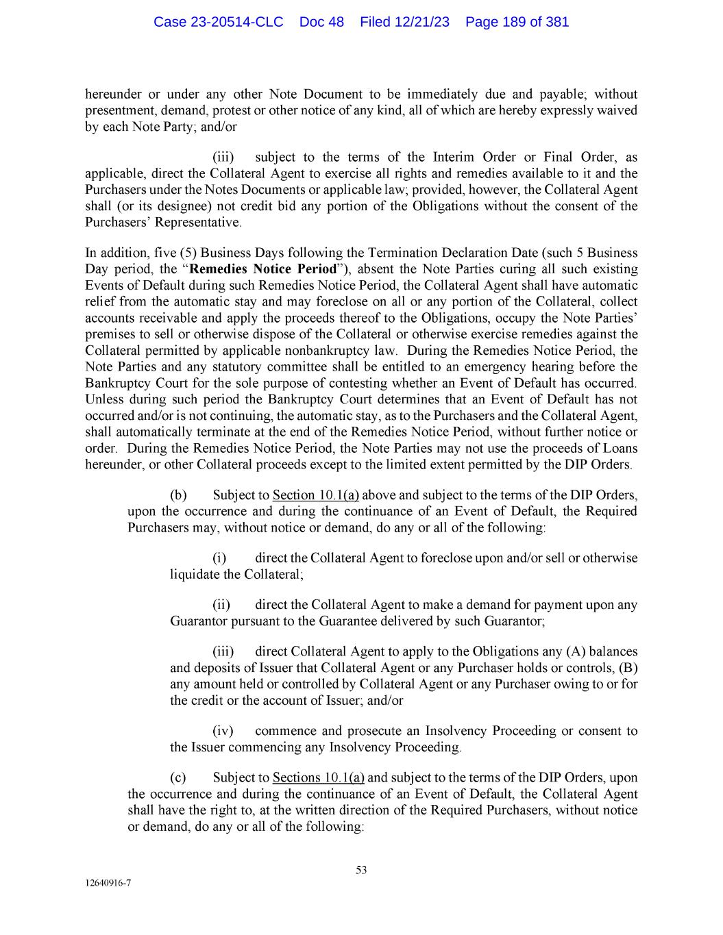 obligations with respect to which the Bankruptcy Code prohibits the Credit Parties from complying or permits the Credit Parties not to comply. (v) Bankruptcy Matters. (i) The Chapter 11 Cases were commenced on the Petition Date in accordance with applicable law and proper notice thereof and the proper notice, to the extent given or required to be given prior to the date hereof, was given for (x) the motions seeking approval of the Transaction Documents and the Interim Order and Final Order, (y) the hearings for the approval of the Interim Order, and (z) the hearings for the approval of the Final Order. (ii) From and after the entry of the Interim Order, and pursuant to and to the extent permitted in the Interim Order and the Final Order, the Borrower Obligations will constitute allowed administrative expenses in the Chapter 11 Cases having priority over all administrative expenses and unsecured claims against the Credit Parties as set forth in the DIP Orders. (hi) From and after the entry of the Interim Order and pursuant to and to the extent provided in the Interim Order and the Final Order, the Borrower Obligations will be secured by a valid and perfected first priority lien on all of the Collateral, subject, as to priority only, to the Carve-Out and the Pre-Petition Prior Liens, as set forth in the DIP Orders. (iv) The Interim Order (with respect to the period prior to entry of the Final Order) or the Final Order (with respect to the period on and after entry of the Final Order), as the case may be, is in full force and effect has not been reversed, stayed, modified or amended without the Administrative Agent’s and Required DIP Lenders’ consent in their sole discretion. (w) Other Transaction Documents. Each representation and warranty made by the Credit Parties under each other Transaction Document to which it is a party is true and correct in all material respects as of the date when made. ARTICLEVIII COVENANTS SECTION 8.01 Affirmative Covenants of the Credit Parties. At all times from the Effective Date until the Final Payout Date: (a) Payment of Principal and Interest. The Borrower shall duly and punctually pay Interest, Fees, principal of the Loans, and all other amounts payable by the Borrower hereunder in accordance with the terms of this Agreement. (b) Existence. Parent shall, and shall cause each of its Subsidiaries to, keep in full force and effect its existence and rights as a duly organized entity under applicable law, and shall obtain and preserve its qualification to do business in each jurisdiction in which such qualification is or shall be necessary to protect the validity and enforceability of this Agreement, the other Transaction Documents and the Collateral, except where failure to maintain such qualification could not reasonably be expected to have a Material Adverse Effect. 44 Case 23-20514-CLC Doc 48 Filed 12/21/23 Page 91 of 381