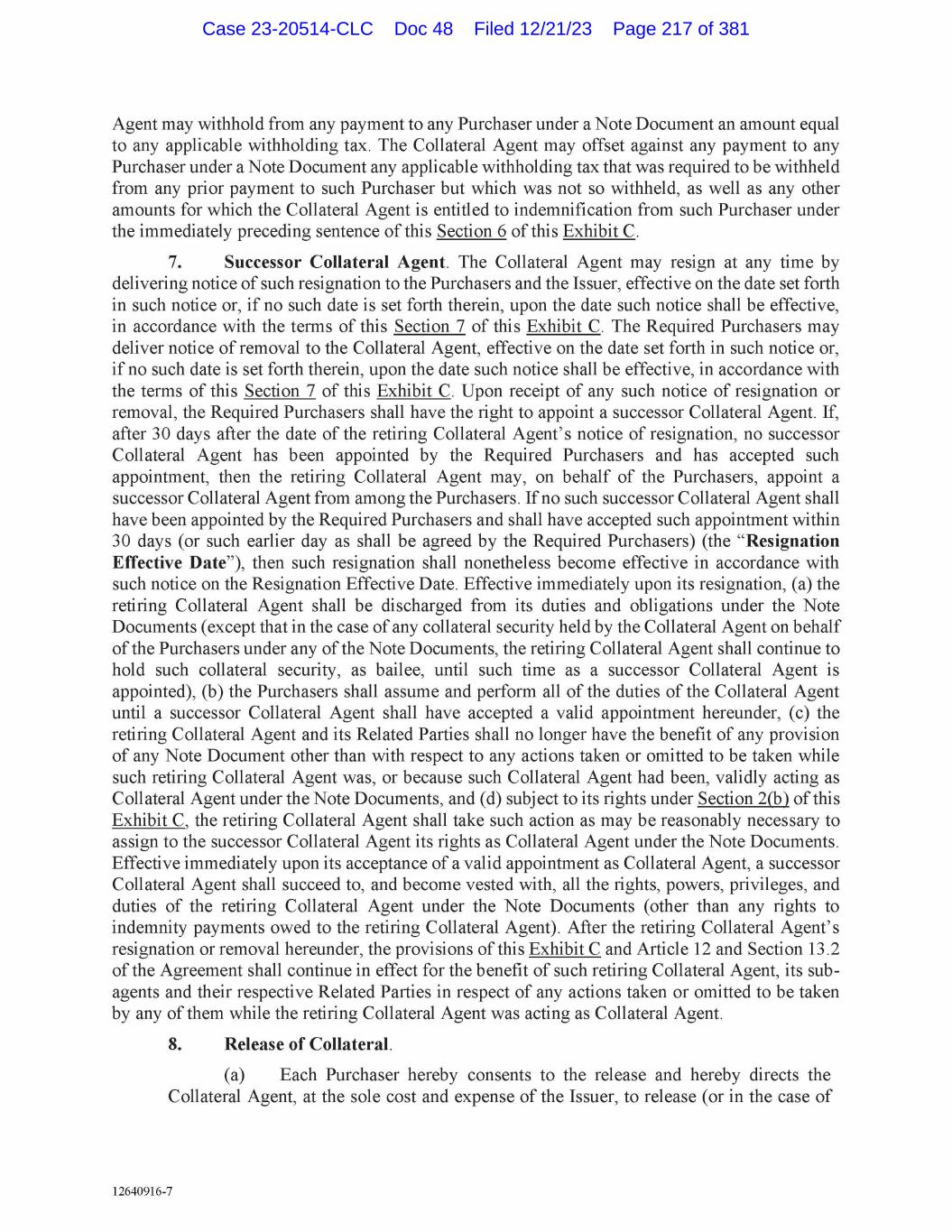 recipient) on or prior to the date on which such Foreign Lender becomes a Lender under this Agreement (and from time to time thereafter upon the reasonable request of the Borrower or the Administrative Agent), executed copies of any other form prescribed by Applicable Law as a basis for claiming exemption from or a reduction in U.S. Federal withholding Tax, duly completed, together with such supplementary documentation as may be prescribed by Applicable Law to permit the Borrower or Administrative Agent to determine the withholding or deduction required to be made. (iv) The Administrative Agent shall deliver to the Borrower, on or prior to the date on which it becomes a party to this Agreement, a duly completed IRS Form W-9, with the effect that the Borrower may make payments to the Administrative Agent, to the extent such payments are received by the Administrative Agent as an intermediary, without deduction or withholding of any Taxes imposed by the United States (and the Administrative Agent will serve as a U.S. withholding agent (and complete associated reporting responsibilities) with respect to Chapter 3 and Chapter 4 withholding on amounts paid to the Administrative Agent in respect of the Loans (or any other amounts payable hereunder). (e) Treatment of Certain Refunds. If any Lender determines, in its sole discretion exercised in good faith, that it has received a refund in respect of any Taxes as to which it has been indemnified by the Borrower or other Credit Party pursuant to this Section 5,3 (including by the payment of additional amounts pursuant to this Section 5,3), then it shall promptly pay an amount equal to such refund to the Borrower or other Credit Party, net of all reasonable out-of-pocket expenses of such Lender or of the Administrative Agent with respect thereto, including any Taxes; provided, however, that the Borrower or other Credit Party, upon the written request of such Lender or the Administrative Agent, agrees to repay any amount paid over to the Borrower or other Credit Party to such Lender or to the Administrative Agent (plus any related penalties, interest or other charges imposed by the relevant Governmental Authority) in the event such Lender or the Administrative Agent is required, for any reason, to disgorge or otherwise repay such refund. Notwithstanding anything to the contrary in this Section 5,3, in no event will the indemnified party be required to pay any amount to an indemnifying party pursuant to this Section 5.3(e) the payment of which would place the indemnified party in a less favorable net after-Tax position than the indemnified party would have been in if the Tax subject to indemnification and giving rise to such refund had not been deducted, withheld or otherwise imposed and the indemnification payments or additional amounts with respect to such Tax had never been paid. This Section 5,3 shall not be construed to require any indemnified party to make available its Tax returns (or any other information relating to its Taxes that it deems confidential) to the indemnifying party or any other Person. (f) Documentation Required by FATCA. If a payment made to an Affected Person under any Transaction Document would be subject to U.S. federal withholding tax imposed by FATCA if such Affected Person were to fail to comply with the applicable reporting requirements of FATCA (including those contained in Section 1471(b) or 1472(b) of the Code, as applicable), such Affected Person shall deliver to the Borrower and the Administrative Agent at the time or times prescribed by Applicable Law and at such time or times reasonably requested by the Borrower or Administrative Agent such documentation prescribed by Applicable Law (including as prescribed by Section 147 l(b)(3)(C)(i) of the Code) and such additional documentation reasonably requested by the Borrower or the Administrative Agent as may be necessary for the Borrower and the Administrative Agent to comply with their obligations under FATCA and to determine that such Affected Person has complied with its obligations under FATCA or to determine the amount to deduct and withhold from such payment. Solely for purposes of this clause (f), “FATCA” shall include any amendments made to FATCA after the date of this Agreement. (g) Indemnification by the Lenders. Each Lender shall severally indemnify the Administrative Agent, within ten (10) days after demand therefor, for (i) any Indemnified Taxes attributable 37 Case 23-20514-CLC Doc 48 Filed 12/21/23 Page 84 of 381