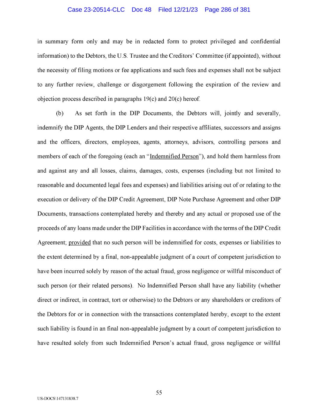 in summary form only and may be in redacted form to protect privileged and confidential information) to the Debtors, the U.S. Trustee and the Creditors’ Committee (if appointed), without the necessity of filing motions or fee applications and such fees and expenses shall not be subject to any further review, challenge or disgorgement following the expiration of the review and objection process described in paragraphs 19(c) and 20(c) hereof. (b) As set forth in the DIP Documents, the Debtors will, jointly and severally, indemnify the DIP Agents, the DIP Lenders and their respective affiliates, successors and assigns and the officers, directors, employees, agents, attorneys, advisors, controlling persons and members of each of the foregoing (each an “Indemnified Person”), and hold them harmless from and against any and all losses, claims, damages, costs, expenses (including but not limited to reasonable and documented legal fees and expenses) and liabilities arising out of or relating to the execution or delivery of the DIP Credit Agreement, DIP Note Purchase Agreement and other DIP Documents, transactions contemplated hereby and thereby and any actual or proposed use of the proceeds of any loans made under the DIP Facilities in accordance with the terms of the DIP Credit Agreement; provided that no such person will be indemnified for costs, expenses or liabilities to the extent determined by a final, non-appealable judgment of a court of competent jurisdiction to have been incurred solely by reason of the actual fraud, gross negligence or willful misconduct of such person (or their related persons). No Indemnified Person shall have any liability (whether direct or indirect, in contract, tort or otherwise) to the Debtors or any shareholders or creditors of the Debtors for or in connection with the transactions contemplated hereby, except to the extent such liability is found in an final non-appealable judgment by a court of competent jurisdiction to have resulted solely from such Indemnified Person’s actual fraud, gross negligence or willful US-DOCS\147131838.7 55 Case 23-20514-CLC Doc 48 Filed 12/21/23 Page 286 of 381
