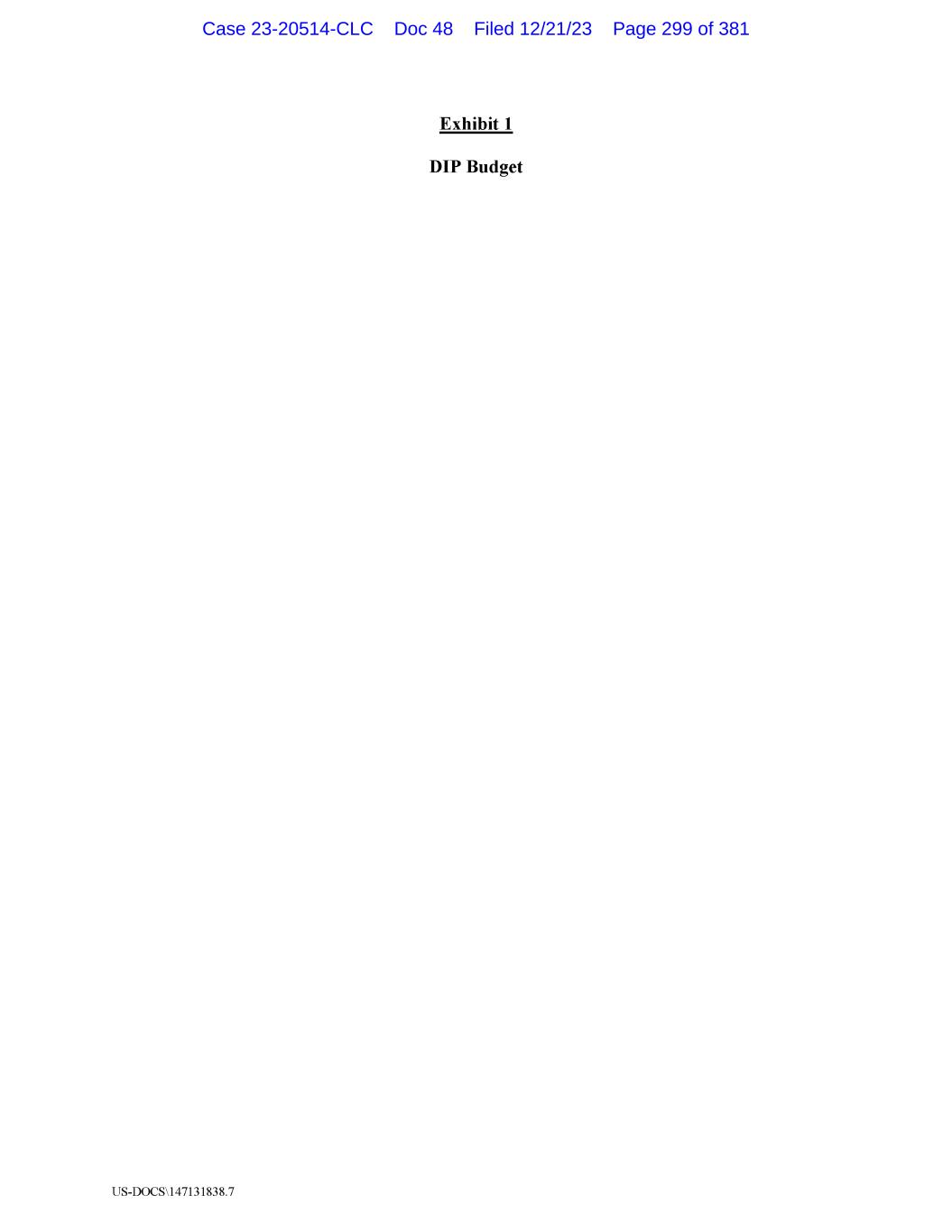 Exhibit 1 DIP Budget US-DOCS\147131838.7 Case 23-20514-CLC Doc 48 Filed 12/21/23 Page 299 of 381