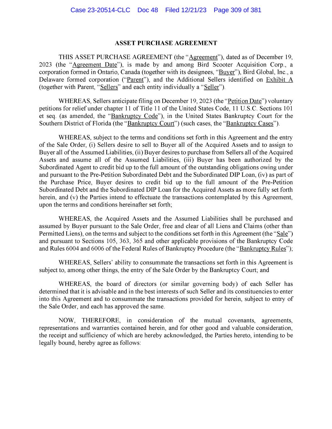 ASSET PURCHASE AGREEMENT THIS ASSET PURCHASE AGREEMENT (the “Agreement”), dated as of December 19, 2023 (the “Agreement Date”), is made by and among Bird Scooter Acquisition Corp., a corporation formed in Ontario, Canada (together with its designees, “Buyer”), Bird Global, Inc., a Delaware formed corporation (“Parent”), and the Additional Sellers identified on Exhibit A (together with Parent, “Sellers” and each entity individually a “Seller”). WHEREAS, Sellers anticipate filing on December 19, 2023 (the “Petition Date”) voluntary petitions for relief under chapter 11 of Title 11 of the United States Code, 11 U.S.C. Sections 101 et seq. (as amended, the “Bankruptcy Code”), in the United States Bankruptcy Court for the Southern District of Florida (the “Bankruptcy Court”) (such cases, the “Bankruptcy Cases”). WHEREAS, subject to the terms and conditions set forth in this Agreement and the entry of the Sale Order, (i) Sellers desire to sell to Buyer all of the Acquired Assets and to assign to Buyer all of the Assumed Liabilities, (ii) Buyer desires to purchase from Sellers all of the Acquired Assets and assume all of the Assumed Liabilities, (iii) Buyer has been authorized by the Subordinated Agent to credit bid up to the full amount of the outstanding obligations owing under and pursuant to the Pre-Petition Subordinated Debt and the Subordinated DIP Loan, (iv) as part of the Purchase Price, Buyer desires to credit bid up to the full amount of the Pre-Petition Subordinated Debt and the Subordinated DIP Loan for the Acquired Assets as more fully set forth herein, and (v) the Parties intend to effectuate the transactions contemplated by this Agreement, upon the terms and conditions hereinafter set forth; WHEREAS, the Acquired Assets and the Assumed Liabilities shall be purchased and assumed by Buyer pursuant to the Sale Order, free and clear of all Liens and Claims (other than Permitted Liens), on the terms and subject to the conditions set forth in this Agreement (the “Sale”) and pursuant to Sections 105, 363, 365 and other applicable provisions of the Bankruptcy Code and Rules 6004 and 6006 of the Federal Rules of Bankruptcy Procedure (the “Bankruptcy Rules”); WHEREAS, Sellers’ ability to consummate the transactions set forth in this Agreement is subject to, among other things, the entry of the Sale Order by the Bankruptcy Court; and WHEREAS, the board of directors (or similar governing body) of each Seller has determined that it is advisable and in the best interests of such Seller and its constituencies to enter into this Agreement and to consummate the transactions provided for herein, subject to entry of the Sale Order, and each has approved the same. NOW, THEREFORE, in consideration of the mutual covenants, agreements, representations and warranties contained herein, and for other good and valuable consideration, the receipt and sufficiency of which are hereby acknowledged, the Parties hereto, intending to be legally bound, hereby agree as follows: Case 23-20514-CLC Doc 48 Filed 12/21/23 Page 309 of 381