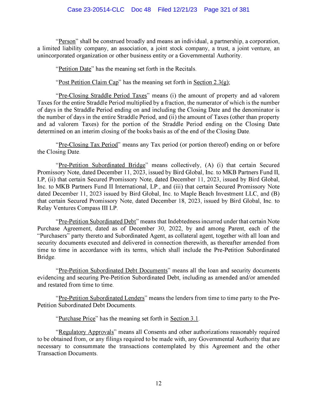 “Person” shall be construed broadly and means an individual, a partnership, a corporation, a limited liability company, an association, a joint stock company, a trust, a joint venture, an unincorporated organization or other business entity or a Governmental Authority. “Petition Date” has the meaning set forth in the Recitals. “Post Petition Claim Cap” has the meaning set forth in Section 2.3(g); “Pre-Closing Straddle Period Taxes” means (i) the amount of property and ad valorem Taxes for the entire Straddle Period multiplied by a fraction, the numerator of which is the number of days in the Straddle Period ending on and including the Closing Date and the denominator is the number of days in the entire Straddle Period, and (ii) the amount of Taxes (other than property and ad valorem Taxes) for the portion of the Straddle Period ending on the Closing Date determined on an interim closing of the books basis as of the end of the Closing Date. “Pre-Closing Tax Period” means any Tax period (or portion thereof) ending on or before the Closing Date. “Pre-Petition Subordinated Bridge” means collectively, (A) (i) that certain Secured Promissory Note, dated December 11, 2023, issued by Bird Global, Inc. to MKB Partners Fund II, LP, (ii) that certain Secured Promissory Note, dated December 11, 2023, issued by Bird Global, Inc. to MKB Partners Fund II International, LP., and (iii) that certain Secured Promissory Note dated December 11, 2023 issued by Bird Global, Inc. to Maple Beach Investment LLC, and (B) that certain Secured Promissory Note, dated December 18, 2023, issued by Bird Global, Inc. to Relay Ventures Compass III LP. “Pre-Petition Subordinated Debt” means that Indebtedness incurred under that certain Note Purchase Agreement, dated as of December 30, 2022, by and among Parent, each of the “Purchasers” party thereto and Subordinated Agent, as collateral agent, together with all loan and security documents executed and delivered in connection therewith, as thereafter amended from time to time in accordance with its terms, which shall include the Pre-Petition Subordinated Bridge. “Pre-Petition Subordinated Debt Documents” means all the loan and security documents evidencing and securing Pre-Petition Subordinated Debt, including as amended and/or amended and restated from time to time. “Pre-Petition Subordinated Lenders” means the lenders from time to time party to the Pre Petition Subordinated Debt Documents. “Purchase Price” has the meaning set forth in Section 3,1. “Regulatory Approvals” means all Consents and other authorizations reasonably required to be obtained from, or any filings required to be made with, any Governmental Authority that are necessary to consummate the transactions contemplated by this Agreement and the other Transaction Documents. 12 Case 23-20514-CLC Doc 48 Filed 12/21/23 Page 321 of 381