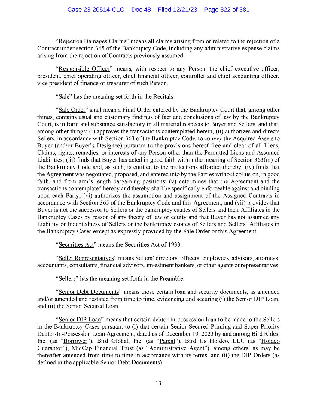 “Rejection Damages Claims” means all claims arising from or related to the rejection of a Contract under section 365 of the Bankruptcy Code, including any administrative expense claims arising from the rejection of Contracts previously assumed. “Responsible Officer” means, with respect to any Person, the chief executive officer, president, chief operating officer, chief financial officer, controller and chief accounting officer, vice president of finance or treasurer of such Person. “Sale” has the meaning set forth in the Recitals. “Sale Order” shall mean a Final Order entered by the Bankruptcy Court that, among other things, contains usual and customary findings of fact and conclusions of law by the Bankruptcy Court, is in form and substance satisfactory in all material respects to Buyer and Sellers, and that, among other things: (i) approves the transactions contemplated herein; (ii) authorizes and directs Sellers, in accordance with Section 363 of the Bankruptcy Code, to convey the Acquired Assets to Buyer (and/or Buyer’s Designee) pursuant to the provisions hereof free and clear of all Liens, Claims, rights, remedies, or interests of any Person other than the Permitted Liens and Assumed Liabilities; (iii) finds that Buyer has acted in good faith within the meaning of Section 363(m) of the Bankruptcy Code and, as such, is entitled to the protections afforded thereby; (iv) finds that the Agreement was negotiated, proposed, and entered into by the Parties without collusion, in good faith, and from arm’s length bargaining positions; (v) determines that the Agreement and the transactions contemplated hereby and thereby shall be specifically enforceable against and binding upon each Party; (vi) authorizes the assumption and assignment of the Assigned Contracts in accordance with Section 365 of the Bankruptcy Code and this Agreement; and (vii) provides that Buyer is not the successor to Sellers or the bankruptcy estates of Sellers and their Affiliates in the Bankruptcy Cases by reason of any theory of law or equity and that Buyer has not assumed any Liability or Indebtedness of Sellers or the bankruptcy estates of Sellers and Sellers’ Affiliates in the Bankruptcy Cases except as expressly provided by the Sale Order or this Agreement. “Securities Act” means the Securities Act of 1933. “Seller Representatives” means Sellers’ directors, officers, employees, advisors, attorneys, accountants, consultants, financial advisors, investment bankers, or other agents or representatives. “Sellers” has the meaning set forth in the Preamble. “Senior Debt Documents” means those certain loan and security documents, as amended and/or amended and restated from time to time, evidencing and securing (i) the Senior DIP Loan, and (ii) the Senior Secured Loan. “Senior DIP Loan” means that certain debtor-in-possession loan to be made to the Sellers in the Bankruptcy Cases pursuant to (i) that certain Senior Secured Priming and Super-Priority Debtor-In-Possession Loan Agreement, dated as of December 19, 2023 by and among Bird Rides, Inc. (as “Borrower”), Bird Global, Inc. (as “Parent”), Bird Us Holdco, LLC (as “Holdco Guarantor”), MidCap Financial Trust (as “Administrative Agent”), among others, as may be thereafter amended from time to time in accordance with its terms, and (ii) the DIP Orders (as defined in the applicable Senior Debt Documents). 13 Case 23-20514-CLC Doc 48 Filed 12/21/23 Page 322 of 381