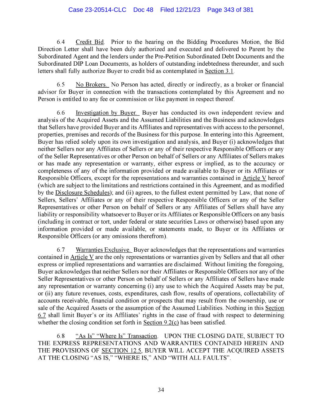 6.4 Credit Bid. Prior to the hearing on the Bidding Procedures Motion, the Bid Direction Letter shall have been duly authorized and executed and delivered to Parent by the Subordinated Agent and the lenders under the Pre-Petition Subordinated Debt Documents and the Subordinated DIP Loan Documents, as holders of outstanding indebtedness thereunder, and such letters shall fully authorize Buyer to credit bid as contemplated in Section 3,1. 6.5 No Brokers. No Person has acted, directly or indirectly, as a broker or financial advisor for Buyer in connection with the transactions contemplated by this Agreement and no Person is entitled to any fee or commission or like payment in respect thereof. 6.6 Investigation by Buyer. Buyer has conducted its own independent review and analysis of the Acquired Assets and the Assumed Liabilities and the Business and acknowledges that Sellers have provided Buyer and its Affiliates and representatives with access to the personnel, properties, premises and records of the Business for this purpose. In entering into this Agreement, Buyer has relied solely upon its own investigation and analysis, and Buyer (i) acknowledges that neither Sellers nor any Affiliates of Sellers or any of their respective Responsible Officers or any of the Seller Representatives or other Person on behalf of Sellers or any Affiliates of Sellers makes or has made any representation or warranty, either express or implied, as to the accuracy or completeness of any of the information provided or made available to Buyer or its Affiliates or Responsible Officers, except for the representations and warranties contained in Article V hereof (which are subject to the limitations and restrictions contained in this Agreement, and as modified by the Disclosure Schedules); and (ii) agrees, to the fullest extent permitted by Law, that none of Sellers, Sellers’ Affiliates or any of their respective Responsible Officers or any of the Seller Representatives or other Person on behalf of Sellers or any Affiliates of Sellers shall have any liability or responsibility whatsoever to Buyer or its Affiliates or Responsible Officers on any basis (including in contract or tort, under federal or state securities Laws or otherwise) based upon any information provided or made available, or statements made, to Buyer or its Affiliates or Responsible Officers (or any omissions therefrom). 6.7 Warranties Exclusive. Buyer acknowledges that the representations and warranties contained in Article V are the only representations or warranties given by Sellers and that all other express or implied representations and warranties are disclaimed. Without limiting the foregoing, Buyer acknowledges that neither Sellers nor their Affiliates or Responsible Officers nor any of the Seller Representatives or other Person on behalf of Sellers or any Affiliates of Sellers have made any representation or warranty concerning (i) any use to which the Acquired Assets may be put, or (ii) any future revenues, costs, expenditures, cash flow, results of operations, collectability of accounts receivable, financial condition or prospects that may result from the ownership, use or sale of the Acquired Assets or the assumption of the Assumed Liabilities. Nothing in this Section 6,7 shall limit Buyer’s or its Affiliates’ rights in the case of fraud with respect to determining whether the closing condition set forth in Section 9.2(c) has been satisfied. 6.8 “As Is” “Where Is” Transaction. UPON THE CLOSING DATE, SUBJECT TO THE EXPRESS REPRESENTATIONS AND WARRANTIES CONTAINED HEREIN AND THE PROVISIONS OF SECTION 12,5, BUYER WILL ACCEPT THE ACQUIRED ASSETS AT THE CLOSING “AS IS,” “WHERE IS,” AND “WITH ALL FAULTS”. 34 Case 23-20514-CLC Doc 48 Filed 12/21/23 Page 343 of 381