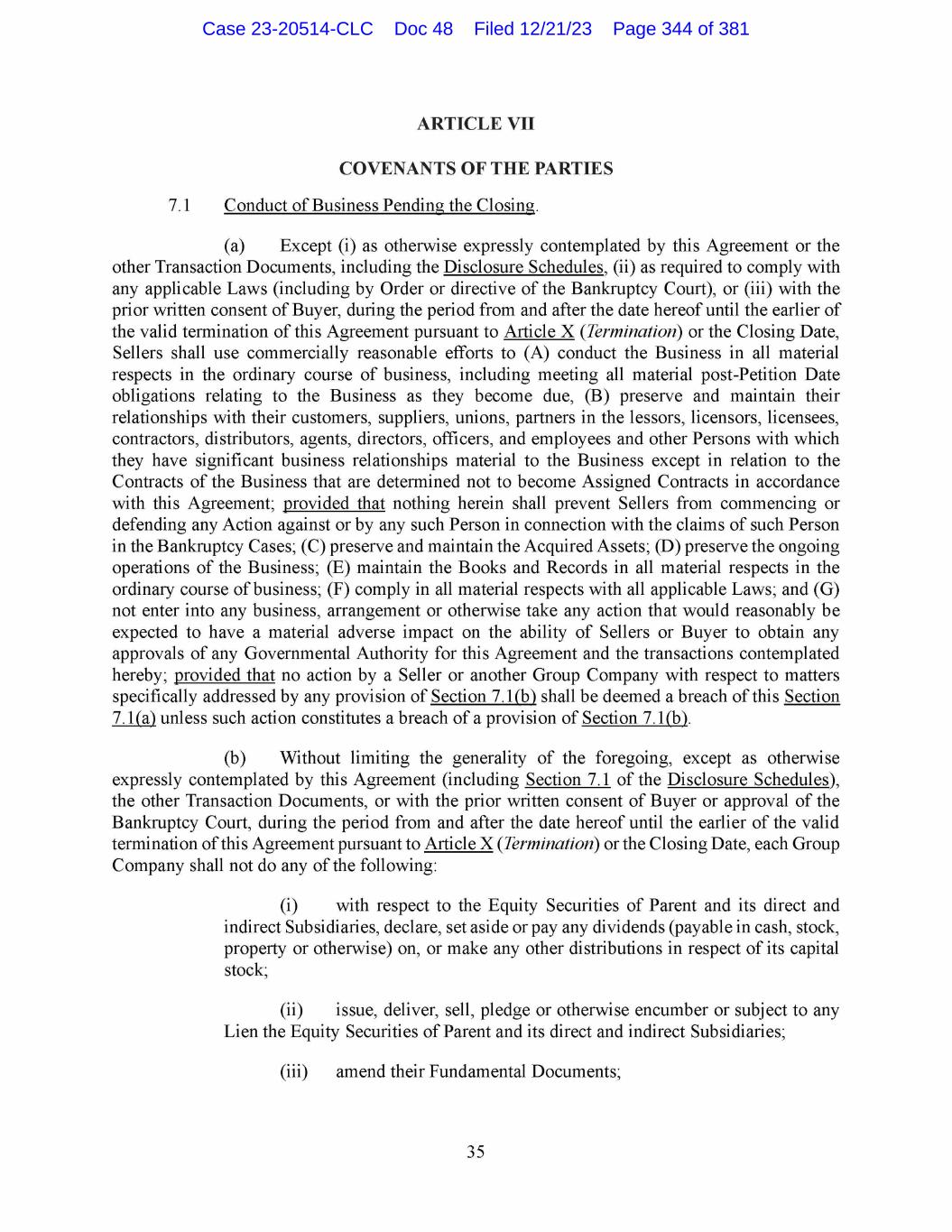 ARTICLE VII COVENANTS OF THE PARTIES 7.1 Conduct of Business Pending the Closing. (a) Except (i) as otherwise expressly contemplated by this Agreement or the other Transaction Documents, including the Disclosure Schedules, (ii) as required to comply with any applicable Laws (including by Order or directive of the Bankruptcy Court), or (iii) with the prior written consent of Buyer, during the period from and after the date hereof until the earlier of the valid termination of this Agreement pursuant to Article X (Termination') or the Closing Date, Sellers shall use commercially reasonable efforts to (A) conduct the Business in all material respects in the ordinary course of business, including meeting all material post-Petition Date obligations relating to the Business as they become due, (B) preserve and maintain their relationships with their customers, suppliers, unions, partners in the lessors, licensors, licensees, contractors, distributors, agents, directors, officers, and employees and other Persons with which they have significant business relationships material to the Business except in relation to the Contracts of the Business that are determined not to become Assigned Contracts in accordance with this Agreement; provided that nothing herein shall prevent Sellers from commencing or defending any Action against or by any such Person in connection with the claims of such Person in the Bankruptcy Cases; (C) preserve and maintain the Acquired Assets; (D) preserve the ongoing operations of the Business; (E) maintain the Books and Records in all material respects in the ordinary course of business; (F) comply in all material respects with all applicable Laws; and (G) not enter into any business, arrangement or otherwise take any action that would reasonably be expected to have a material adverse impact on the ability of Sellers or Buyer to obtain any approvals of any Governmental Authority for this Agreement and the transactions contemplated hereby; provided that no action by a Seller or another Group Company with respect to matters specifically addressed by any provision of Section 7.1(b) shall be deemed a breach of this Section 7.1(a) unless such action constitutes a breach of a provision of Section 7.1(b). (b) Without limiting the generality of the foregoing, except as otherwise expressly contemplated by this Agreement (including Section 7,1 of the Disclosure Schedules), the other Transaction Documents, or with the prior written consent of Buyer or approval of the Bankruptcy Court, during the period from and after the date hereof until the earlier of the valid termination of this Agreement pursuant to Article X (Termination) or the Closing Date, each Group Company shall not do any of the following: (i) with respect to the Equity Securities of Parent and its direct and indirect Subsidiaries, declare, set aside or pay any dividends (payable in cash, stock, property or otherwise) on, or make any other distributions in respect of its capital stock; (ii) issue, deliver, sell, pledge or otherwise encumber or subject to any Lien the Equity Securities of Parent and its direct and indirect Subsidiaries; (iii) amend their Fundamental Documents; 35 Case 23-20514-CLC Doc 48 Filed 12/21/23 Page 344 of 381