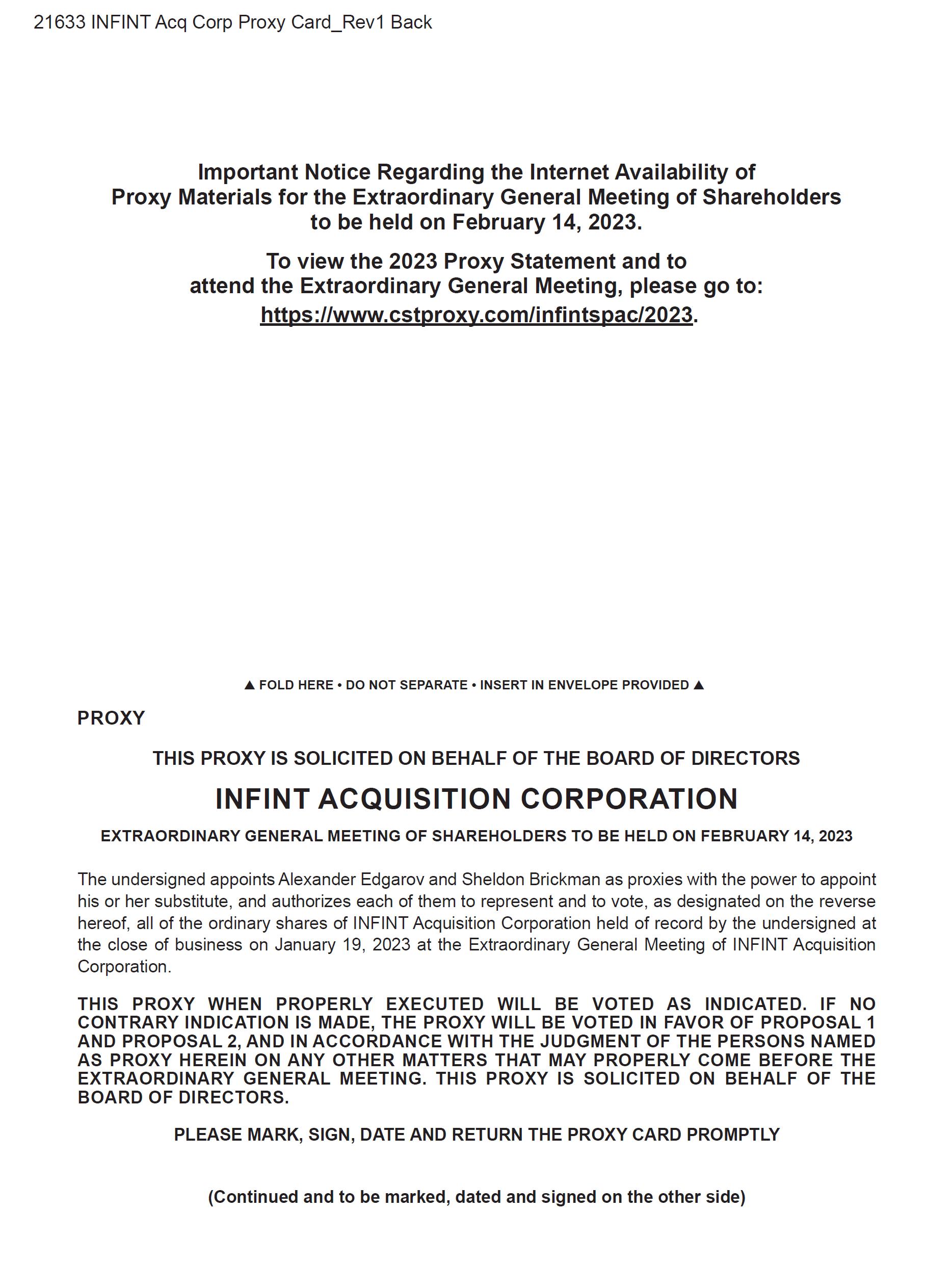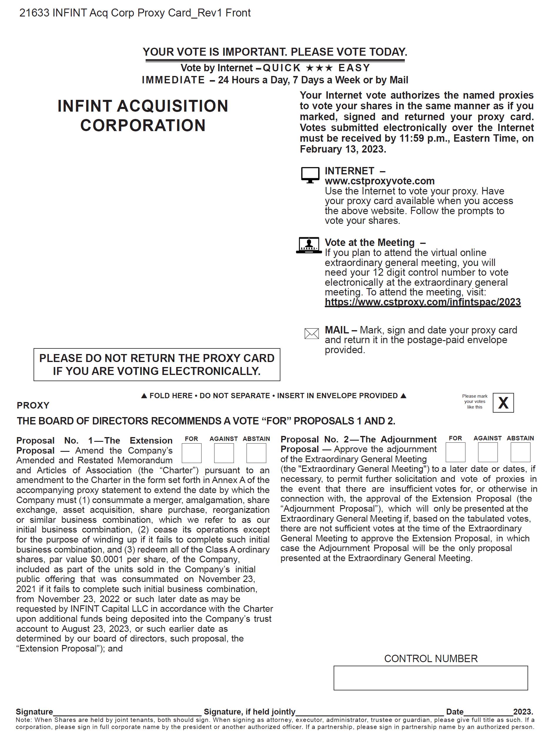 NOTICE IS HEREBY GIVEN that an Extraordinary General Meeting (the “Extraordinary General Meeting”) of shareholders of INFINT Acquisition Corporation, a Cayman Islands exempted company (the “Company”), will be held on February 14, 2023, at 10:00 a.m., Eastern Time, or at such other time, on such other date and at such other place to which the meeting may be postponed or adjourned. For purposes of the Company’s Amended and Restated Memorandum and Articles of Association (the “Charter”), the physical place of the Extraordinary General Meeting shall be at the offices of Greenberg Traurig, LLP, located at One Vanderbilt Avenue, New York, NY 10017, United States of America. You will be able to attend, vote your shares, and submit questions during the Extraordinary General Meeting via a live webcast available at https://www.cstproxy.com/infintspac/2023. The Extraordinary General Meeting will be held for the sole purpose of considering and voting upon the following proposals: