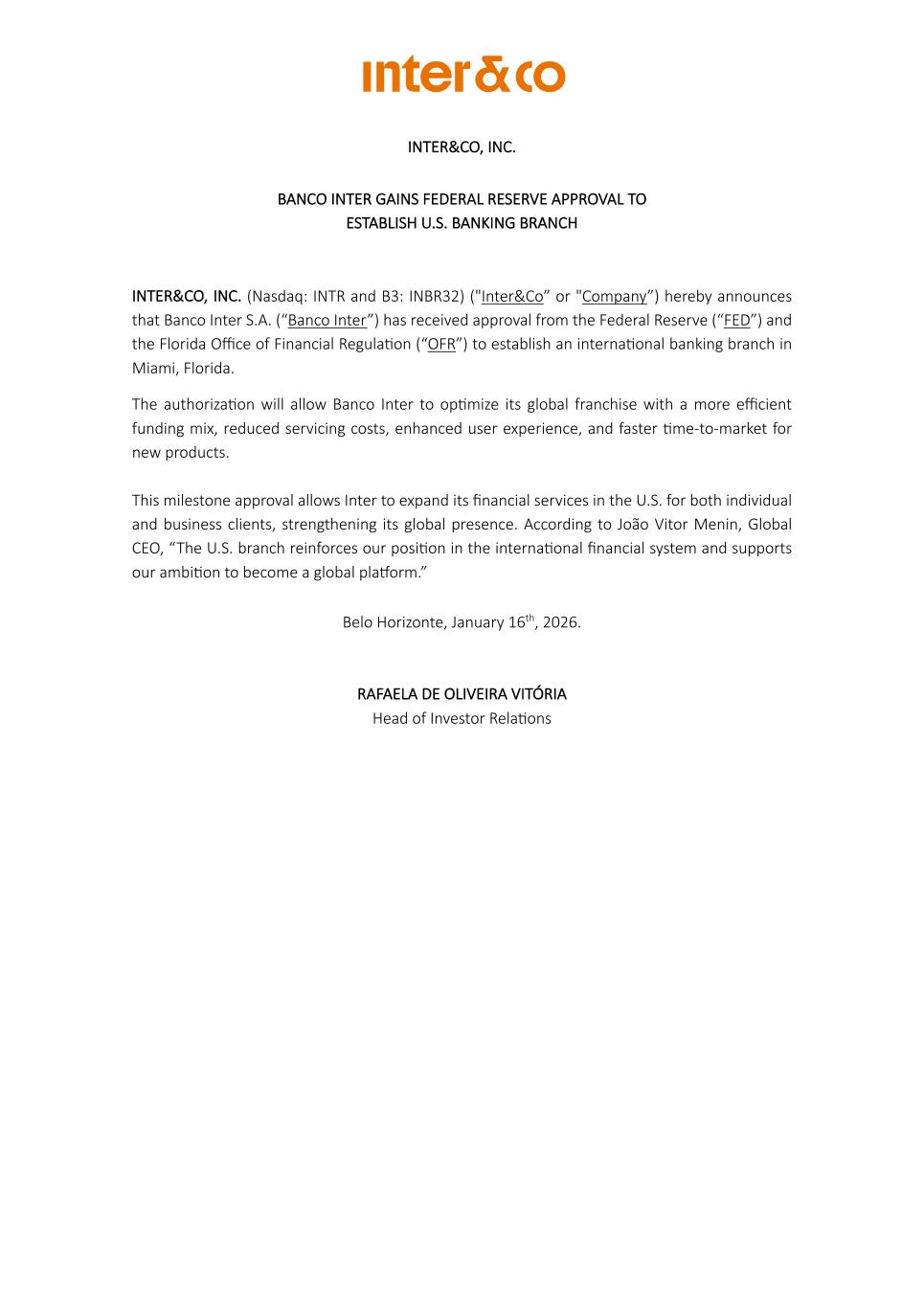 INTER&CO, INC. BANCO INTER GAINS FEDERAL RESERVE APPROVAL TO ESTABLISH U.S. BANKING BRANCH INTER&CO, INC. (Nasdaq: INTR and B3: INBR32) ("Inter&Co” or "Company”) hereby announces that Banco Inter S.A. (“Banco Inter”) has received approval from the Federal Reserve (“FED”) and the Florida Office of Financial RegulaVon (“OFR”) to establish an internaVonal banking branch in Miami, Florida. The authorizaVon will allow Banco Inter to opVmize its global franchise with a more efficient funding mix, reduced servicing costs, enhanced user experience, and faster Vme-to-market for new products. This milestone approval allows Inter to expand its financial services in the U.S. for both individual and business clients, strengthening its global presence. According to João Vitor Menin, Global CEO, “The U.S. branch reinforces our posiVon in the internaVonal financial system and supports our ambiVon to become a global pla`orm.” Belo Horizonte, January 16th, 2026. RAFAELA DE OLIVEIRA VITÓRIA Head of Investor RelaVons