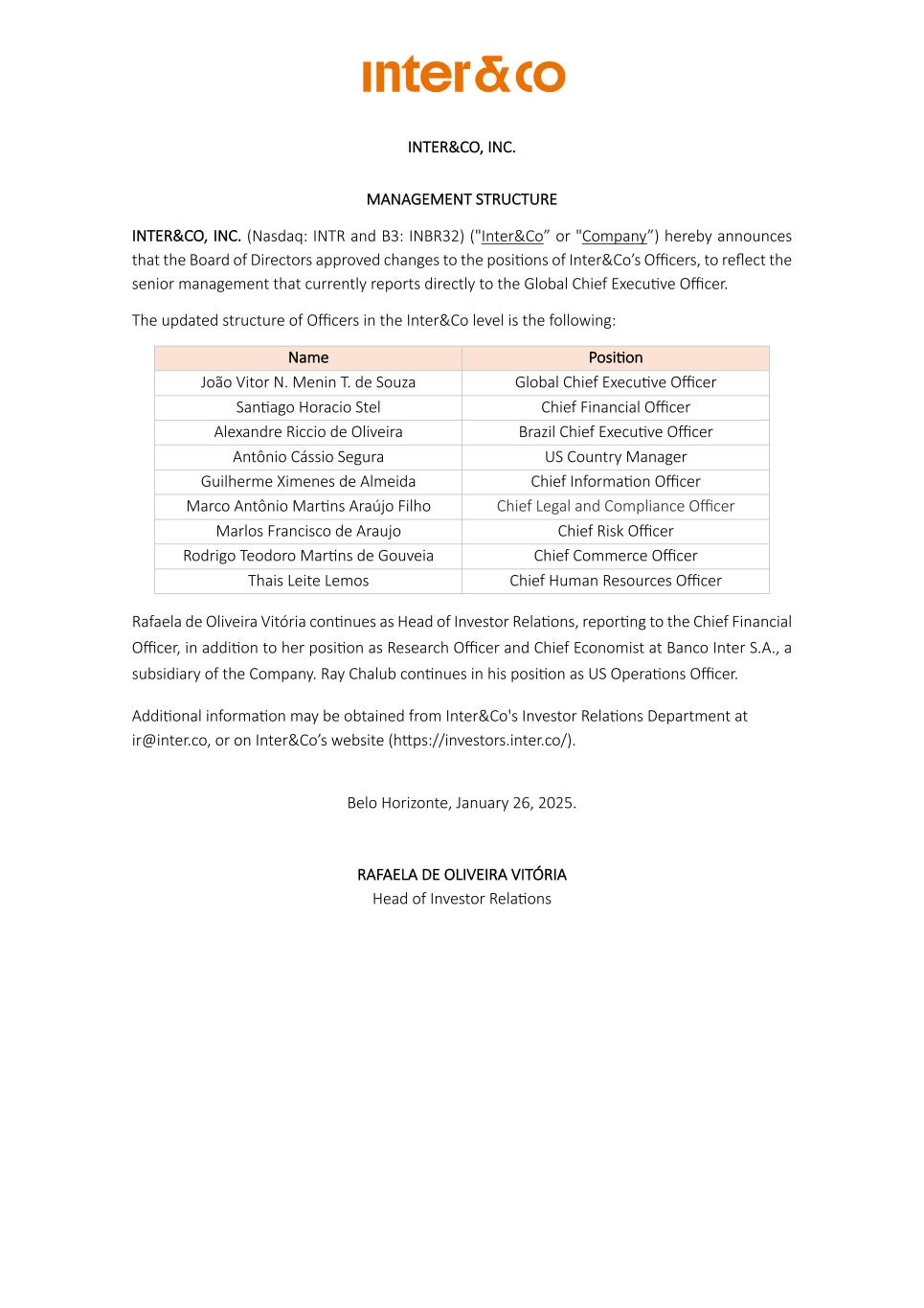 INTER&CO, INC. MANAGEMENT STRUCTURE INTER&CO, INC. (Nasdaq: INTR and B3: INBR32) ("Inter&Co” or "Company”) hereby announces that the Board of Directors approved changes to the posiNons of Inter&Co’s Officers, to reflect the senior management that currently reports directly to the Global Chief ExecuNve Officer. The updated structure of Officers in the Inter&Co level is the following: Name PosiNon João Vitor N. Menin T. de Souza Global Chief ExecuNve Officer SanNago Horacio Stel Chief Financial Officer Alexandre Riccio de Oliveira Brazil Chief ExecuNve Officer Antônio Cássio Segura US Country Manager Guilherme Ximenes de Almeida Chief InformaNon Officer Marco Antônio MarNns Araújo Filho Chief Legal and Compliance Officer Marlos Francisco de Araujo Chief Risk Officer Rodrigo Teodoro MarNns de Gouveia Chief Commerce Officer Thais Leite Lemos Chief Human Resources Officer Rafaela de Oliveira Vitória conNnues as Head of Investor RelaNons, reporNng to the Chief Financial Officer, in addiNon to her posiNon as Research Officer and Chief Economist at Banco Inter S.A., a subsidiary of the Company. Ray Chalub conNnues in his posiNon as US OperaNons Officer. AddiNonal informaNon may be obtained from Inter&Co's Investor RelaNons Department at ir@inter.co, or on Inter&Co’s website (hfps://investors.inter.co/). Belo Horizonte, January 26, 2025. RAFAELA DE OLIVEIRA VITÓRIA Head of Investor RelaNons