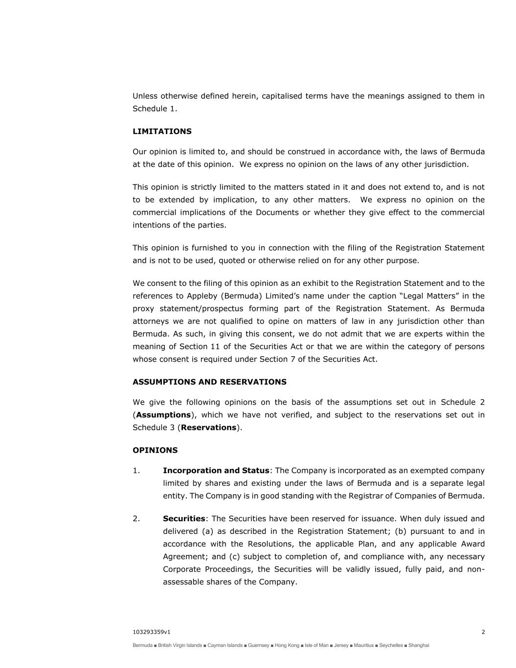 103293359v1 2 Bermuda ■ British Virgin Islands ■ Cayman Islands ■ Guernsey ■ Hong Kong ■ Isle of Man ■ Jersey ■ Mauritius ■ Seychelles ■ Shanghai Unless otherwise defined herein, capitalised terms have the meanings assigned to them in Schedule 1. LIMITATIONS Our opinion is limited to, and should be construed in accordance with, the laws of Bermuda at the date of this opinion. We express no opinion on the laws of any other jurisdiction. This opinion is strictly limited to the matters stated in it and does not extend to, and is not to be extended by implication, to any other matters. We express no opinion on the commercial implications of the Documents or whether they give effect to the commercial intentions of the parties. This opinion is furnished to you in connection with the filing of the Registration Statement and is not to be used, quoted or otherwise relied on for any other purpose. We consent to the filing of this opinion as an exhibit to the Registration Statement and to the references to Appleby (Bermuda) Limited’s name under the caption “Legal Matters” in the proxy statement/prospectus forming part of the Registration Statement. As Bermuda attorneys we are not qualified to opine on matters of law in any jurisdiction other than Bermuda. As such, in giving this consent, we do not admit that we are experts within the meaning of Section 11 of the Securities Act or that we are within the category of persons whose consent is required under Section 7 of the Securities Act. ASSUMPTIONS AND RESERVATIONS We give the following opinions on the basis of the assumptions set out in Schedule 2 (Assumptions), which we have not verified, and subject to the reservations set out in Schedule 3 (Reservations). OPINIONS 1. Incorporation and Status: The Company is incorporated as an exempted company limited by shares and existing under the laws of Bermuda and is a separate legal entity. The Company is in good standing with the Registrar of Companies of Bermuda. 2. Securities: The Securities have been reserved for issuance. When duly issued and delivered (a) as described in the Registration Statement; (b) pursuant to and in accordance with the Resolutions, the applicable Plan, and any applicable Award Agreement; and (c) subject to completion of, and compliance with, any necessary Corporate Proceedings, the Securities will be validly issued, fully paid, and non- assessable shares of the Company.