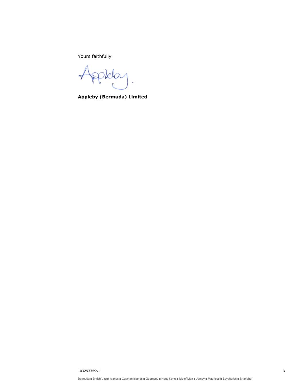 103293359v1 3 Bermuda ■ British Virgin Islands ■ Cayman Islands ■ Guernsey ■ Hong Kong ■ Isle of Man ■ Jersey ■ Mauritius ■ Seychelles ■ Shanghai Yours faithfully Appleby (Bermuda) Limited