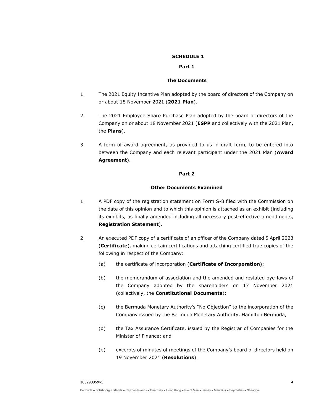 103293359v1 4 Bermuda ■ British Virgin Islands ■ Cayman Islands ■ Guernsey ■ Hong Kong ■ Isle of Man ■ Jersey ■ Mauritius ■ Seychelles ■ Shanghai SCHEDULE 1 Part 1 The Documents 1. The 2021 Equity Incentive Plan adopted by the board of directors of the Company on or about 18 November 2021 (2021 Plan). 2. The 2021 Employee Share Purchase Plan adopted by the board of directors of the Company on or about 18 November 2021 (ESPP and collectively with the 2021 Plan, the Plans). 3. A form of award agreement, as provided to us in draft form, to be entered into between the Company and each relevant participant under the 2021 Plan (Award Agreement). Part 2 Other Documents Examined 1. A PDF copy of the registration statement on Form S-8 filed with the Commission on the date of this opinion and to which this opinion is attached as an exhibit (including its exhibits, as finally amended including all necessary post-effective amendments, Registration Statement). 2. An executed PDF copy of a certificate of an officer of the Company dated 5 April 2023 (Certificate), making certain certifications and attaching certified true copies of the following in respect of the Company: (a) the certificate of incorporation (Certificate of Incorporation); (b) the memorandum of association and the amended and restated bye-laws of the Company adopted by the shareholders on 17 November 2021 (collectively, the Constitutional Documents); (c) the Bermuda Monetary Authority’s “No Objection” to the incorporation of the Company issued by the Bermuda Monetary Authority, Hamilton Bermuda; (d) the Tax Assurance Certificate, issued by the Registrar of Companies for the Minister of Finance; and (e) excerpts of minutes of meetings of the Company’s board of directors held on 19 November 2021 (Resolutions).