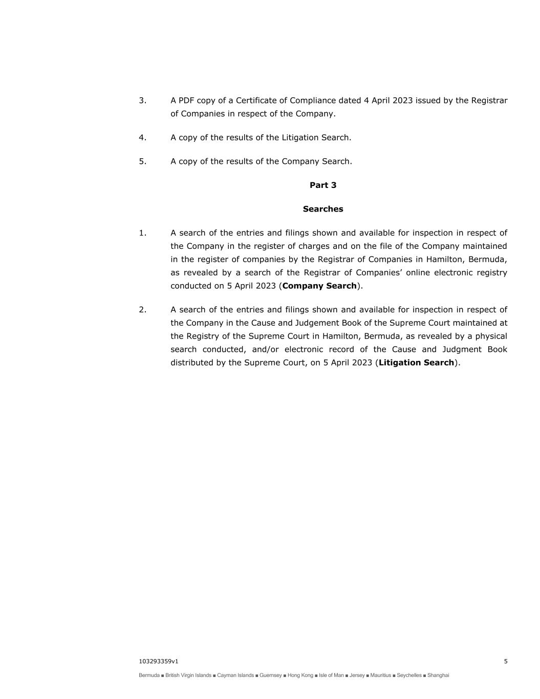 103293359v1 5 Bermuda ■ British Virgin Islands ■ Cayman Islands ■ Guernsey ■ Hong Kong ■ Isle of Man ■ Jersey ■ Mauritius ■ Seychelles ■ Shanghai 3. A PDF copy of a Certificate of Compliance dated 4 April 2023 issued by the Registrar of Companies in respect of the Company. 4. A copy of the results of the Litigation Search. 5. A copy of the results of the Company Search. Part 3 Searches 1. A search of the entries and filings shown and available for inspection in respect of the Company in the register of charges and on the file of the Company maintained in the register of companies by the Registrar of Companies in Hamilton, Bermuda, as revealed by a search of the Registrar of Companies’ online electronic registry conducted on 5 April 2023 (Company Search). 2. A search of the entries and filings shown and available for inspection in respect of the Company in the Cause and Judgement Book of the Supreme Court maintained at the Registry of the Supreme Court in Hamilton, Bermuda, as revealed by a physical search conducted, and/or electronic record of the Cause and Judgment Book distributed by the Supreme Court, on 5 April 2023 (Litigation Search).