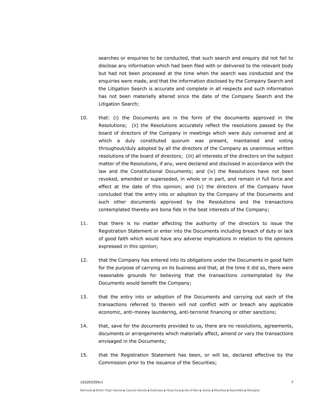 103293359v1 7 Bermuda ■ British Virgin Islands ■ Cayman Islands ■ Guernsey ■ Hong Kong ■ Isle of Man ■ Jersey ■ Mauritius ■ Seychelles ■ Shanghai searches or enquiries to be conducted, that such search and enquiry did not fail to disclose any information which had been filed with or delivered to the relevant body but had not been processed at the time when the search was conducted and the enquiries were made, and that the information disclosed by the Company Search and the Litigation Search is accurate and complete in all respects and such information has not been materially altered since the date of the Company Search and the Litigation Search; 10. that: (i) the Documents are in the form of the documents approved in the Resolutions; (ii) the Resolutions accurately reflect the resolutions passed by the board of directors of the Company in meetings which were duly convened and at which a duly constituted quorum was present, maintained and voting throughout/duly adopted by all the directors of the Company as unanimous written resolutions of the board of directors; (iii) all interests of the directors on the subject matter of the Resolutions, if any, were declared and disclosed in accordance with the law and the Constitutional Documents; and (iv) the Resolutions have not been revoked, amended or superseded, in whole or in part, and remain in full force and effect at the date of this opinion; and (v) the directors of the Company have concluded that the entry into or adoption by the Company of the Documents and such other documents approved by the Resolutions and the transactions contemplated thereby are bona fide in the best interests of the Company; 11. that there is no matter affecting the authority of the directors to issue the Registration Statement or enter into the Documents including breach of duty or lack of good faith which would have any adverse implications in relation to the opinions expressed in this opinion; 12. that the Company has entered into its obligations under the Documents in good faith for the purpose of carrying on its business and that, at the time it did so, there were reasonable grounds for believing that the transactions contemplated by the Documents would benefit the Company; 13. that the entry into or adoption of the Documents and carrying out each of the transactions referred to therein will not conflict with or breach any applicable economic, anti-money laundering, anti-terrorist financing or other sanctions; 14. that, save for the documents provided to us, there are no resolutions, agreements, documents or arrangements which materially affect, amend or vary the transactions envisaged in the Documents; 15. that the Registration Statement has been, or will be, declared effective by the Commission prior to the issuance of the Securities;