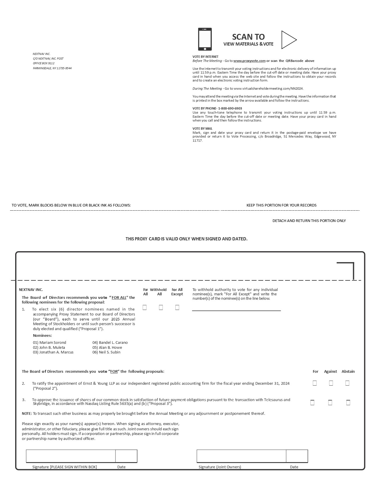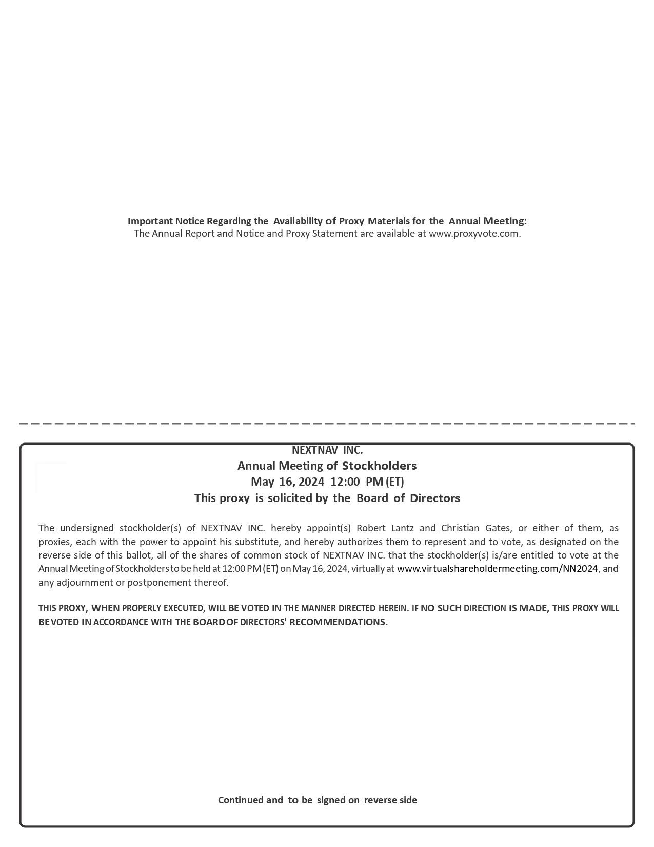 You are cordially invited to attend the Annual Meeting of Stockholders of NextNav Inc. (“NextNav” or the “Company”) to be held on Thursday, May 16, 2024, at 12:00 p.m. (Eastern Time) (the “Annual Meeting”). The Annual Meeting will be conducted as a virtual meeting this year, via live webcast online at www.virtualshareholdermeeting.com/NN2024.