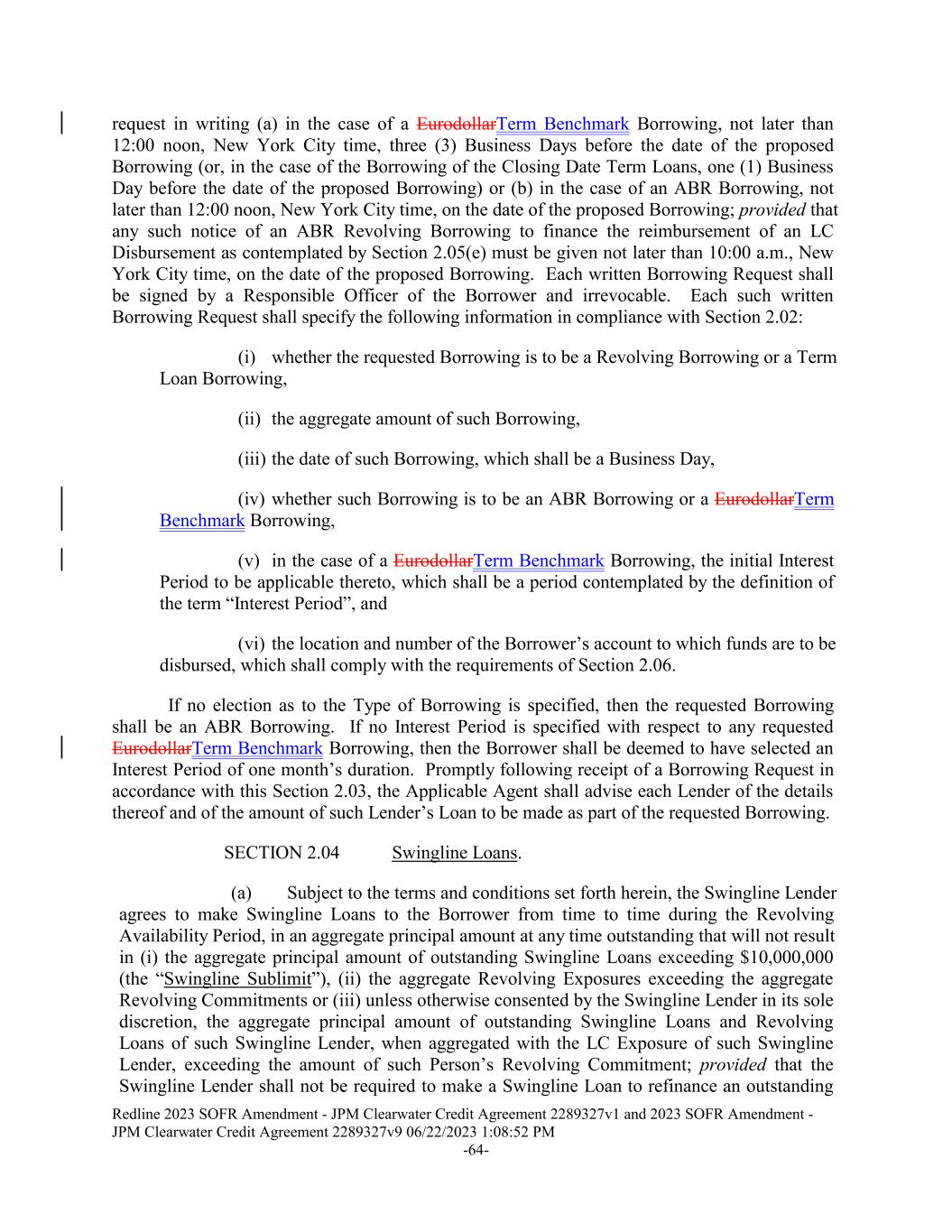 request in writing (a) in the case of a EurodollarTerm Benchmark Borrowing, not later than 12:00 noon, New York City time, three (3) Business Days before the date of the proposed Borrowing (or, in the case of the Borrowing of the Closing Date Term Loans, one (1) Business Day before the date of the proposed Borrowing) or (b) in the case of an ABR Borrowing, not later than 12:00 noon, New York City time, on the date of the proposed Borrowing; provided that any such notice of an ABR Revolving Borrowing to finance the reimbursement of an LC Disbursement as contemplated by Section 2.05(e) must be given not later than 10:00 a.m., New York City time, on the date of the proposed Borrowing. Each written Borrowing Request shall be signed by a Responsible Officer of the Borrower and irrevocable. Each such written Borrowing Request shall specify the following information in compliance with Section 2.02: (i) whether the requested Borrowing is to be a Revolving Borrowing or a Term Loan Borrowing, (ii) the aggregate amount of such Borrowing, (iii) the date of such Borrowing, which shall be a Business Day, (iv) whether such Borrowing is to be an ABR Borrowing or a EurodollarTerm Benchmark Borrowing, (v) in the case of a EurodollarTerm Benchmark Borrowing, the initial Interest Period to be applicable thereto, which shall be a period contemplated by the definition of the term “Interest Period”, and (vi) the location and number of the Borrower’s account to which funds are to be disbursed, which shall comply with the requirements of Section 2.06. If no election as to the Type of Borrowing is specified, then the requested Borrowing shall be an ABR Borrowing. If no Interest Period is specified with respect to any requested EurodollarTerm Benchmark Borrowing, then the Borrower shall be deemed to have selected an Interest Period of one month’s duration. Promptly following receipt of a Borrowing Request in accordance with this Section 2.03, the Applicable Agent shall advise each Lender of the details thereof and of the amount of such Lender’s Loan to be made as part of the requested Borrowing. SECTION 2.04 Swingline Loans. (a) Subject to the terms and conditions set forth herein, the Swingline Lender agrees to make Swingline Loans to the Borrower from time to time during the Revolving Availability Period, in an aggregate principal amount at any time outstanding that will not result in (i) the aggregate principal amount of outstanding Swingline Loans exceeding $10,000,000 (the “Swingline Sublimit”), (ii) the aggregate Revolving Exposures exceeding the aggregate Revolving Commitments or (iii) unless otherwise consented by the Swingline Lender in its sole discretion, the aggregate principal amount of outstanding Swingline Loans and Revolving Loans of such Swingline Lender, when aggregated with the LC Exposure of such Swingline Lender, exceeding the amount of such Person’s Revolving Commitment; provided that the Swingline Lender shall not be required to make a Swingline Loan to refinance an outstanding Redline 2023 SOFR Amendment - JPM Clearwater Credit Agreement 2289327v1 and 2023 SOFR Amendment - JPM Clearwater Credit Agreement 2289327v9 06/22/2023 1:08:52 PM -64-