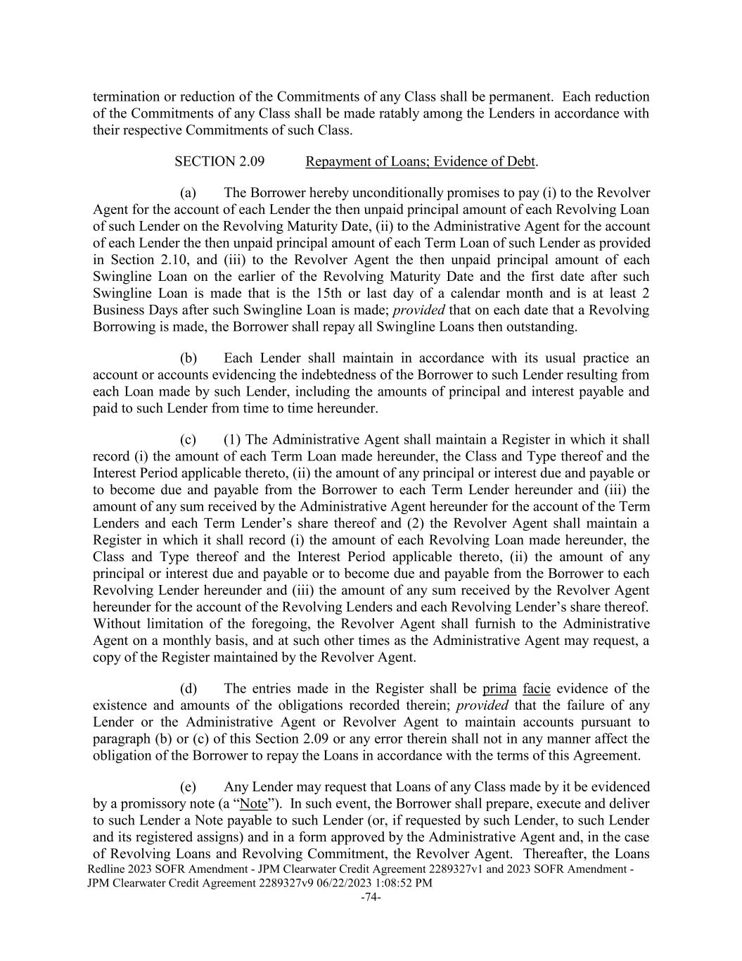 termination or reduction of the Commitments of any Class shall be permanent. Each reduction of the Commitments of any Class shall be made ratably among the Lenders in accordance with their respective Commitments of such Class. SECTION 2.09 Repayment of Loans; Evidence of Debt. (a) The Borrower hereby unconditionally promises to pay (i) to the Revolver Agent for the account of each Lender the then unpaid principal amount of each Revolving Loan of such Lender on the Revolving Maturity Date, (ii) to the Administrative Agent for the account of each Lender the then unpaid principal amount of each Term Loan of such Lender as provided in Section 2.10, and (iii) to the Revolver Agent the then unpaid principal amount of each Swingline Loan on the earlier of the Revolving Maturity Date and the first date after such Swingline Loan is made that is the 15th or last day of a calendar month and is at least 2 Business Days after such Swingline Loan is made; provided that on each date that a Revolving Borrowing is made, the Borrower shall repay all Swingline Loans then outstanding. (b) Each Lender shall maintain in accordance with its usual practice an account or accounts evidencing the indebtedness of the Borrower to such Lender resulting from each Loan made by such Lender, including the amounts of principal and interest payable and paid to such Lender from time to time hereunder. (c) (1) The Administrative Agent shall maintain a Register in which it shall record (i) the amount of each Term Loan made hereunder, the Class and Type thereof and the Interest Period applicable thereto, (ii) the amount of any principal or interest due and payable or to become due and payable from the Borrower to each Term Lender hereunder and (iii) the amount of any sum received by the Administrative Agent hereunder for the account of the Term Lenders and each Term Lender’s share thereof and (2) the Revolver Agent shall maintain a Register in which it shall record (i) the amount of each Revolving Loan made hereunder, the Class and Type thereof and the Interest Period applicable thereto, (ii) the amount of any principal or interest due and payable or to become due and payable from the Borrower to each Revolving Lender hereunder and (iii) the amount of any sum received by the Revolver Agent hereunder for the account of the Revolving Lenders and each Revolving Lender’s share thereof. Without limitation of the foregoing, the Revolver Agent shall furnish to the Administrative Agent on a monthly basis, and at such other times as the Administrative Agent may request, a copy of the Register maintained by the Revolver Agent. (d) The entries made in the Register shall be prima facie evidence of the existence and amounts of the obligations recorded therein; provided that the failure of any Lender or the Administrative Agent or Revolver Agent to maintain accounts pursuant to paragraph (b) or (c) of this Section 2.09 or any error therein shall not in any manner affect the obligation of the Borrower to repay the Loans in accordance with the terms of this Agreement. (e) Any Lender may request that Loans of any Class made by it be evidenced by a promissory note (a “Note”). In such event, the Borrower shall prepare, execute and deliver to such Lender a Note payable to such Lender (or, if requested by such Lender, to such Lender and its registered assigns) and in a form approved by the Administrative Agent and, in the case of Revolving Loans and Revolving Commitment, the Revolver Agent. Thereafter, the Loans Redline 2023 SOFR Amendment - JPM Clearwater Credit Agreement 2289327v1 and 2023 SOFR Amendment - JPM Clearwater Credit Agreement 2289327v9 06/22/2023 1:08:52 PM -74-