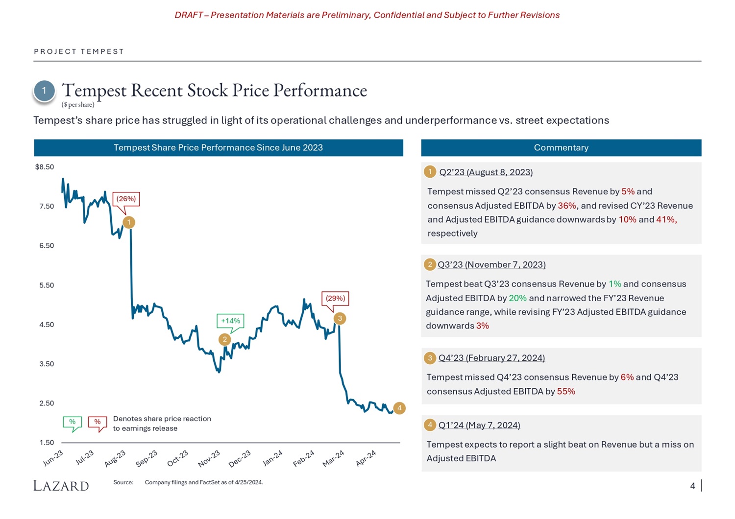 DRAFT – Presentation Materials are Preliminary, Confidential and Subject to Further Revisions 3 Q4’23 (February 27, 2024) Tempest missed Q4’23 consensus Revenue by 6% and Q4’23 consensus Adjusted EBITDA by 55% Tempest Recent Stock Price Performance P R O J E C T T E M P E S T Source: Company filings and FactSet as of 4/25/2024. Tempest Share Price Performance Since June 2023 1.50 2.50 3.50 4.50 5.50 6.50 7.50 $8.50 1 2 % % Denotes share price reaction to earnings release (29%) (26%) +14% 3 Q2’23 (August 8, 2023) Tempest missed Q2’23 consensus Revenue by 5% and consensus Adjusted EBITDA by 36% , and revised CY’23 Revenue and Adjusted EBITDA guidance downwards by 10% and 41%, respectively 2 Q3’23 (November 7, 2023) Tempest beat Q3’23 consensus Revenue by 1% and consensus Adjusted EBITDA by 20% and narrowed the FY’23 Revenue guidance range, while revising FY’23 Adjusted EBITDA guidance downwards 3% Commentary 1 1 ($ per share) Tempest’s share price has struggled in light of its operational challenges and underperformance vs. street expectations 4 Q1’24 (May 7, 2024) Tempest expects to report a slight beat on Revenue but a miss on Adjusted EBITDA 4 4