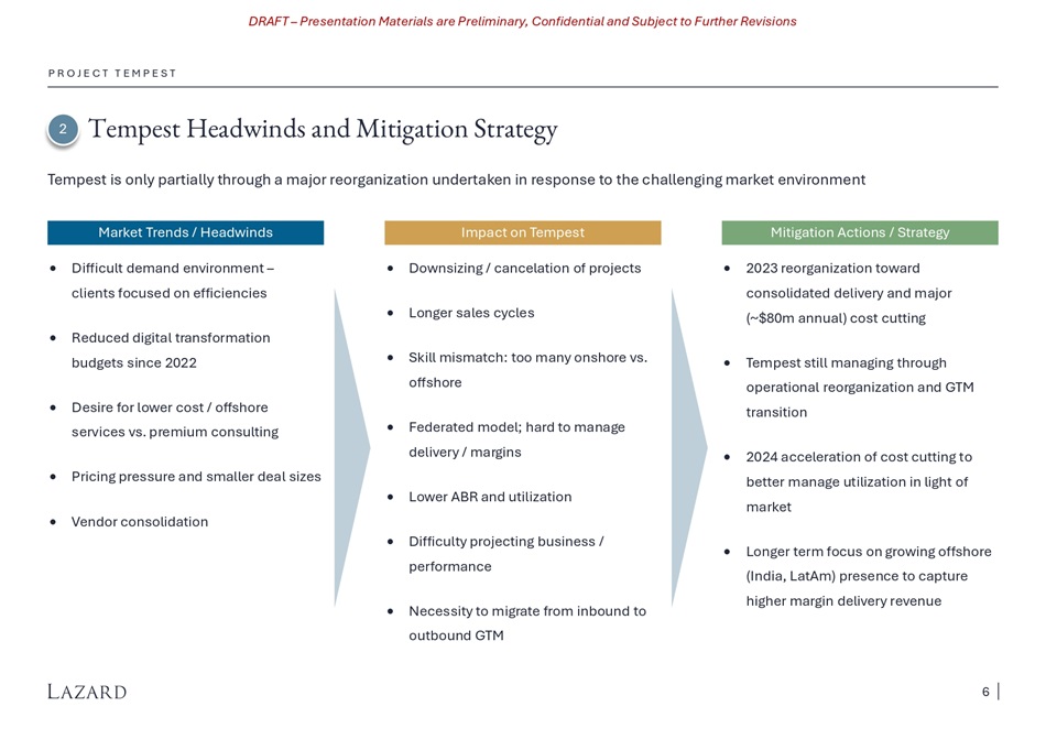 DRAFT – Presentation Materials are Preliminary, Confidential and Subject to Further Revisions P R O J E C T T E M P E S T Tempest Recent Financial Performance 1 ($ in millions) Due to recent performance, 2024 estimates have deteriorated and are now materially below expectations for peers CY’24E Revenue Growth Consensus 15% 12% (12%) 3% 2% 6% 6/13/23 4/25/24 21% 19% 18% 8% Tempest 19% Diversified IT 19% Services Digital IT Services 6/13/23 4/25/24 CY’24E Adjusted EBITDA Margin Consensus Digital IT Services Diversified IT Services Tempest Revenue Adjusted EBITDA $307 $287 $280 $252 $249 (7%) (15%) (17%) (20%) (19%) Q1'23A Q2'23A Q3'23A Q4'23A Q1'24A $35 $29 $34 $14 $6 11% 10% 12% 5% 3% Q1'23A Q2'23A Q3'23A Q4'23A Q1'24A Source: Note: Tempest Management and FactSet as of 4/25/2024. Tempest metrics based on Tempest Management Plan. Tempest Adjusted EBITDA excludes stock - based compensation, associated payroll taxes and non - recurring items. Peer comparable company EBITDA figures shown are Adjusted EBITDA presented on a like - for - like basis excluding stock - based compensation. Organic revenue growth figures are shown where available. Y/Y Organic Growth (%) Margin (%) 5