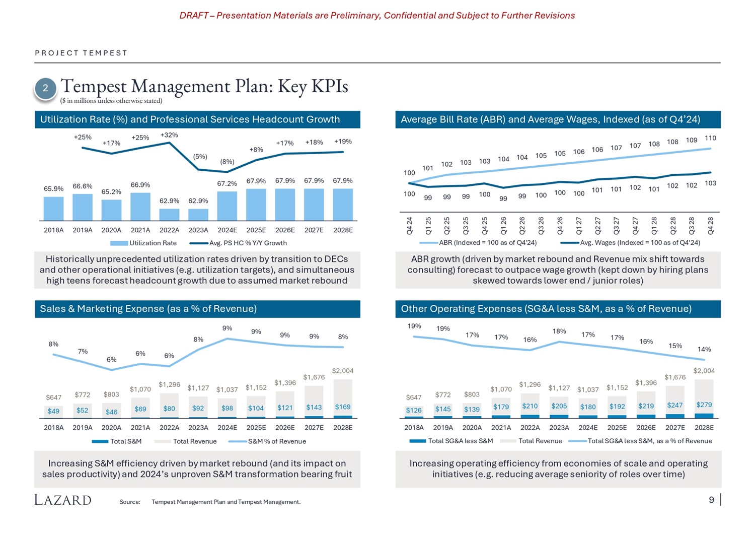 DRAFT – Presentation Materials are Preliminary, Confidential and Subject to Further Revisions P R O J E C T T E M P E S T 2 Tempest Management Plan: Key KPIs ($ in millions unless otherwise stated) Utilization Rate (%) and Professional Services Headcount Growth Average Bill Rate (ABR) and Average Wages, Indexed (as of Q4’24) Sales C Marketing Expense (as a % of Revenue) Other Operating Expenses (SGCA less SCM, as a % of Revenue) Historically unprecedented utilization rates driven by transition to DECs and other operational initiatives (e.g. utilization targets), and simultaneous high teens forecast headcount growth due to assumed market rebound ABR growth (driven by market rebound and Revenue mix shift towards consulting) forecast to outpace wage growth (kept down by hiring plans skewed towards lower end / junior roles) 100 101 102 103 103 104 104 105 105 106 106 107 107 108 108 109 110 100 99 99 99 100 99 99 100 100 100 101 101 102 101 102 102 103 Q4 24 Q1 25 Q2 25 Q3 25 Q4 25 Q1 26 Q2 26 Q3 26 Q4 26 Q1 27 Q2 27 Q3 27 Q4 27 Q1 28 Q2 28 Q3 28 Q4 28 ABR (Indexed = 100 as of Q4'24) Avg. Wages (Indexed = 100 as of Q4'24) $49 $52 $46 $69 $80 $92 $98 $104 $121 $143 $169 $647 $772 $803 $1,070 $1,296 $1,127 $1,037 $1,152 $1,396 $1,676 $2,004 8% 7% 6% 6% 6% 8% 9% 9% 9% 9% 8% 2018A 2019A 2020A 2021A 2022A 2023A Total SCM Total Revenue 2024E 2025E 2026E 2027E 2028E SCM % of Revenue $126 $145 $139 $179 $210 $205 $180 $192 $219 $247 $279 $647 $772 $803 $1,070 $1,296 $1,127 $1,037 $1,152 $1,396 $1,676 $2,004 19% 19% 17% 17% 16% 18% 17% 17% 16% 15% 14% 2018A 2019A 2020A 2021A Total SGCA less SCM 2022A 2023A 2024E 2025E 2026E 2027E 2028E Total Revenue Total SGCA less SCM, as a % of Revenue Increasing SCM efficiency driven by market rebound (and its impact on sales productivity) and 2024’s unproven SCM transformation bearing fruit Increasing operating efficiency from economies of scale and operating initiatives (e.g. reducing average seniority of roles over time) Source: Tempest Management Plan and Tempest Management. 65.9% 66.6% 65.2% 66.9% 62.9% 62.9% 67.2% 67.9% 67.9% 67.9% 67.9% +25% +25% +32% (5%) (8%) +8% +17% +17% +18% +19% 2018A 2019A 2020A 2021A 2022A 2023A Utilization Rate 2024E 2025E 2026E 2027E 2028E Avg. PS HC % Y/Y Growth 9