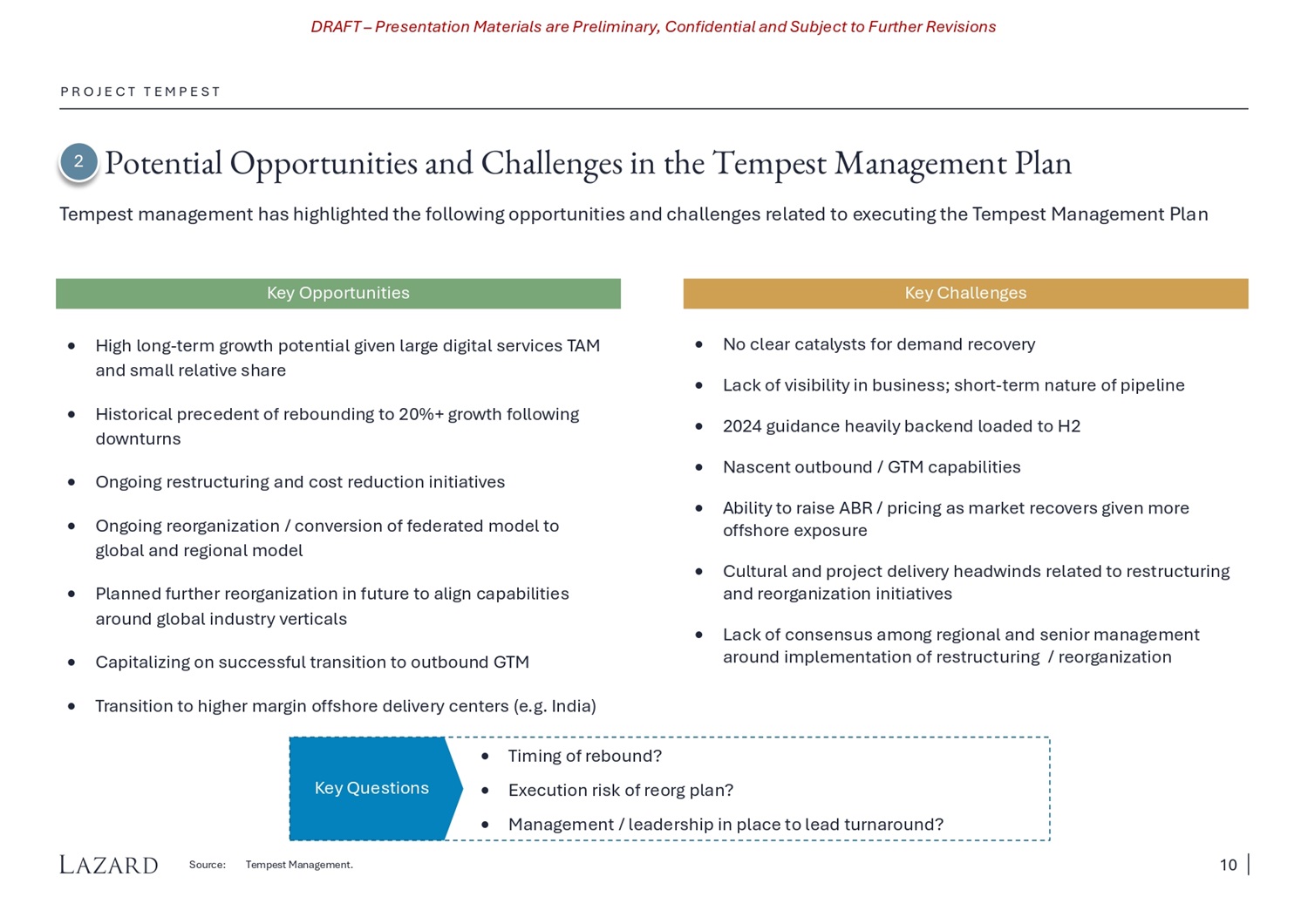 DRAFT – Presentation Materials are Preliminary, Confidential and Subject to Further Revisions Potential Opportunities and Challenges in the Tempest Management Plan P R O J E C T T E M P E S T Tempest management has highlighted the following opportunities and challenges related to executing the Tempest Management Plan Key Opportunities Key Challenges High long - term growth potential given large digital services TAM and small relative share Historical precedent of rebounding to 20%+ growth following downturns Ongoing restructuring and cost reduction initiatives Ongoing reorganization / conversion of federated model to global and regional model Planned further reorganization in future to align capabilities around global industry verticals Capitalizing on successful transition to outbound GTM Transition to higher margin offshore delivery centers (e.g. India) No clear catalysts for demand recovery Lack of visibility in business; short - term nature of pipeline 2024 guidance heavily backend loaded to H2 Nascent outbound / GTM capabilities Ability to raise ABR / pricing as market recovers given more offshore exposure Cultural and project delivery headwinds related to restructuring and reorganization initiatives Lack of consensus among regional and senior management around implementation of restructuring / reorganization Source: Tempest Management. 2 Key Questions Timing of rebound? Execution risk of reorg plan? Management / leadership in place to lead turnaround? 10